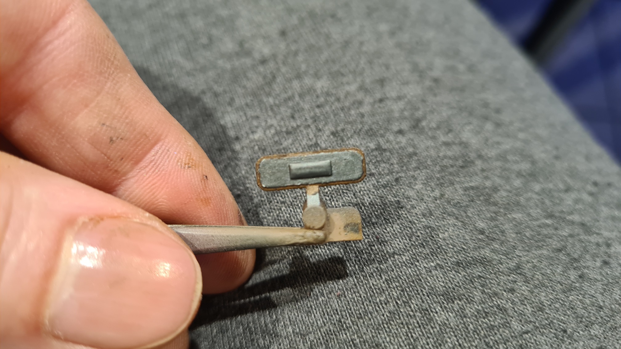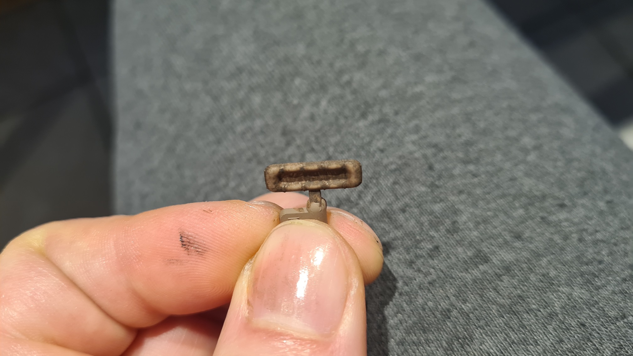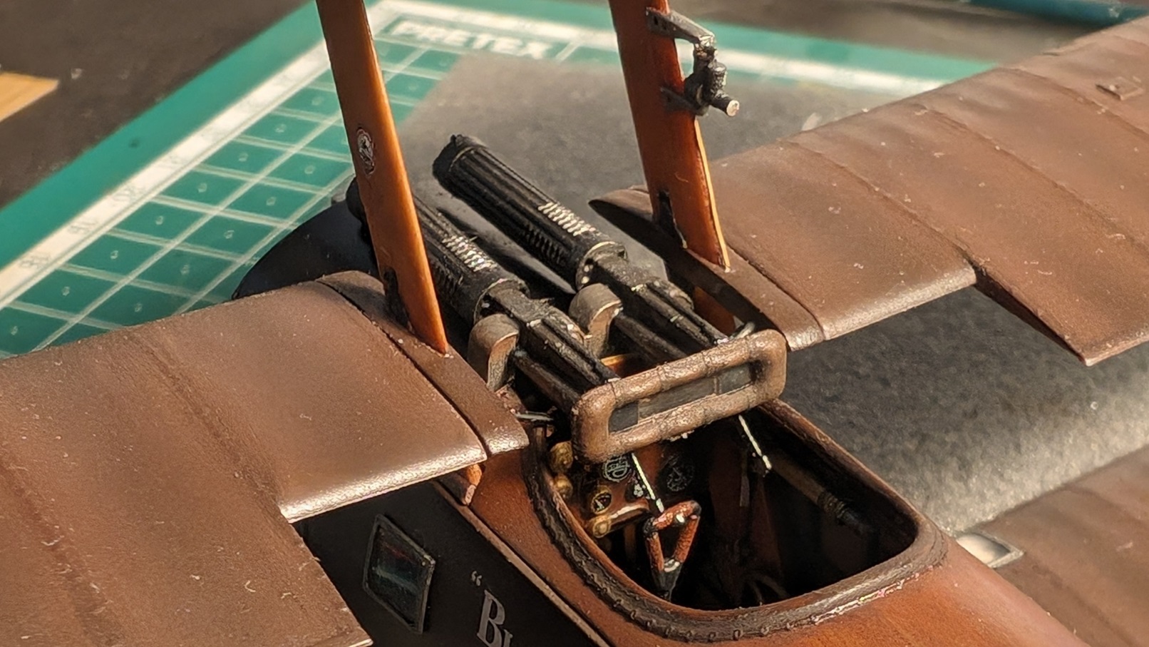 Als nächstes vielleicht die Scheibe hinter/zwischen den MGs. Mit Leder ummantelt. Das Ganze ist ein Klarsichtteil, daher sehr unangenehm in der Verarbeitung.
