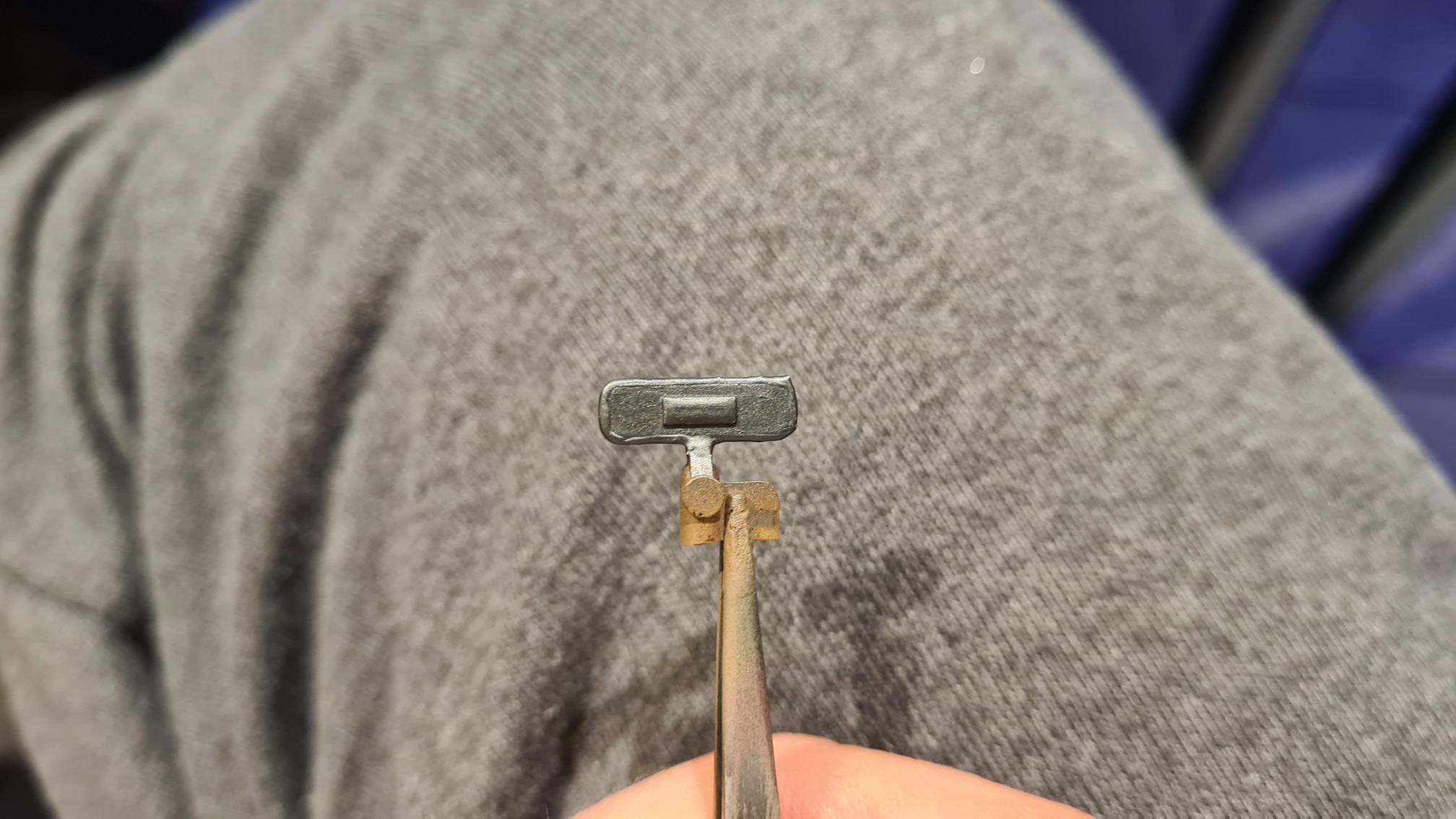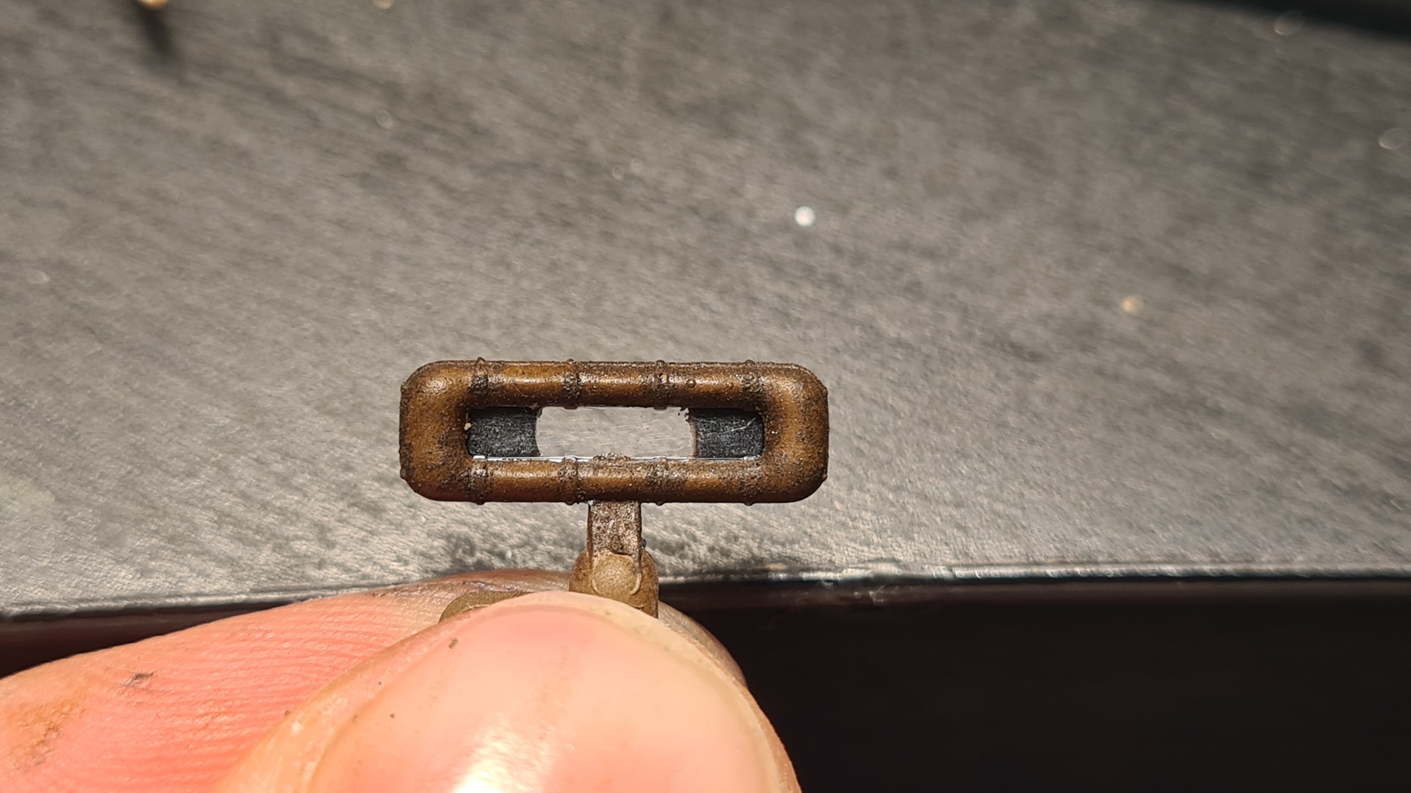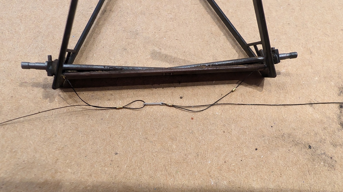 Vielleicht noch kurz zum Fahrgestell. Das ist hier etwas fragiler gebaut. Und es müssen diverse Verspannungen angebracht werden. Eine (tatsächlich kein Metallband) verläuft horizontal vor der Achse und enthält ein "klassisches" Spannschloss. Ich hab ein Gaspatch-Überbleibsel in 1:48 genommen. Problem ist nur, dass Spannschloss beim Montieren in die Mitte zu bekommen.
