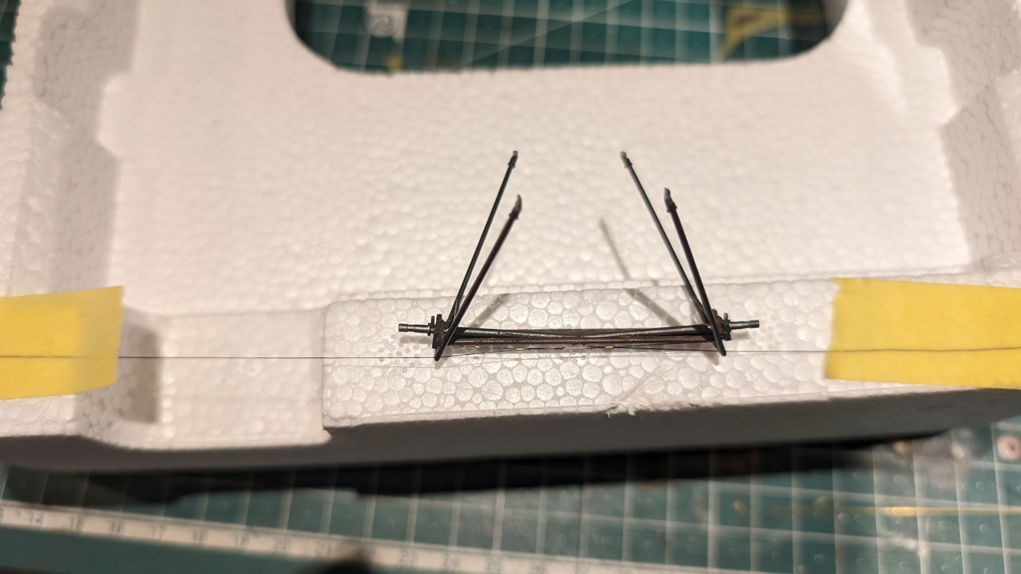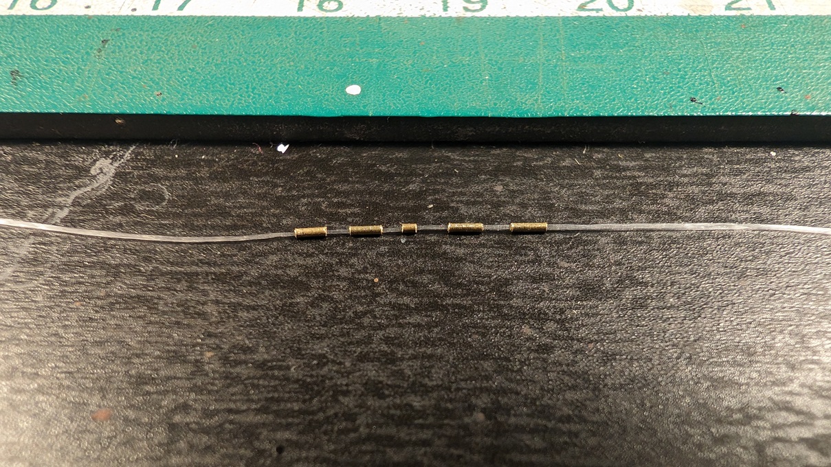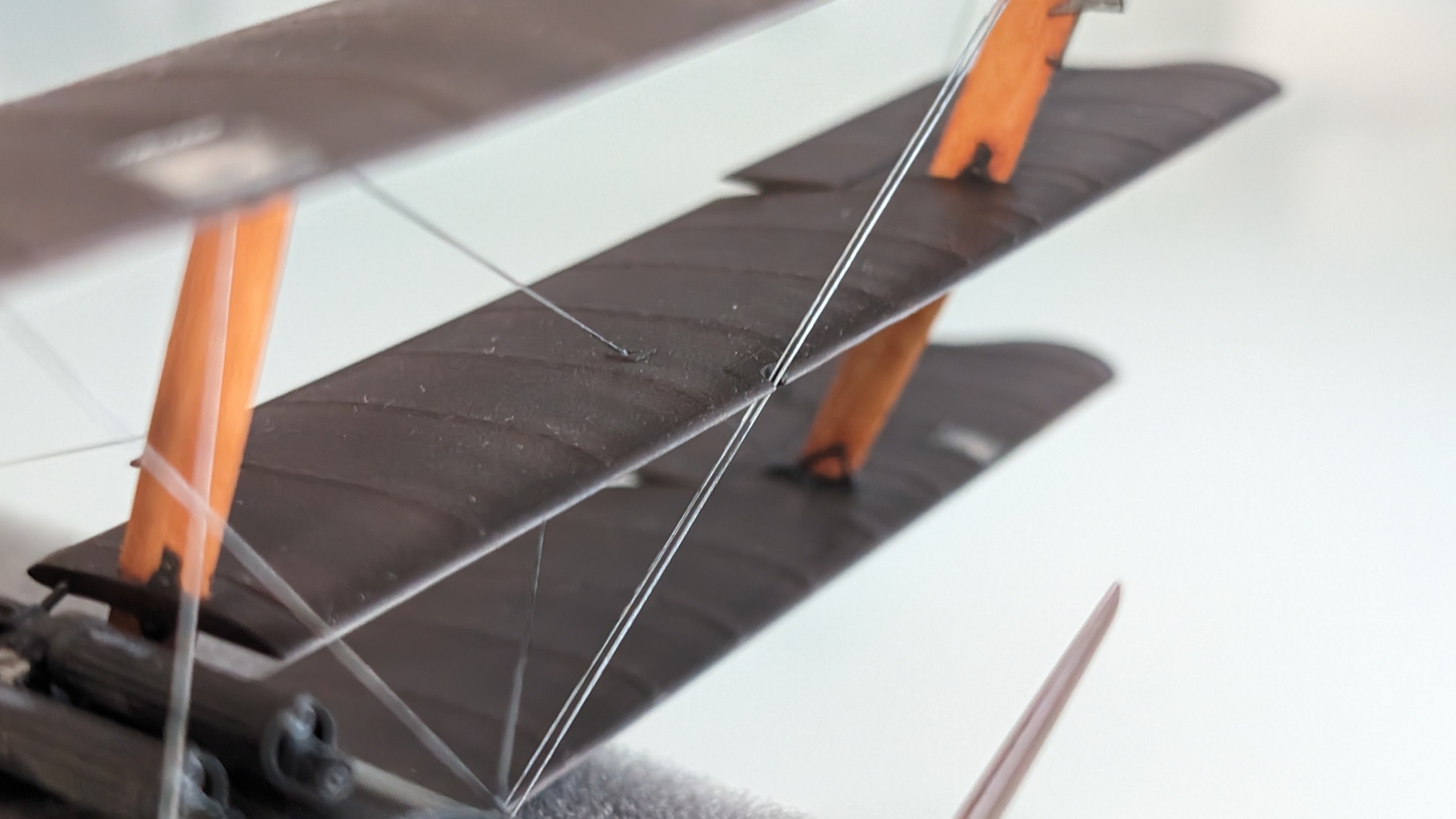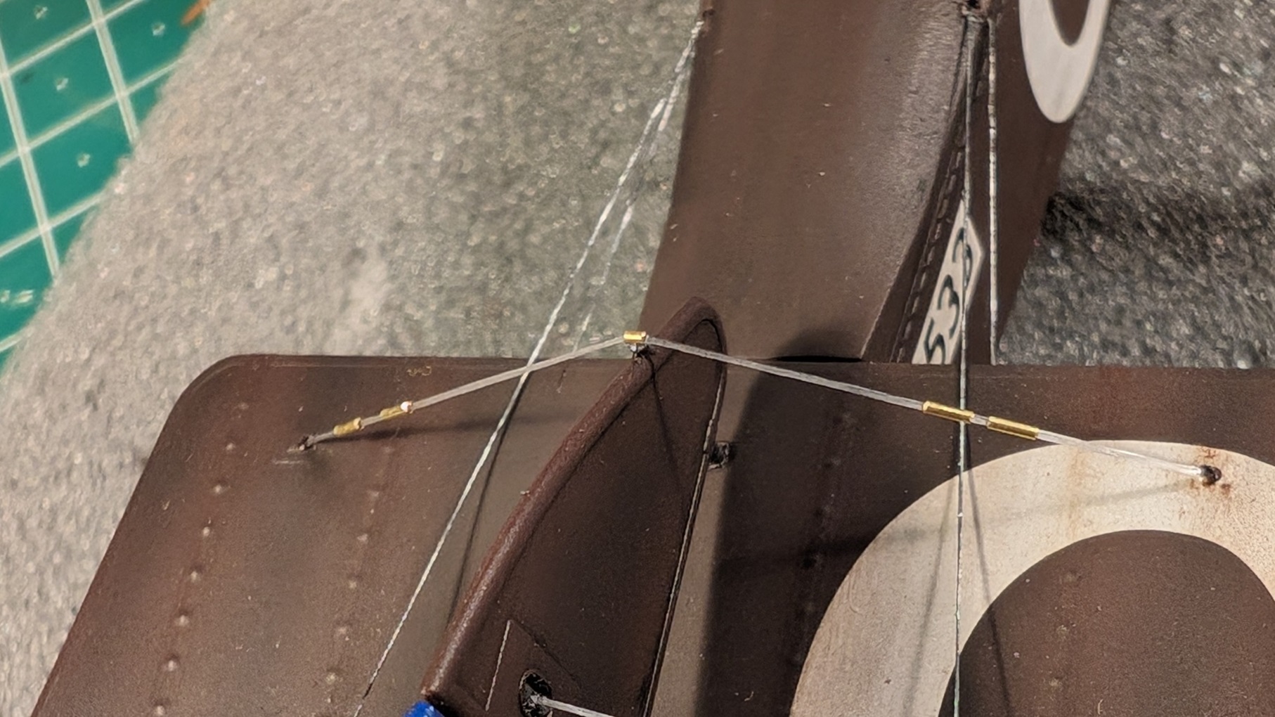 Dann ging es an die Außenverspannung. Hier gibt es 2 verschiedene Spannseiltypen. Das hatte ich damals bei der AMC DH.2 leider ignoriert. Im Grunde ist es so, dass alle Steuerseile für die Ruder einen "normalen" runden Querschnitt haben, wohingegen die Verspannungen für die Stabilität Blechbänder waren. Schaut es euch gerne nochmal in Aktvetos' Link zum Original an. Diesmal also etwas genauer. Für die Darstellung der Blechbänder wurde elastischer Prym-Faden genommen. Bekommt man problemlos bei amazon. Der Faden ist flach. Dieser hier: