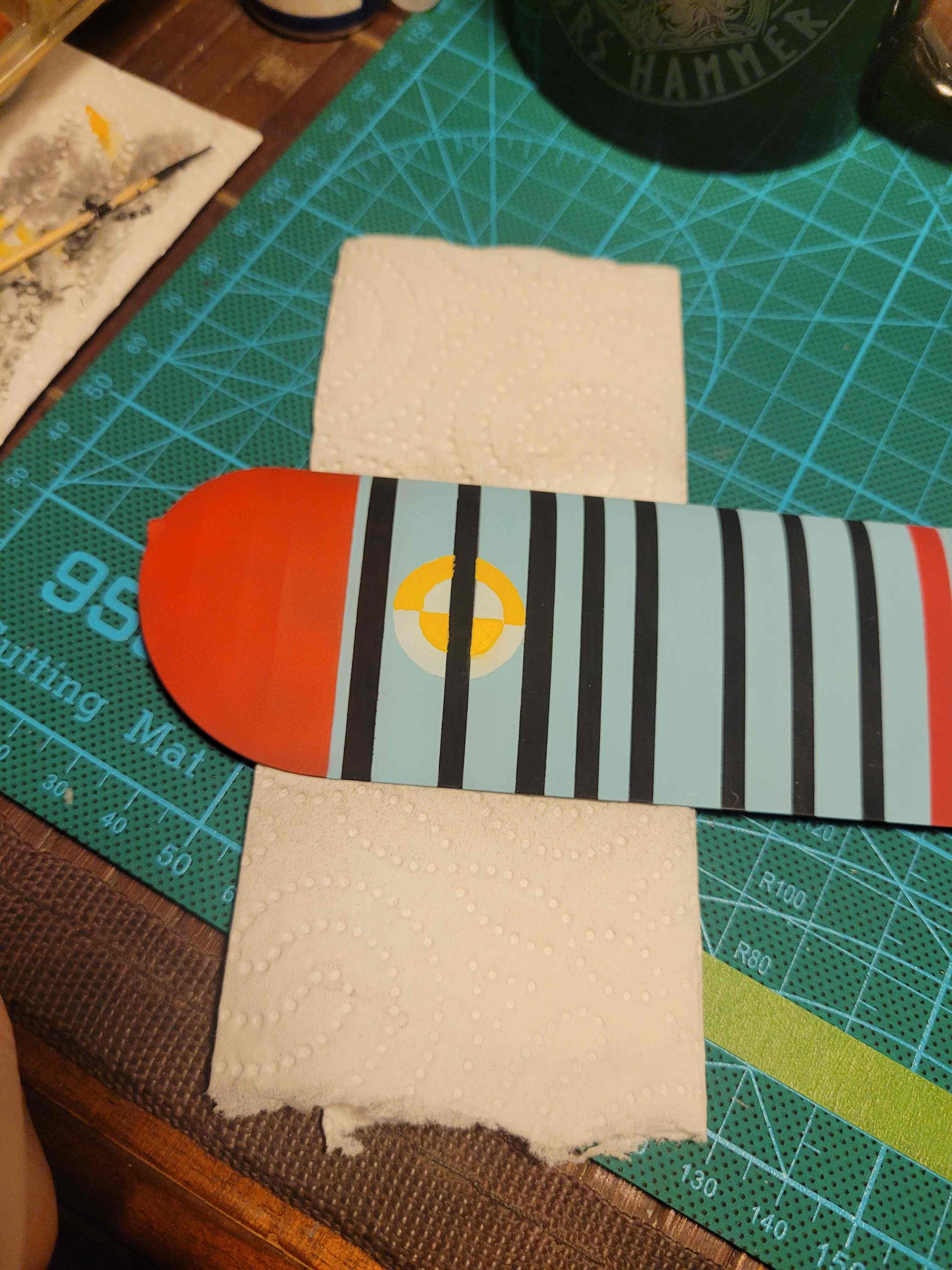 Seit dem letzten Update ging es munter weiter mit der oberen Tragfläche...grundieren, maskieren, kolorieren...ummaskieren, nochmal kolorieren. :lol: