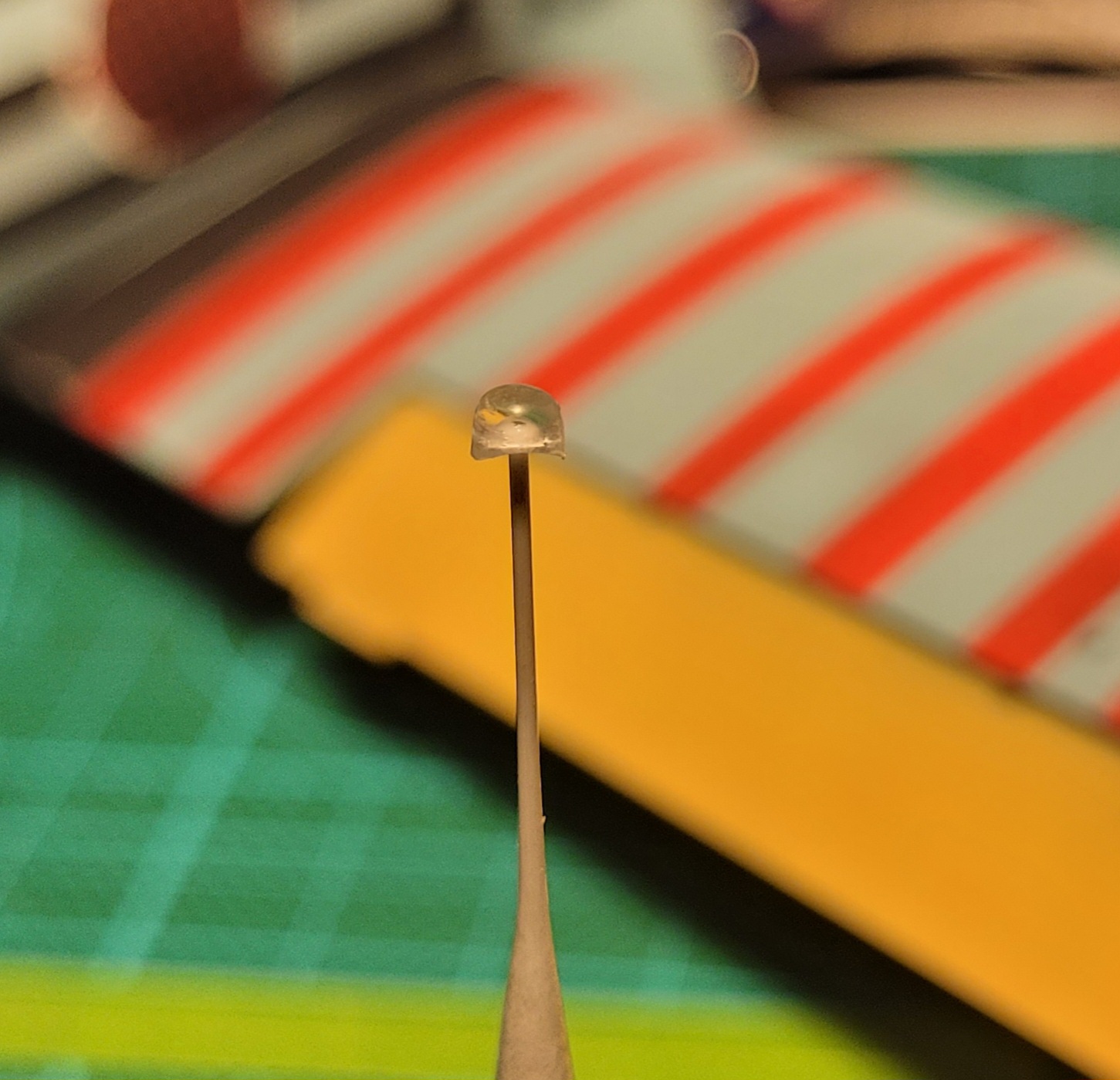 Während die Tragflächen dann nach ner Klarlackdusche trocknen durften, hab ich aus einem Stück transparentem Gussast die Rundumleuchte auf dem Rücken des Fliegers gebastelt. (die war nämlich nicht Standard).