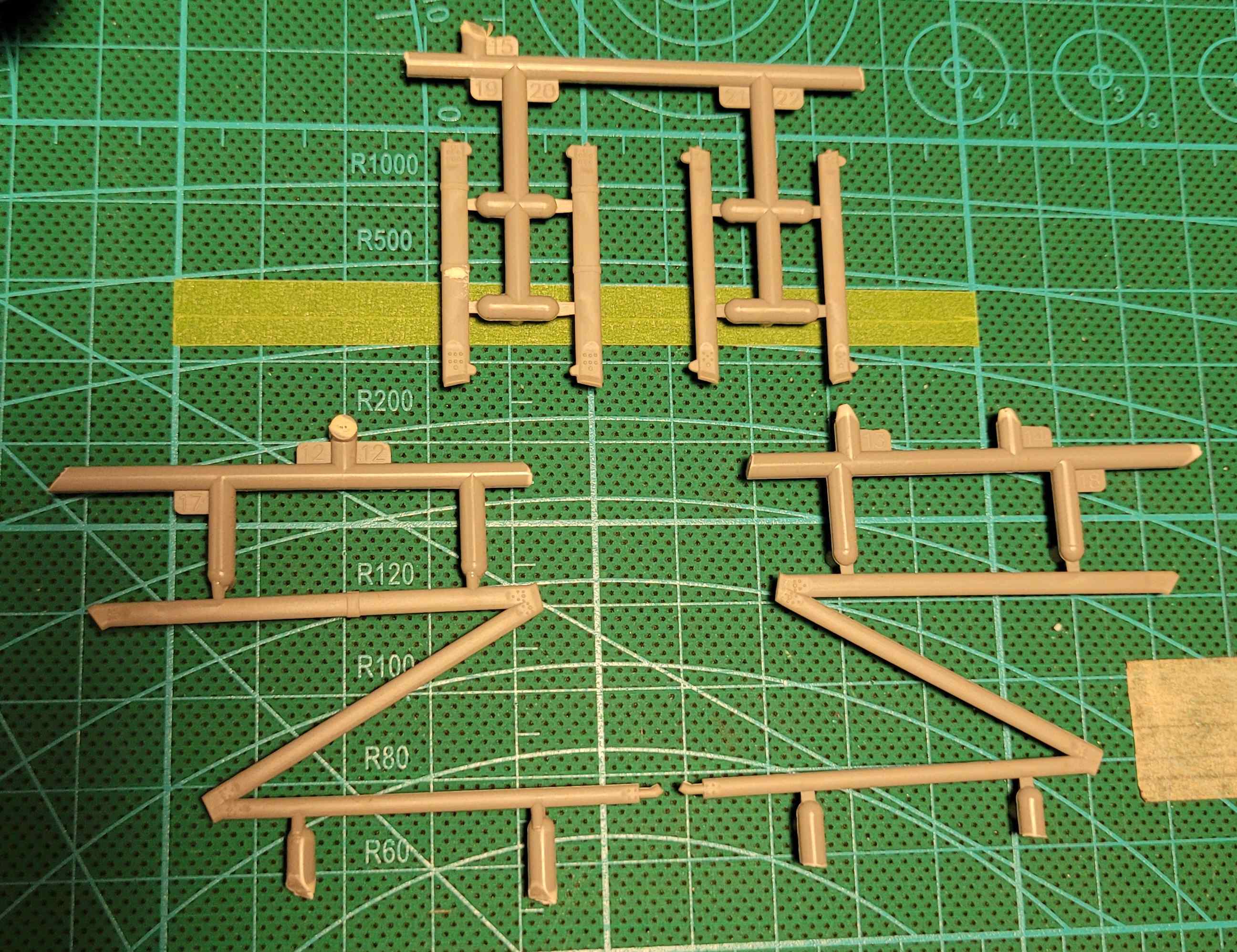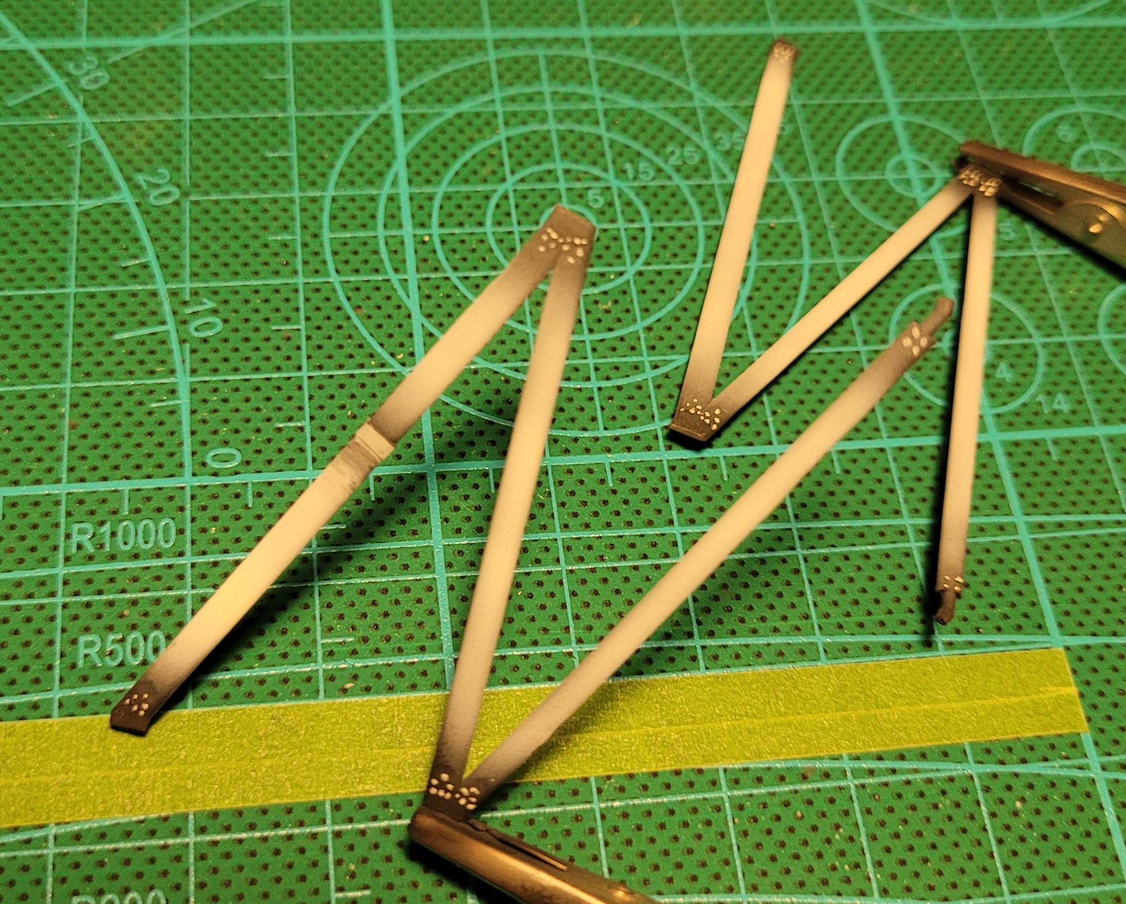 Danach hab ich mich endlich den Tragflächenstreben gewidmet. Hab das lange vor mir her geschoben, weil ich Teile mit solchen Angüssen nahezu hasse: