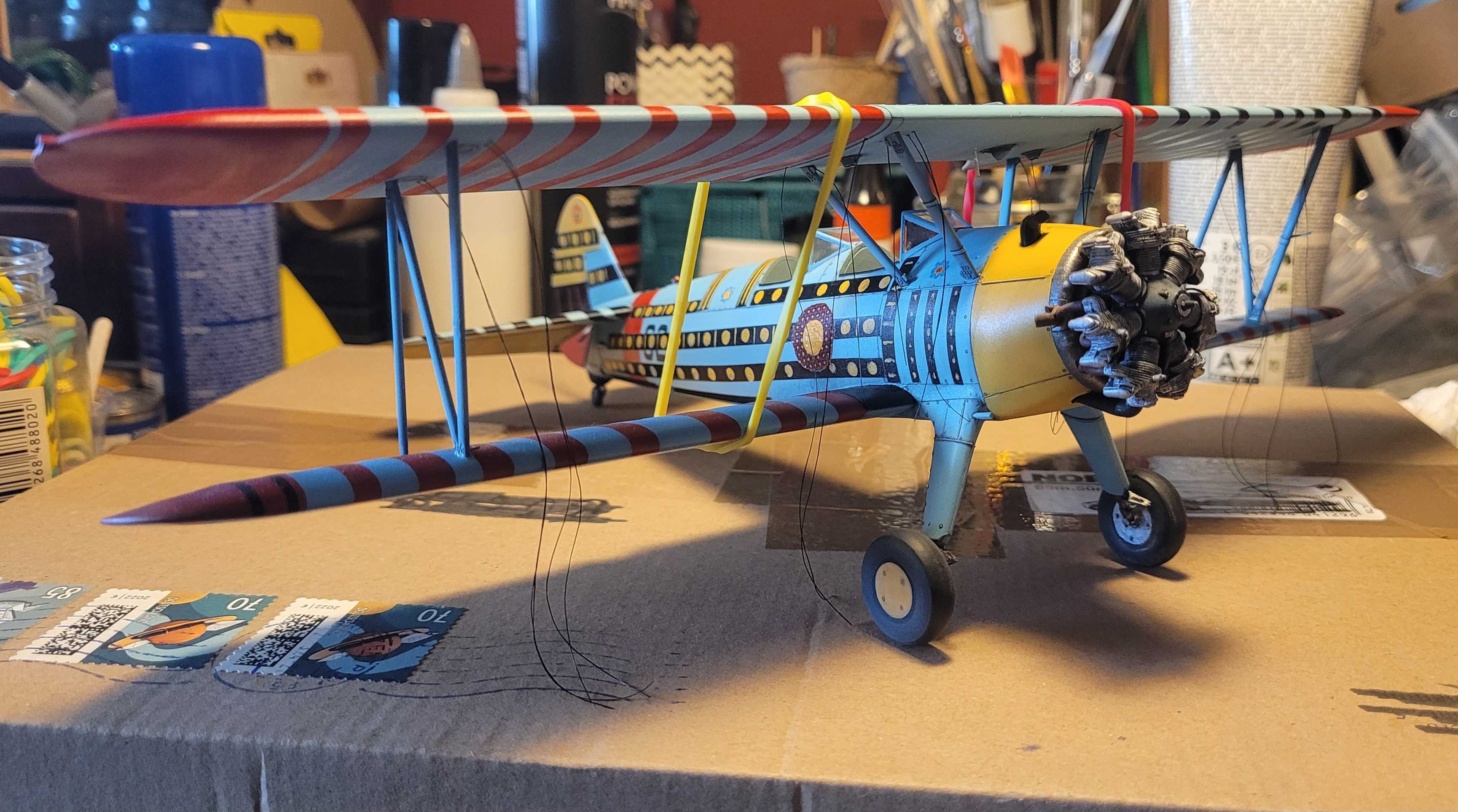 Dann hab ich schonmal das Rigging vorbereitet und an die Unterseite der oberen Tragflächen angebracht. Erst danach folgte der Anbau der Tragflächen.