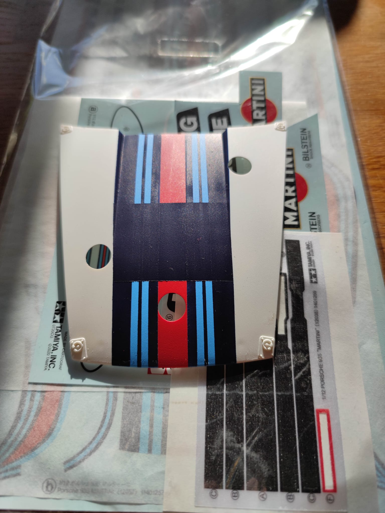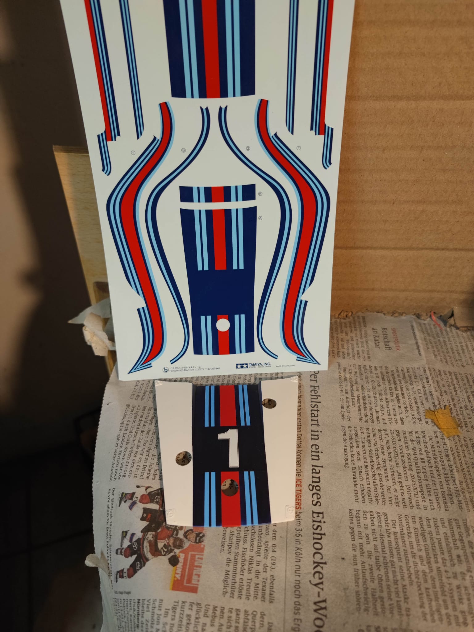 Klasse, kaum wird der Daumen gedrückt, schon geht was schief. Eine Nr. 1 für die Tür ist kaputt gegangen. Wie auch immer ich das geschafft habe, hat sich die Folie verdreht und weil ich Decal soft benutzt habe, war es dann vorbei. Mal sehen, wo ich eine neue 1 herkriege, ohne gleich den ganzen decalbogen kaufen zu müssen. Dafür hats auf der Motorhaube geklappt