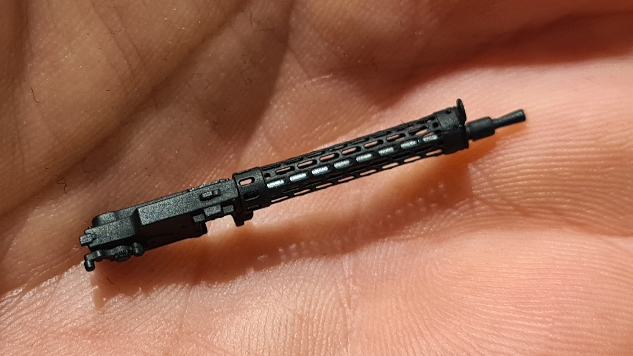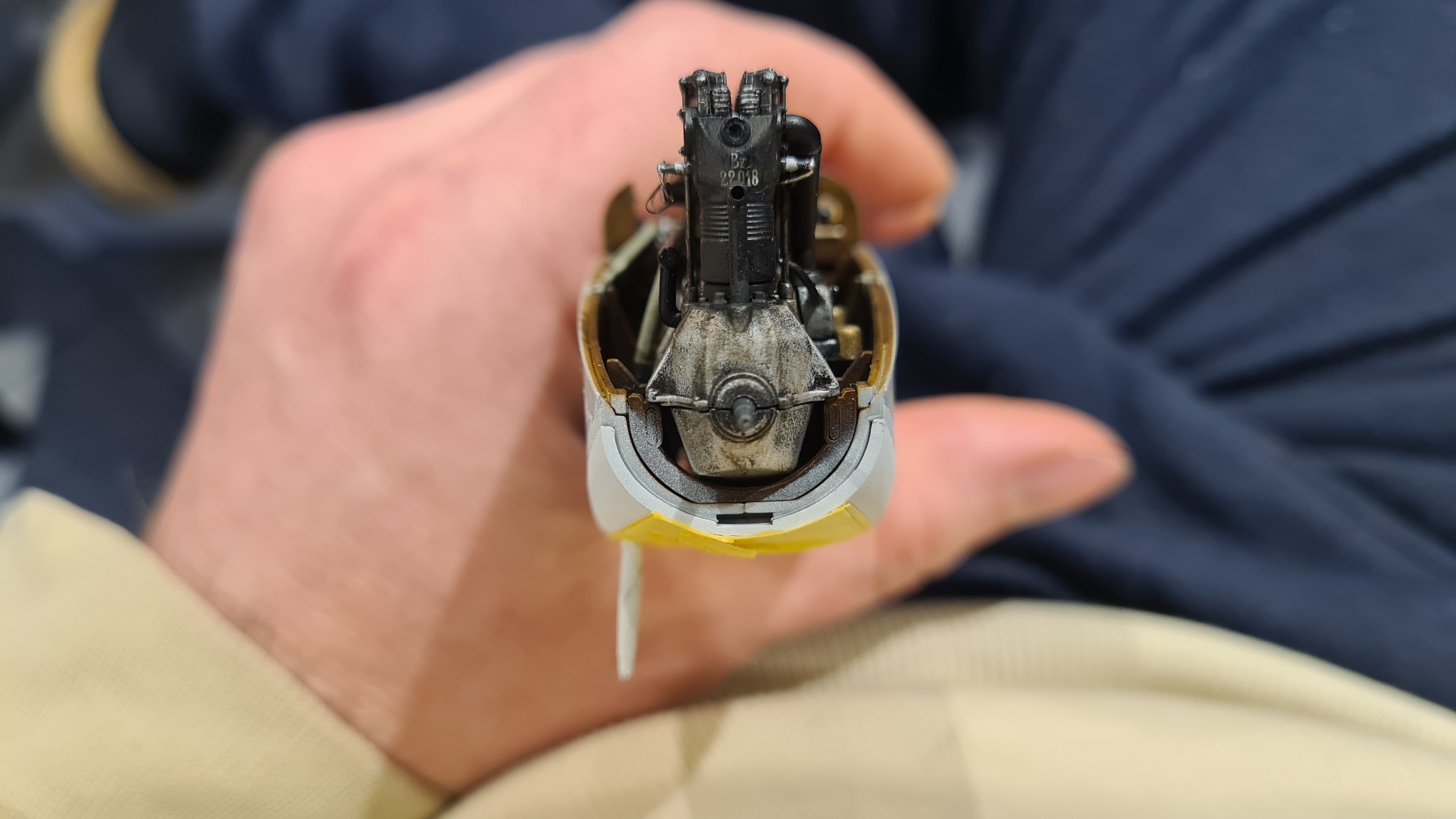 Alles zusammengesteckt, schwarz gesprüht. Nur der Lauf wurde mit Stahl (Alclad 2 ALC112) stahlfarben gesprüht. Da kommt man ja hinterher nicht mehr dran.