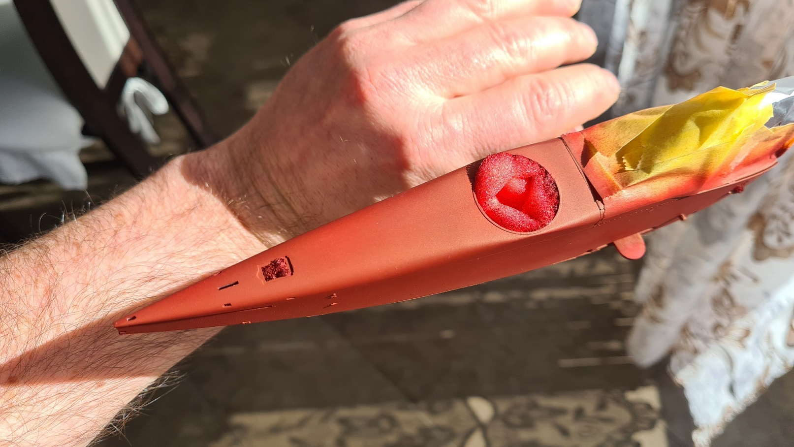 Nochmal das Bauteil komplett entlackt. Nochmal Holz. Nochmal rote Farbe. Nochmal Klarlack. Jetzt passt es