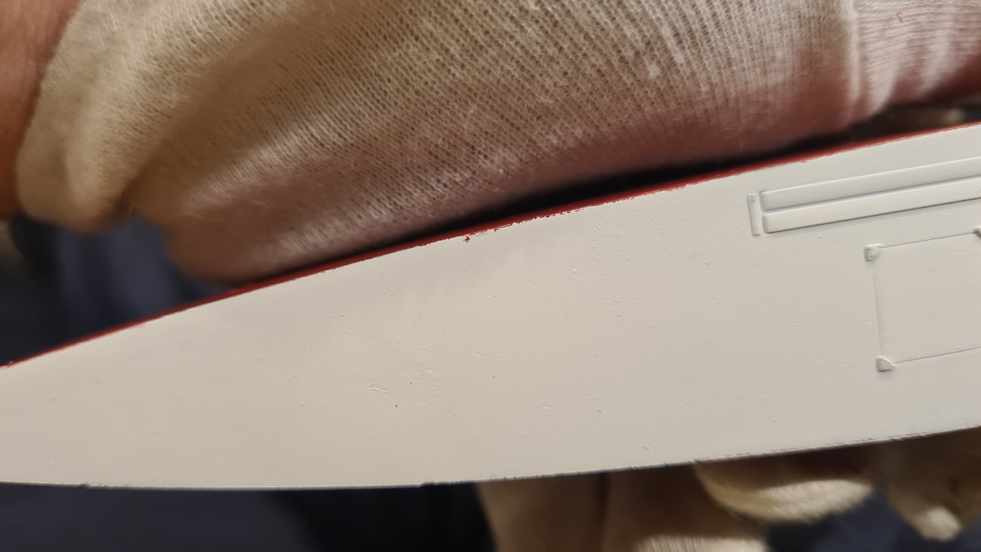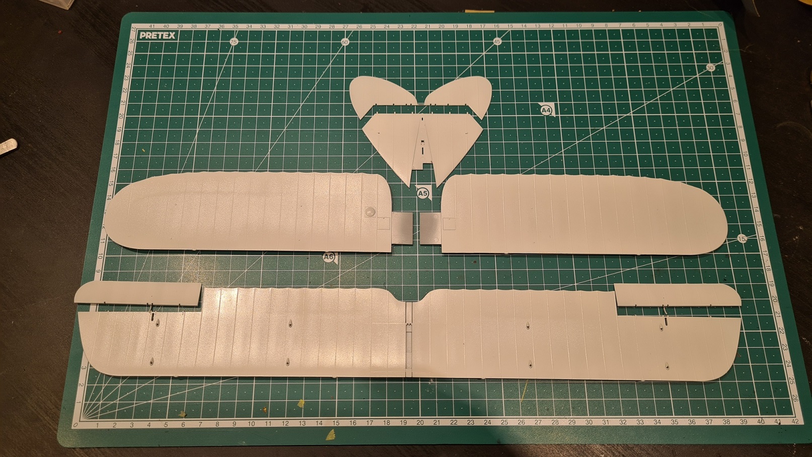Die Unterseiten der Flügel wurden allesamt lackiert. Und das in einem nur leicht abgetönten Weiß. Die Mischung ist 10 Tropfen weiß (Tamiya X2) zu 1 Tropfen Deck Tan (Tamiya XF-55). Wie man sich gut vorstellen kann, ist das nicht wirklich gut deckend. Dementsprechend waren 6 oder 7 Durchgänge nötig, bis alles ordentlich abgedeckt war. Fussel sieht man im Weiß natürlich besonders gut. Dazu habe ich dann zwischen den Sprühgängen immer mindestens 1 Tag Zeit gelassen und Fussel mit 1500 Sandpapier vorsichtig entfernt. Dann erst kam die nächste Farbschicht.