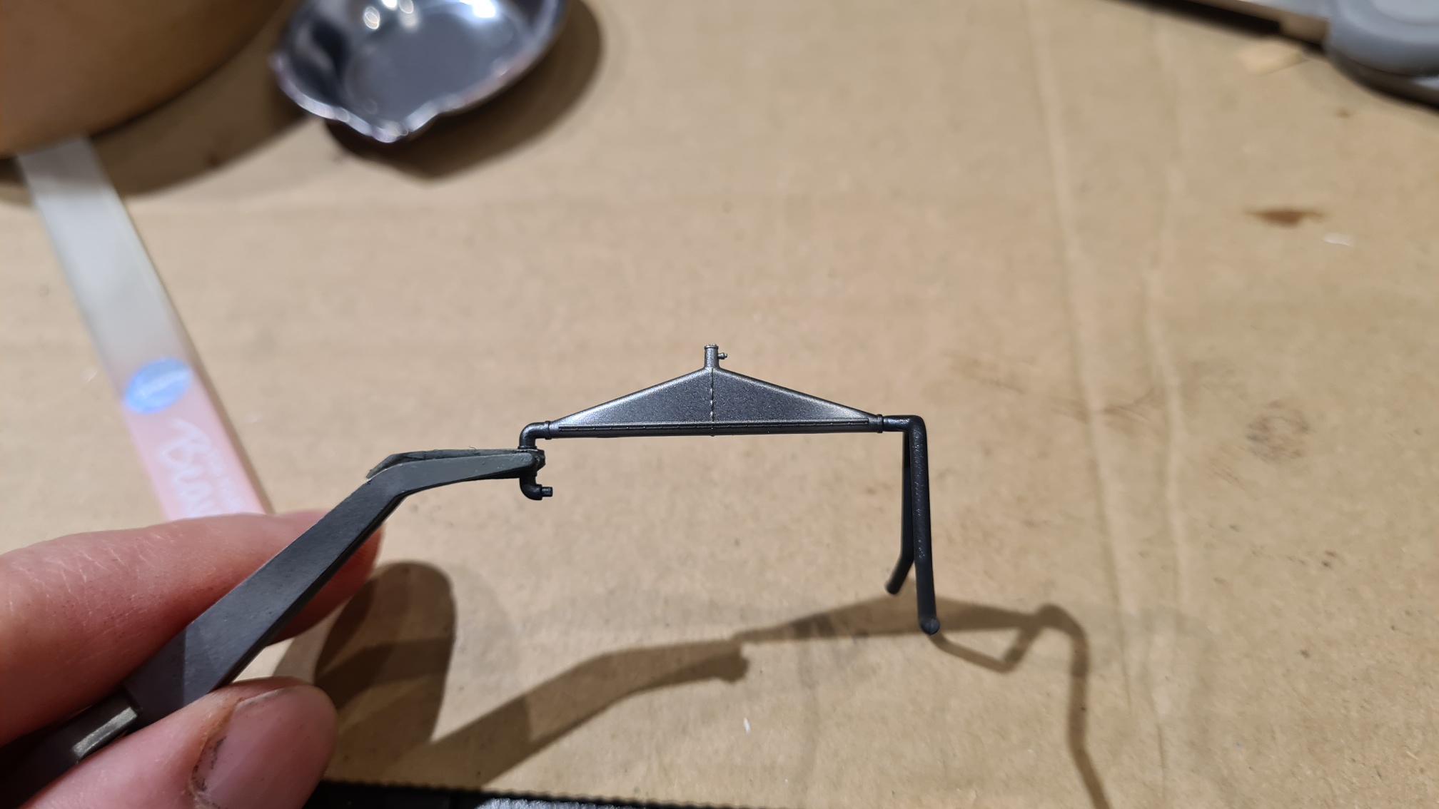 An einem Übungsstück hat es wunderbar funktioniert, also meine grundsätzliche Empfehlung für die Methode. Aber die PE-Teile von Wingnut Wings sind vergleichsweise dick. Es war eine Frickelei und das Endergebnis ist nicht so überzeugend, da bei der Prozedur das Werkstück an 2 Schwachstellen (Löchern) gebrochen ist. In diesem Fall aber nicht so wichtig, weil man hinterher kaum noch etwas davon sieht. Siehe spätere Fotos.