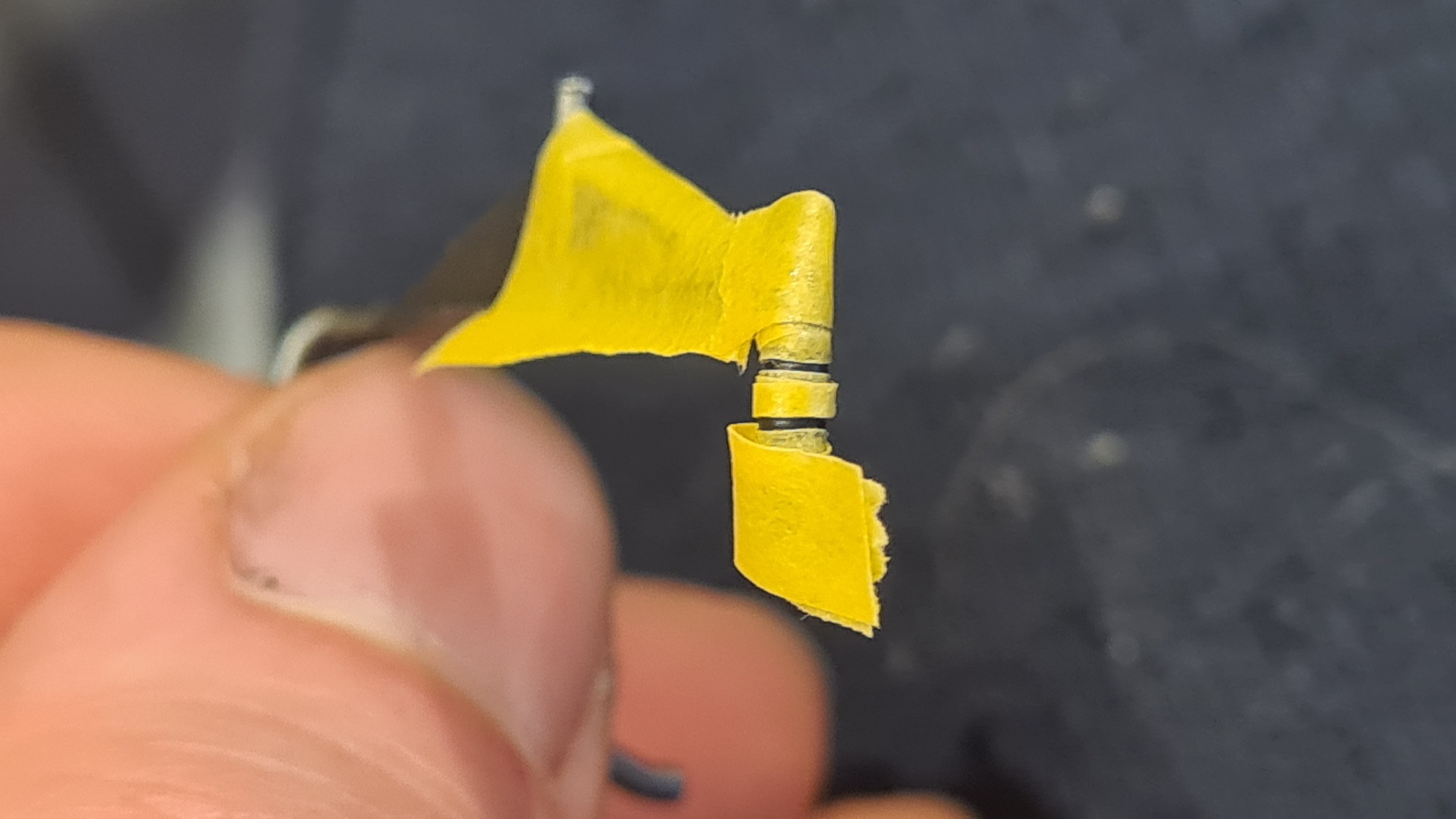 Ich habe mit Sekundenkleber-Gel (diesmal also die blaue Patex-Tube) geklebt, um noch korrigieren zu können. Auf der Innenseite noch einen kleinen Klebeberg drauf, damit die Spitze sich nicht bei jeder zweiten Berührung ablösen würde: