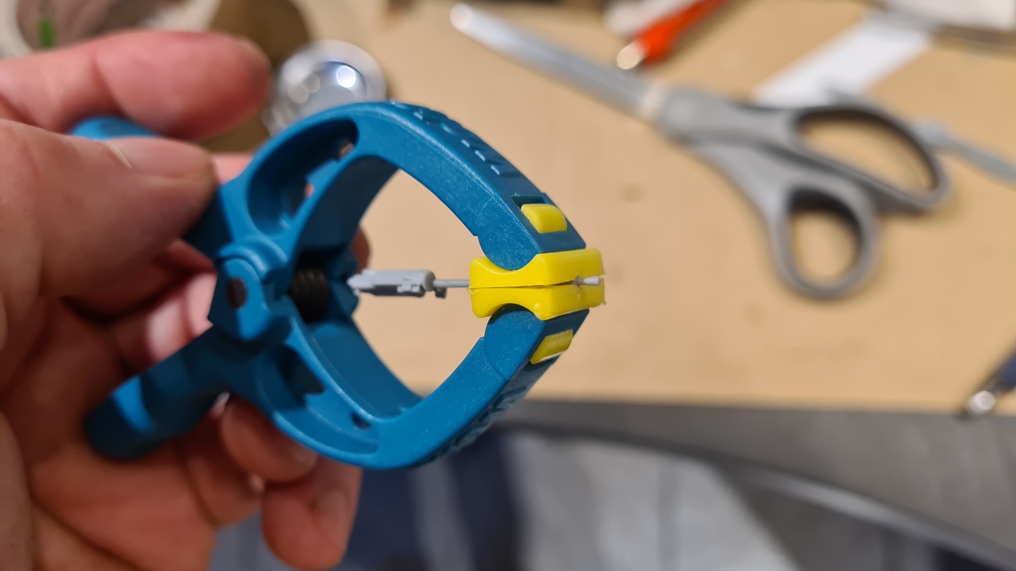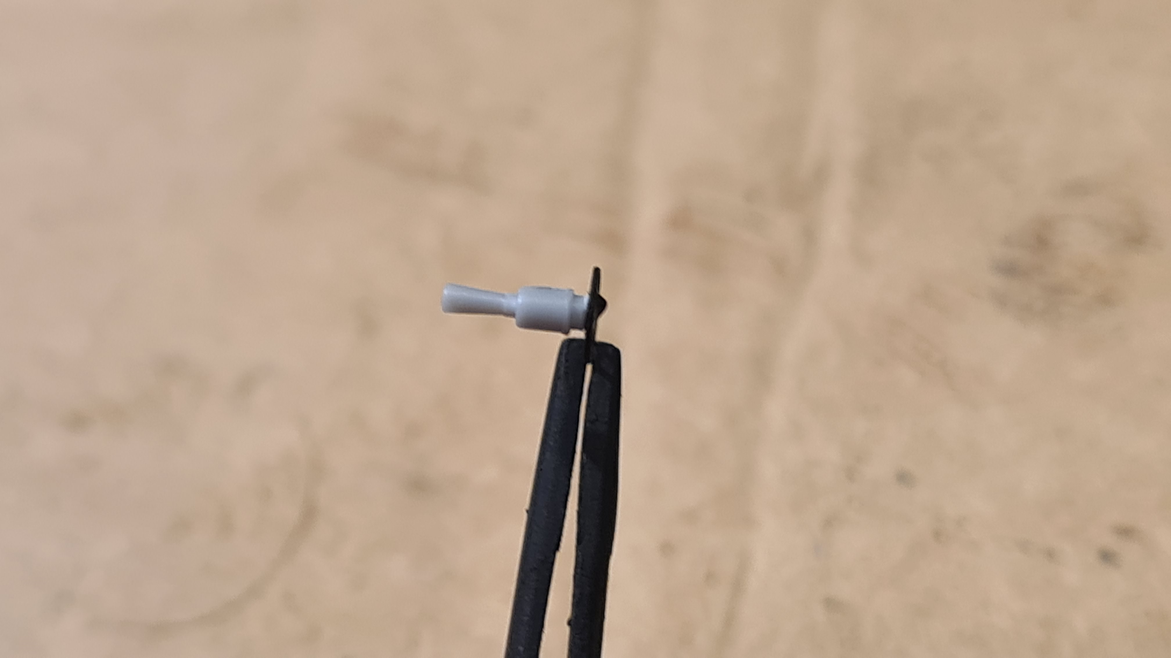 Der Lauf wurde aufgebohrt. etwas kompliziert, wenn es am Ende nur ein dünnes Plastistängchen ist. Ich habe das Teil also in eine Federzwinge gespannt, gerade so, dass nur noch das Laufende herausschaute: