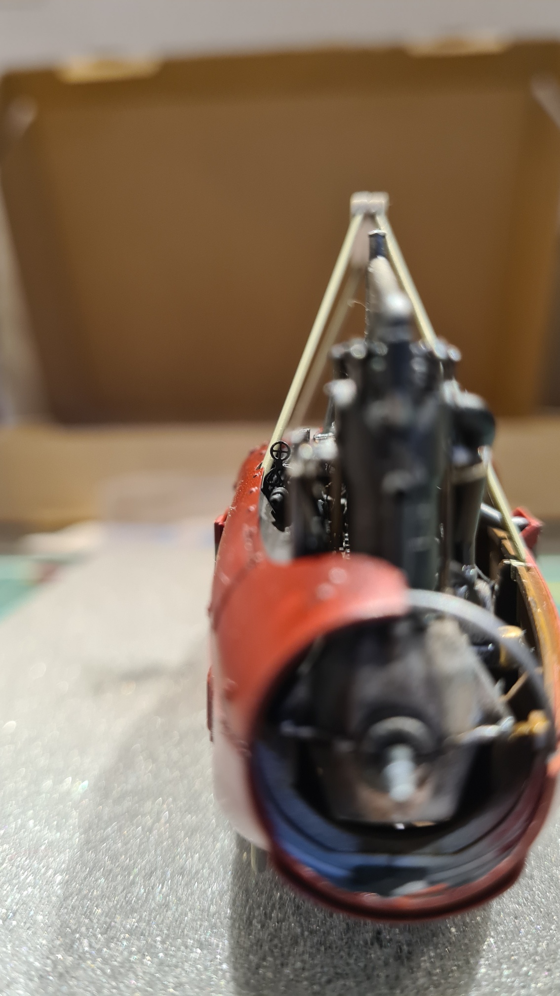 Shit happens, gerade fertig, hab ich mit eine Macke reingemacht. Nochmal rot drüber genebelt, noch sichtbar, nochmal drüber, weiter sichtbar. Diese Farbe verzeiht echt keine Fehler. Am Ende war der Farbauftrag zu dick und es sah wieder nicht homogen aus. Vielleicht bügelt es der Glanzlack aus (Tamiya Clear X22)? Nein. Läuft super.