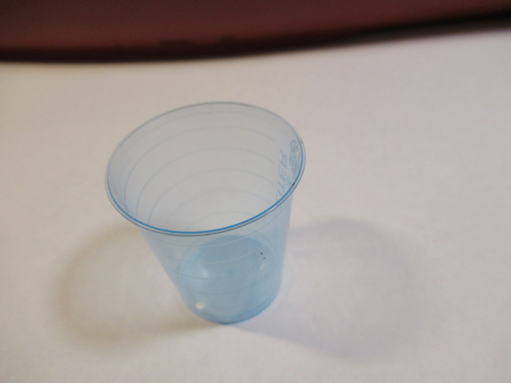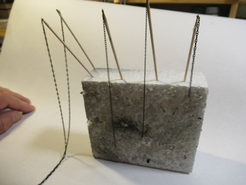 Die Flüssigkeit habe ich dann in einen kleinen Becher gegeben . Dann soll die Kette mit der Flüssigkeit mit einem Pinsel bestichen werden . Klappte aber nicht so gut . Hatte die Ketten auf Zahnstocher aufgepiekst . Habe dann die Kette einfach in die Flüssigkeit mehrfach eingetaucht . Daunn in einen Styropurblock befestigt . Das Zeug soll ca 3 min einwirken .