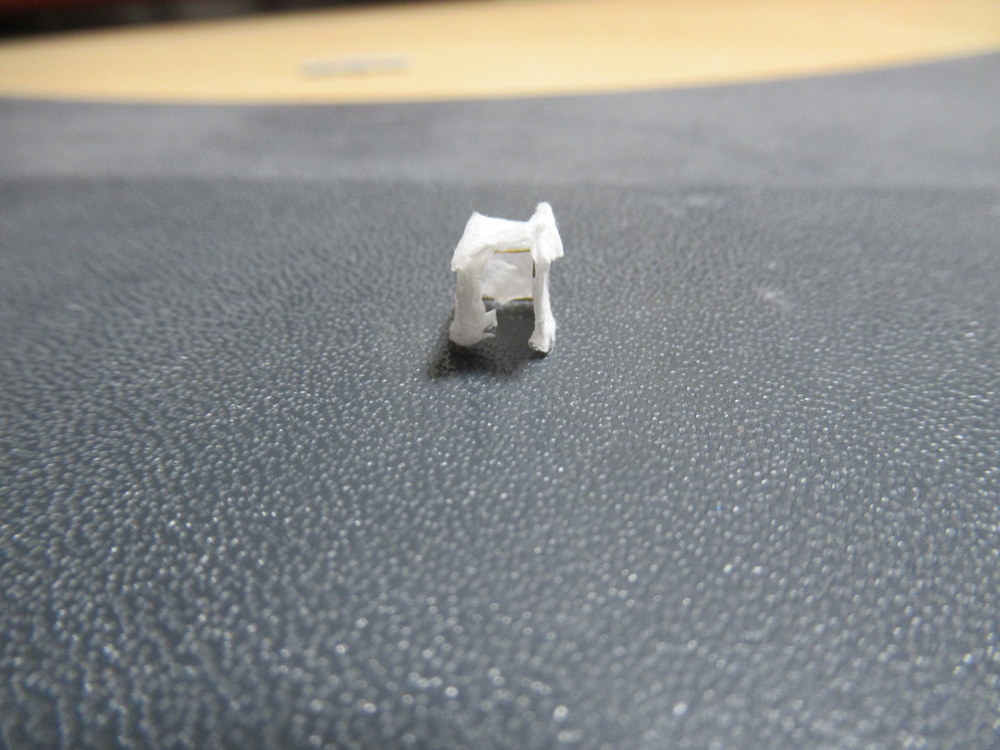 Soweit so gut . Die Ätzteile sind dementsprechend gebogen und verklebt . Um die Plane darzustellen wird mittels Taschentuchpapier und verdünntem Holzleim die Plane gestalltet .Nach dem Trocknen wird diese dann noch leicht vergilbt da die weisse Bespannung doch schnell verwittert / verdreckt war . Soweit die Theorie.