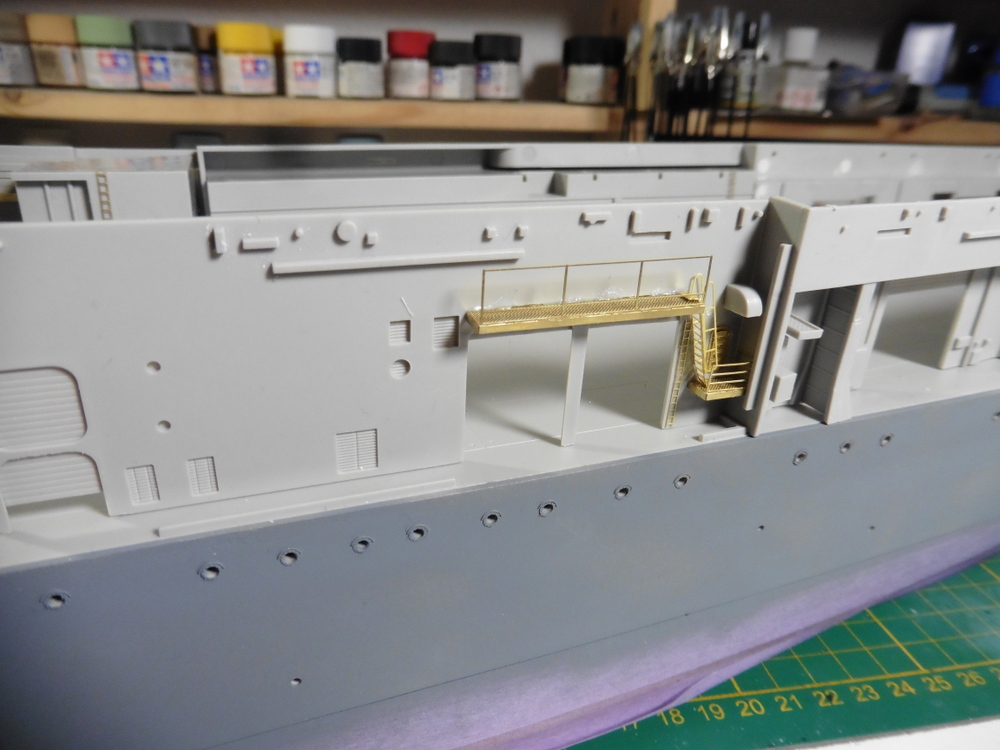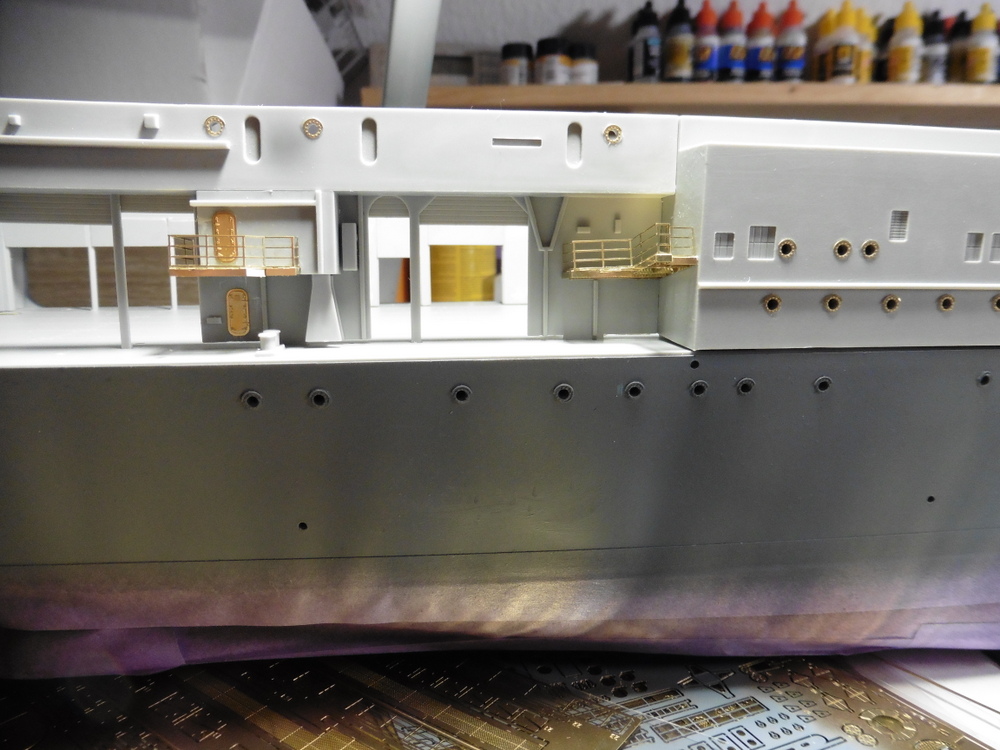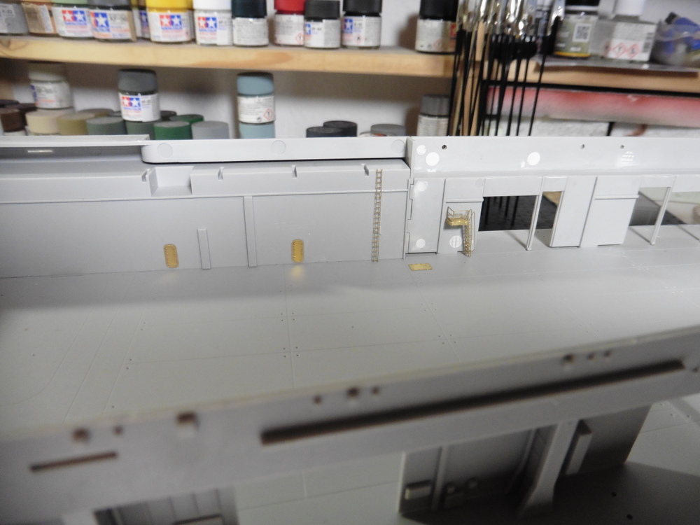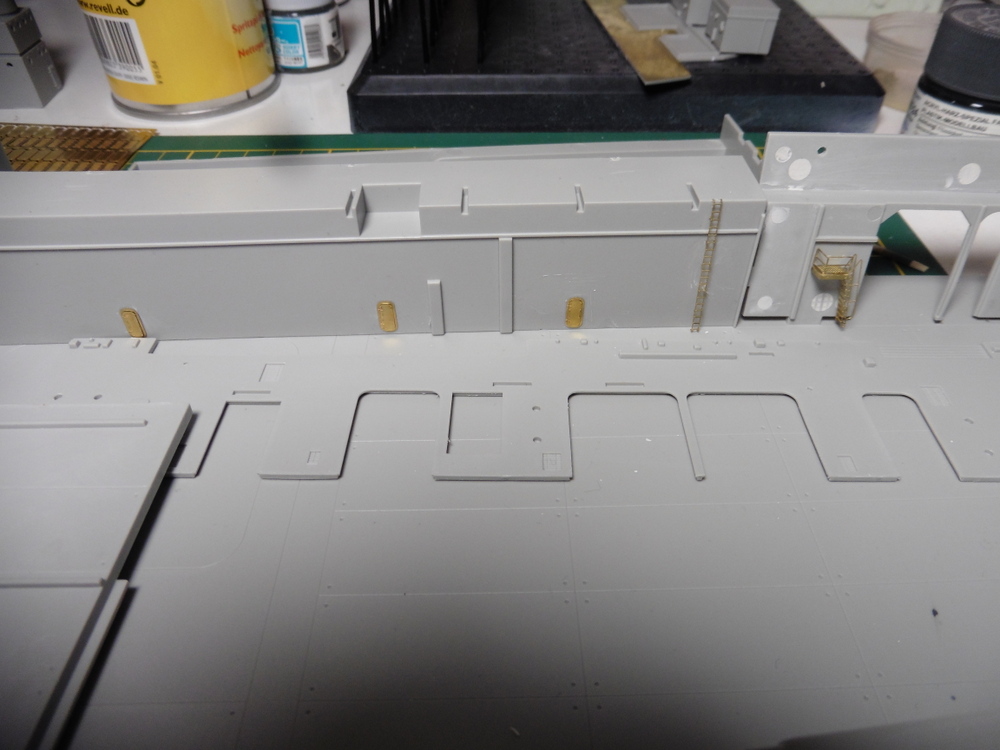 Im Innenbereich wie auch Aussen gibt es massig Türen Bullaugen und Laufgänge sowie Leitern zu verbauen . Natürlich alles in Ätzteilmanier. Habe dann erst mal innen angefangen . Bisher klappt das gut . Vorne links hab ich dann auch Aussen Ätzteile angebracht . Ach ja , die Rolltore wurden auch verbaut ... offen , aber immer ein wenig oben stehen lassen .