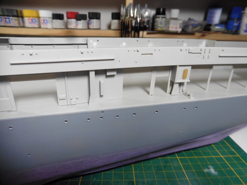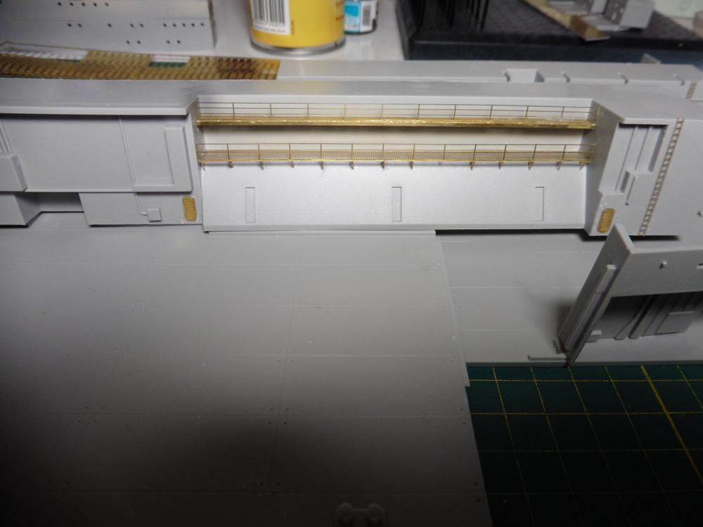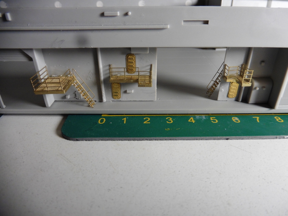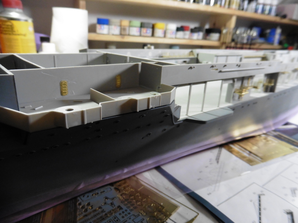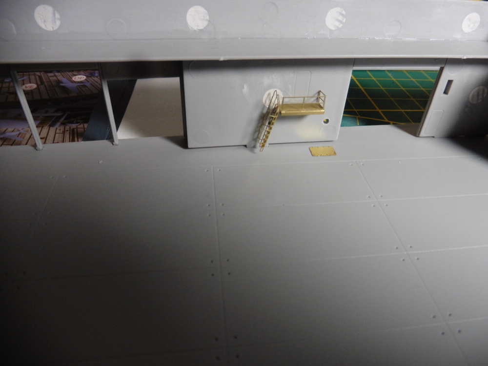 Im Innenbereich wie auch Aussen gibt es massig Türen Bullaugen und Laufgänge sowie Leitern zu verbauen . Natürlich alles in Ätzteilmanier. Habe dann erst mal innen angefangen . Bisher klappt das gut . Vorne links hab ich dann auch Aussen Ätzteile angebracht . Ach ja , die Rolltore wurden auch verbaut ... offen , aber immer ein wenig oben stehen lassen .
