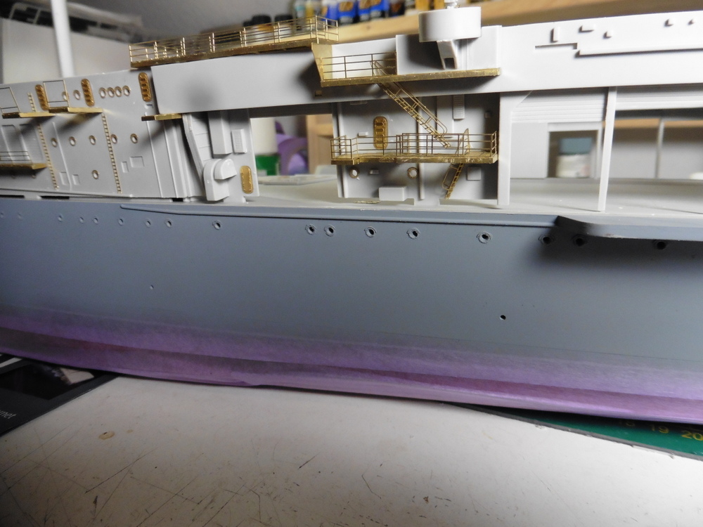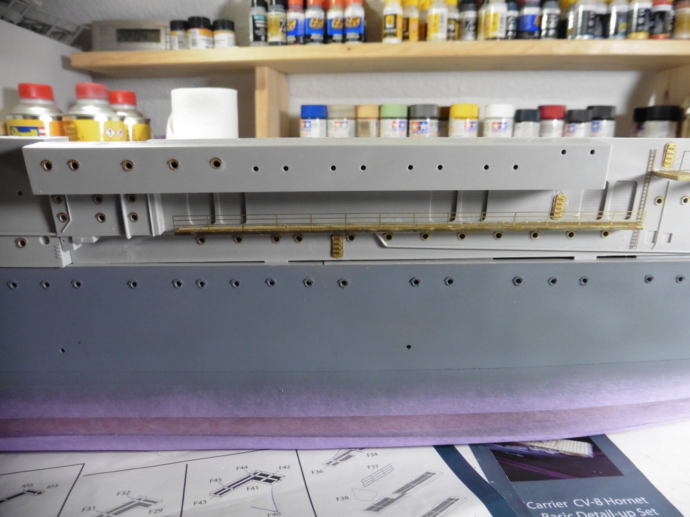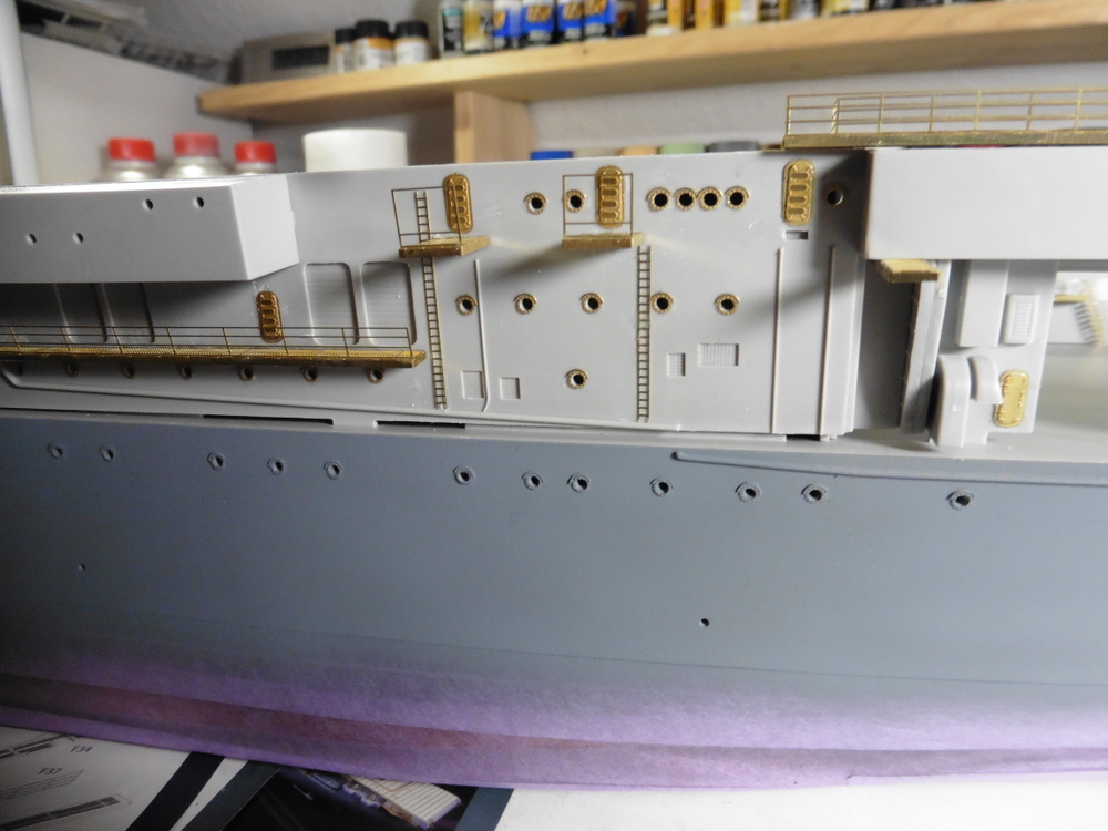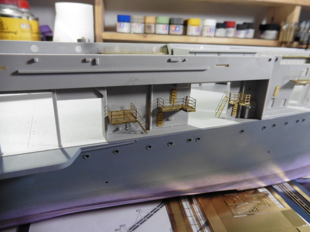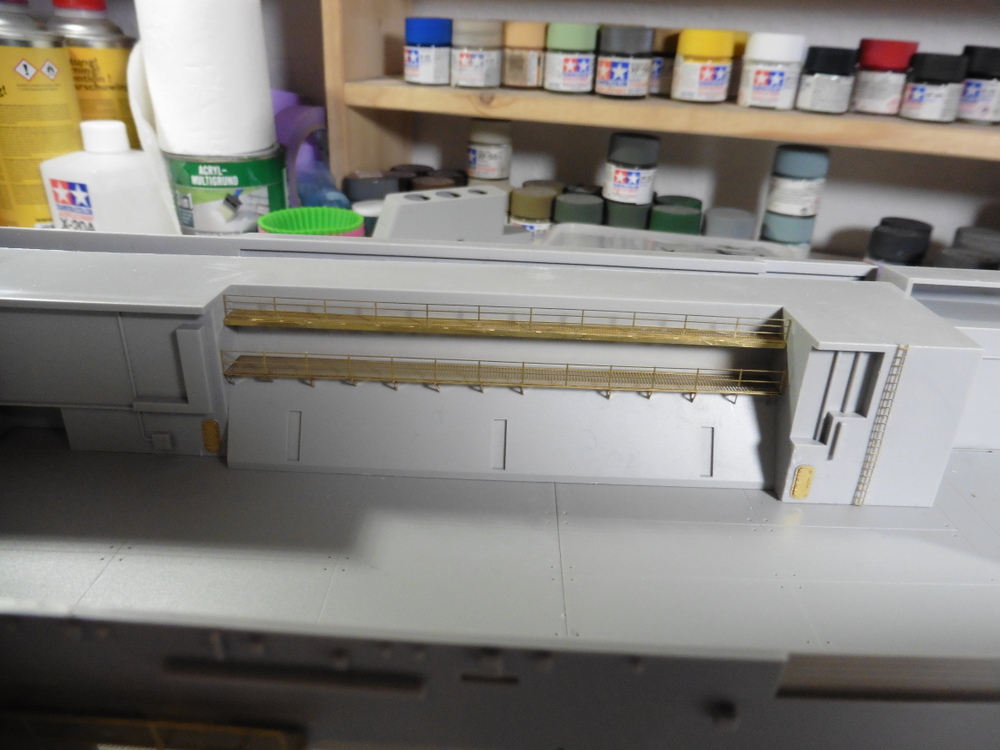 Bis auf die oberen Laufgänge sowie Geschützstellungen habe ich alles angebracht .Die oberen noch nicht , da diese erstens Bauteilübergreifend angeklebt werden müssen und zweitens auch noch in Sea Blue ( Tamiya XF 17 ) gebrusht werden müssen.