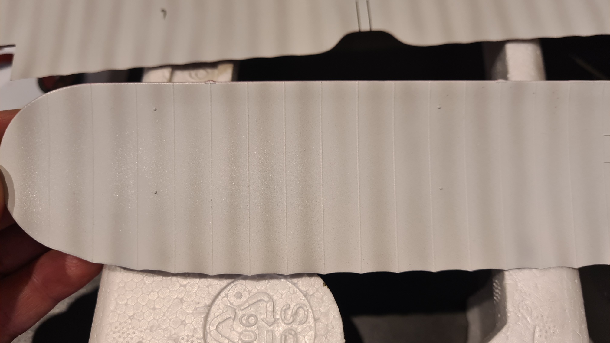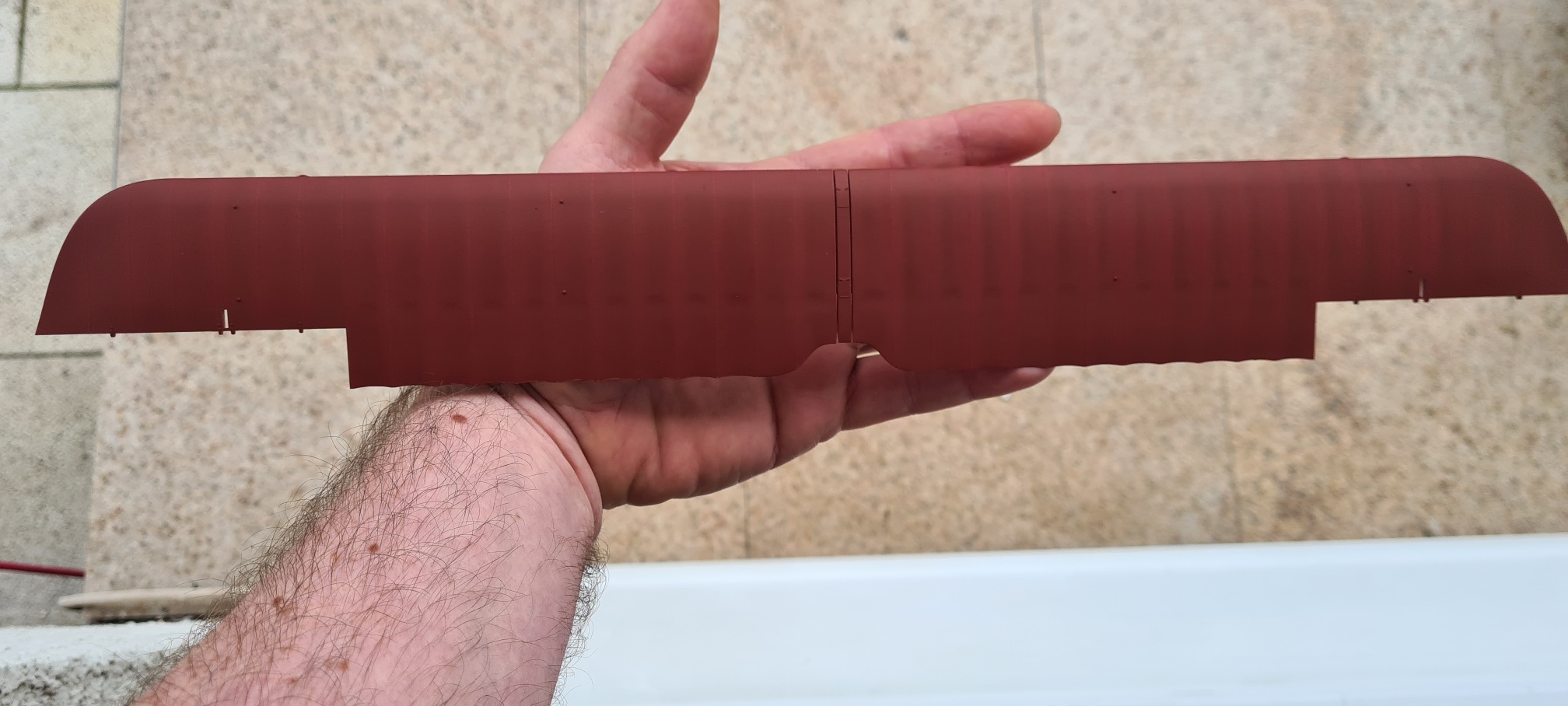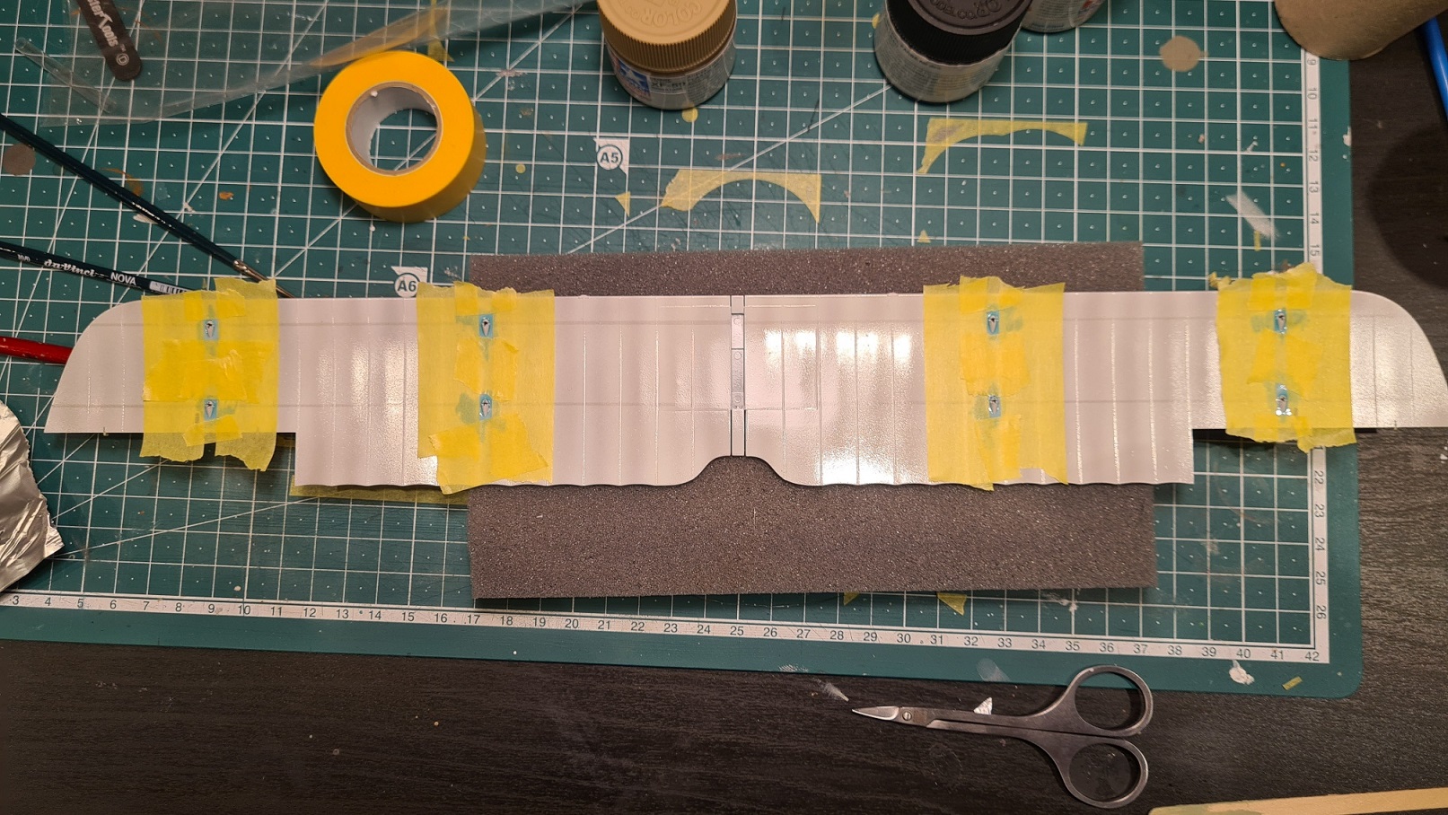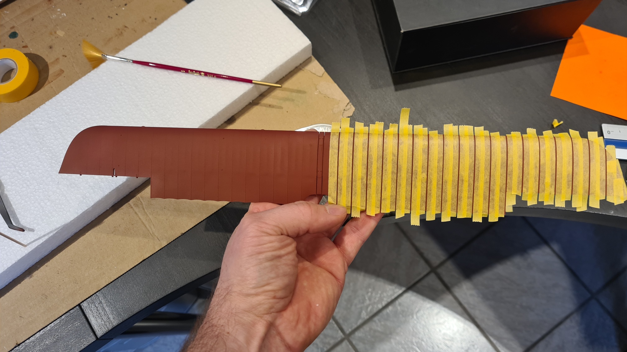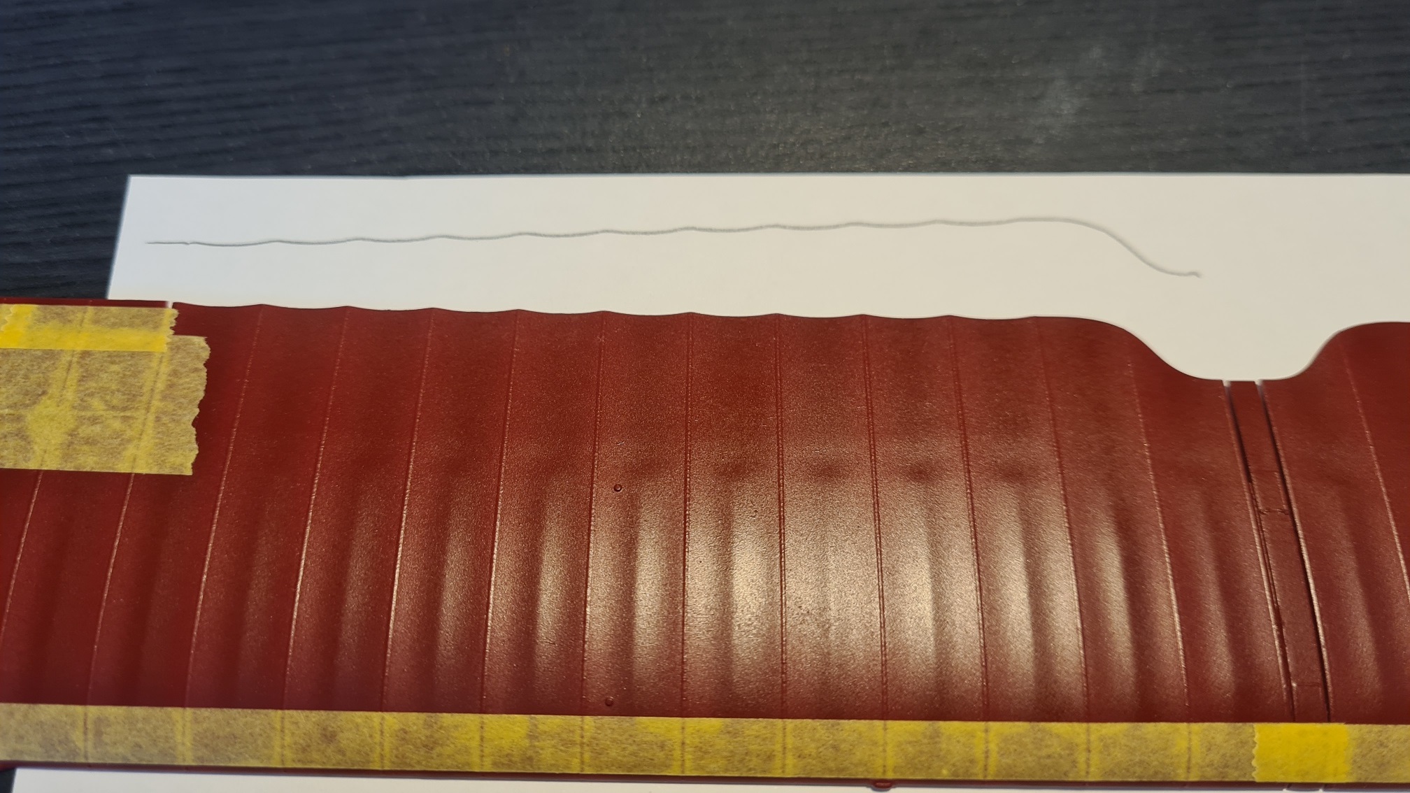 Aber das Bild lässt das Problem erahnen, die Hinterkante hat eine Wellenform. Das hat selbst mit flexiblem Tamiya Klebeband nicht funktioniert. Hier mein Weg: