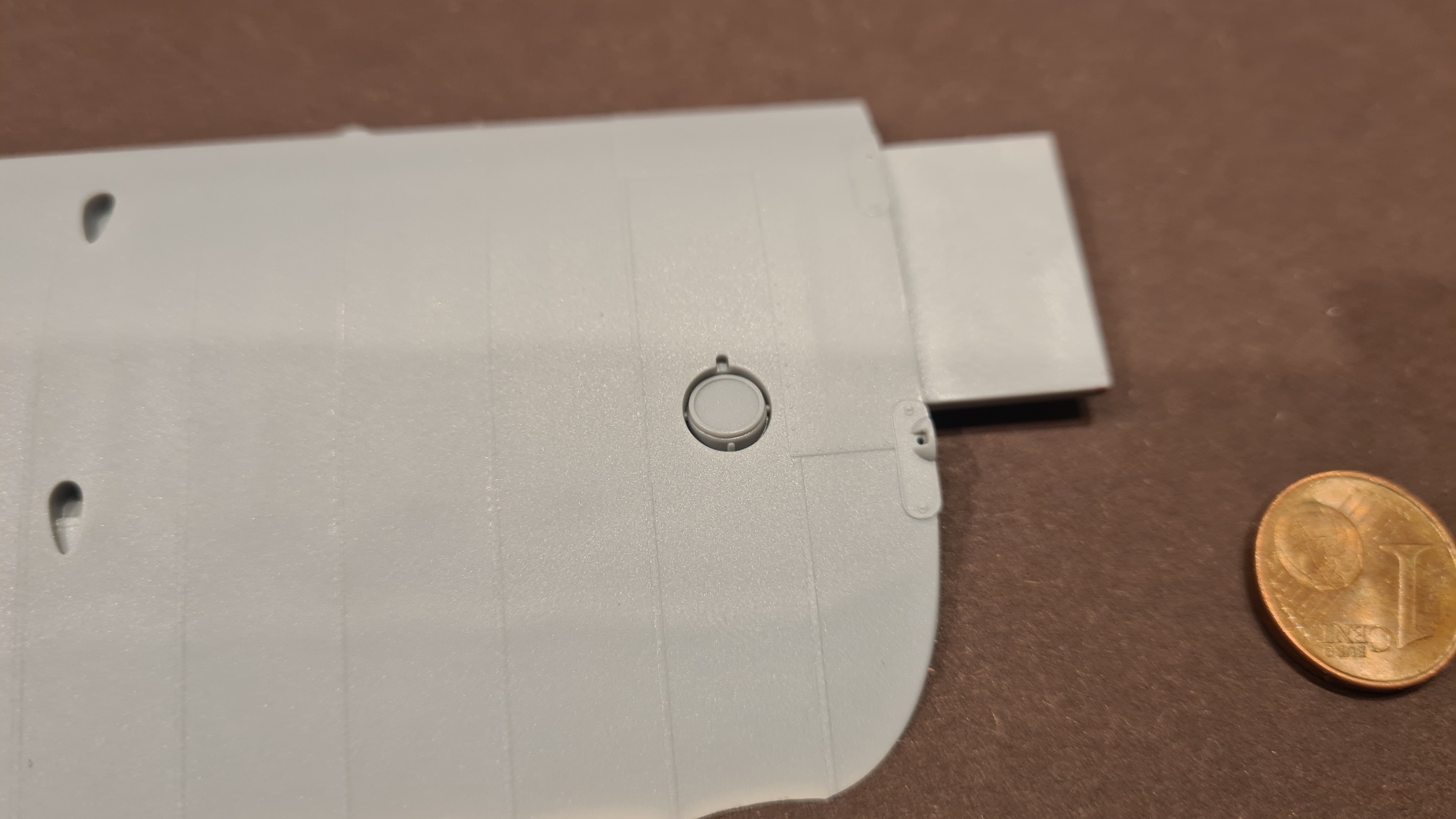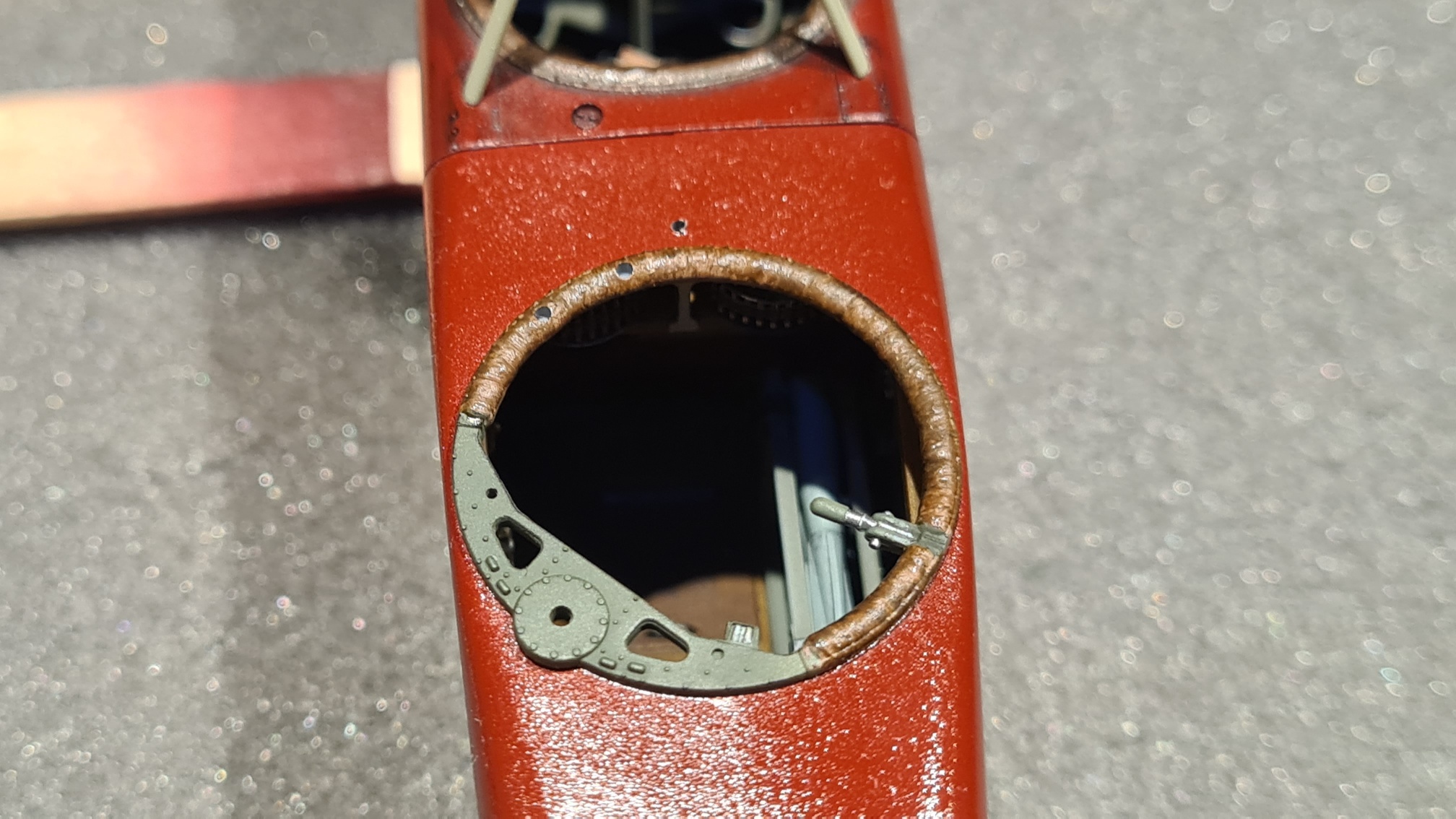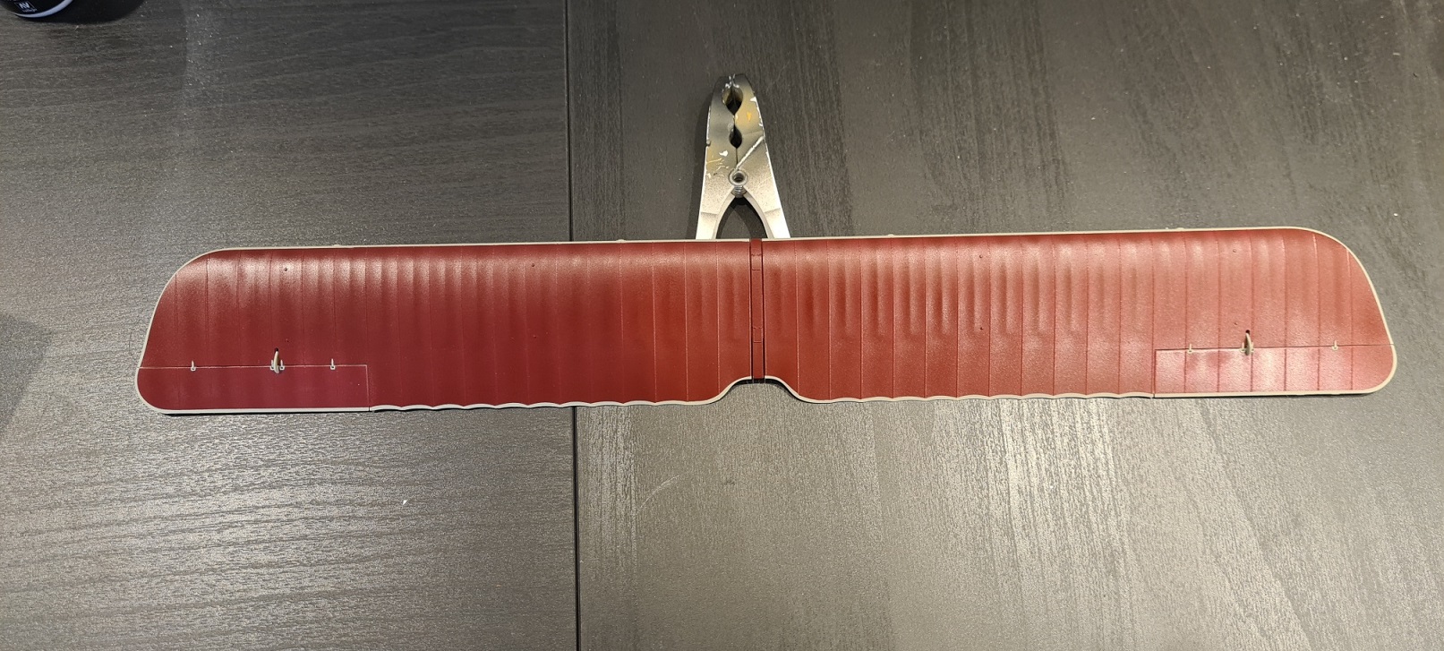 Die Oberseiten bekommen natürlich den Rotbraun-Ton. Aber beim Backbord-Flügel ist mehr zu tun. Dort gibt es einen Kompass, der später freigestellt sein muss. Also wurde hiermit angefangen: