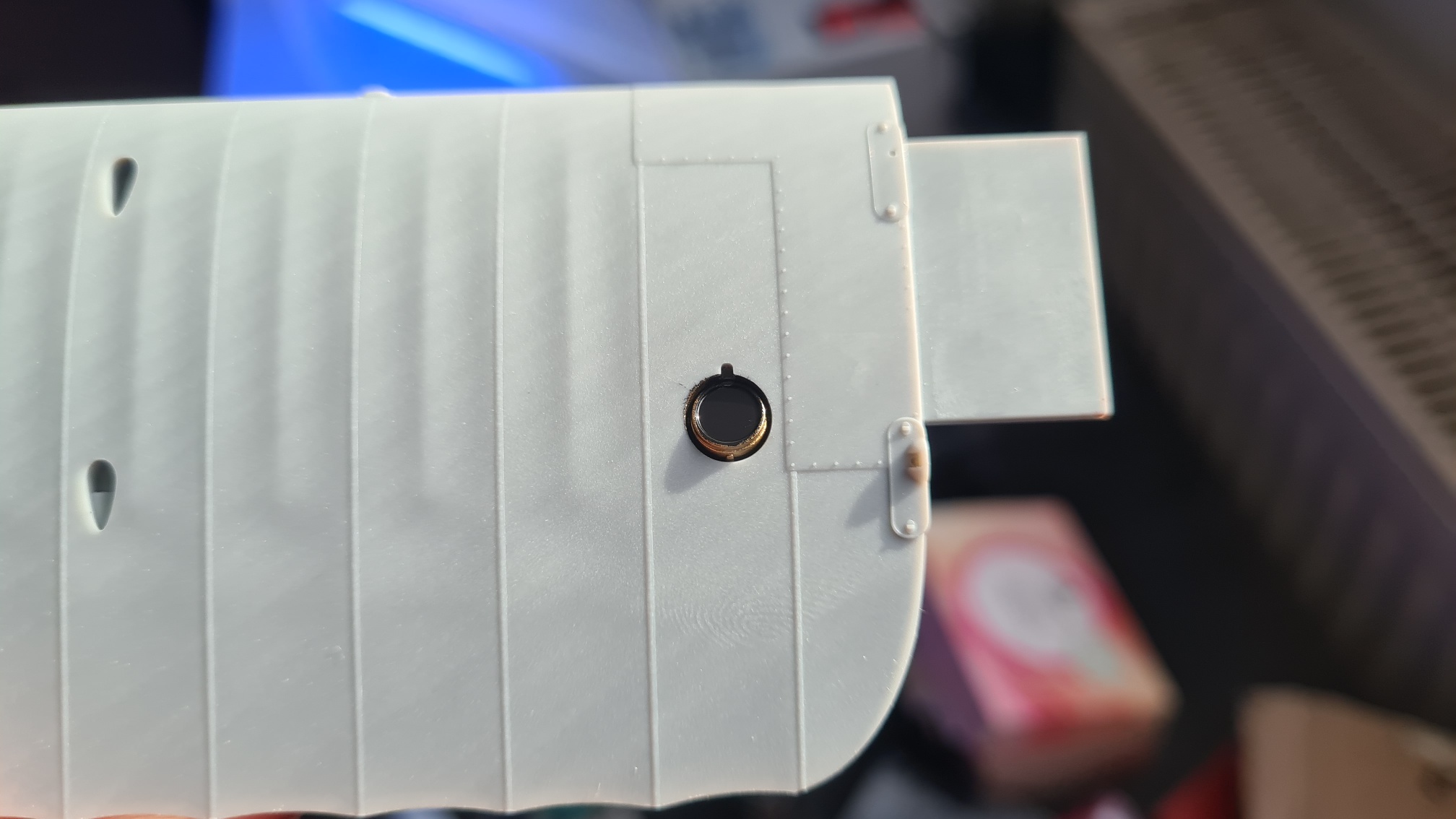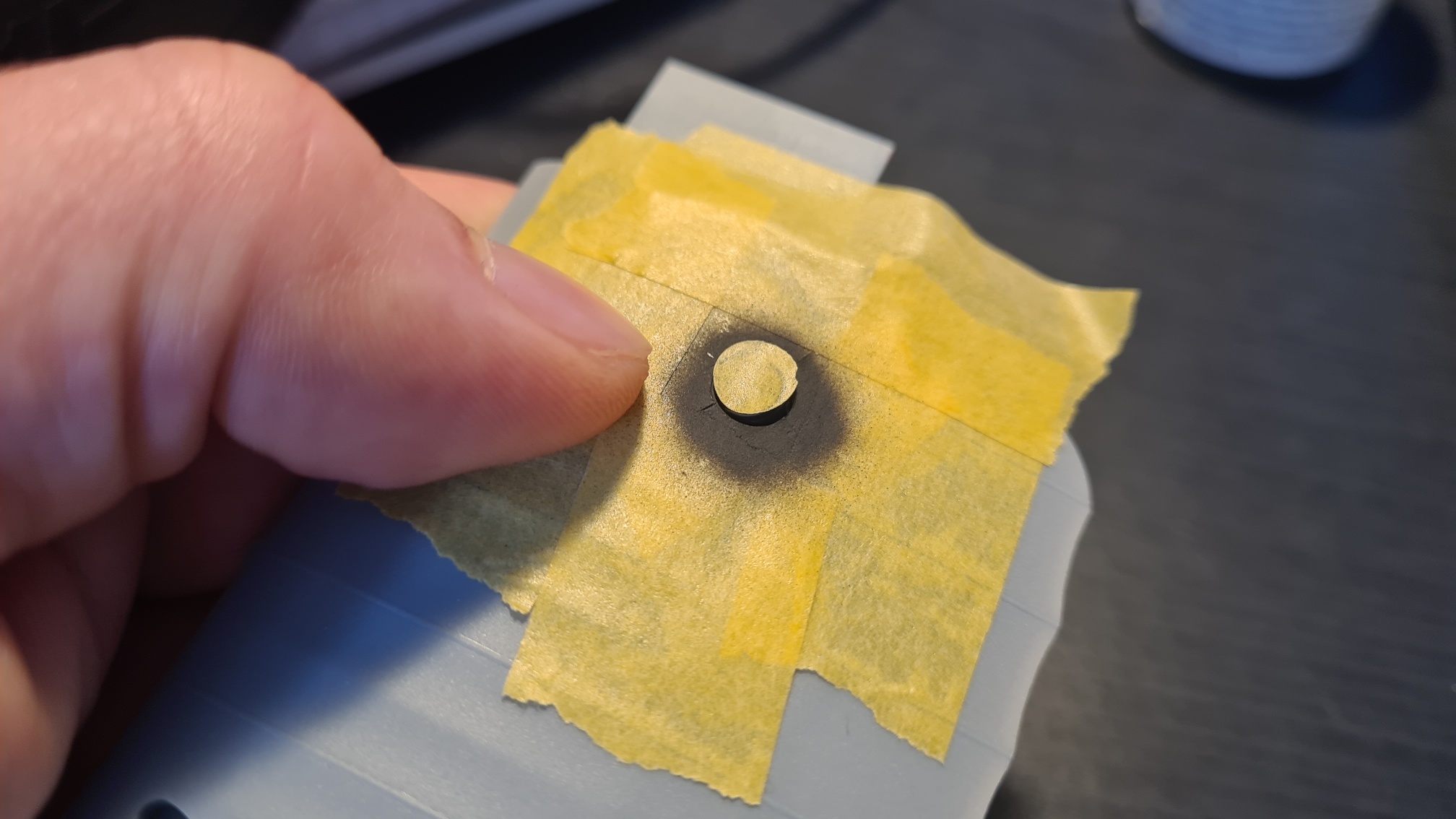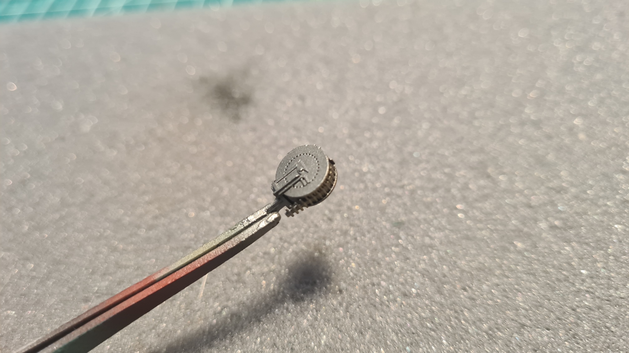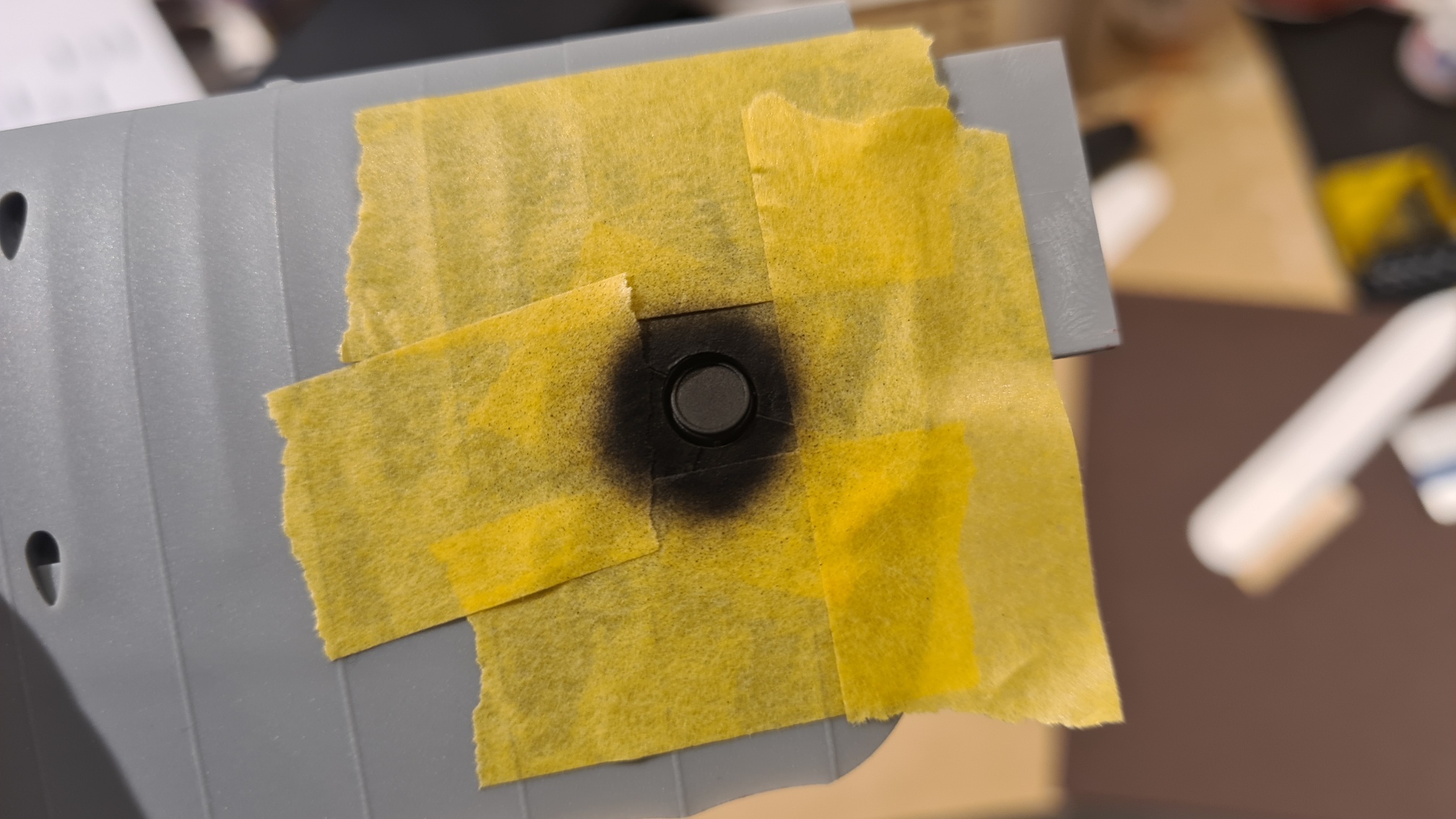 Jetzt die Herausforderung. Der Kompass soll (weil es mir gefällt, Anleitung macht da keine Angabe) ein Messinggehäuse haben. Messing darf dann aber nur der Kompass sein, nicht aber die Aussparung, in der er verbaut ist. Also wurde der Kompass von oben abgeklebt und es wurde seitlich gesprüht. Dabei wurde die Maskierung immer so umplaziert, dass sich bei ändernder Richtung keine Partikel in den Raum zwischen Kompass und Wand verfangen können. Schwer zu erklären... Kann man auf folgendem Bild erahnen. Sprüht man von rechts unten selbst aus erhöhter Position, dann wird nur der Kompass getroffen, aber nicht die Rückwand gegenüber.