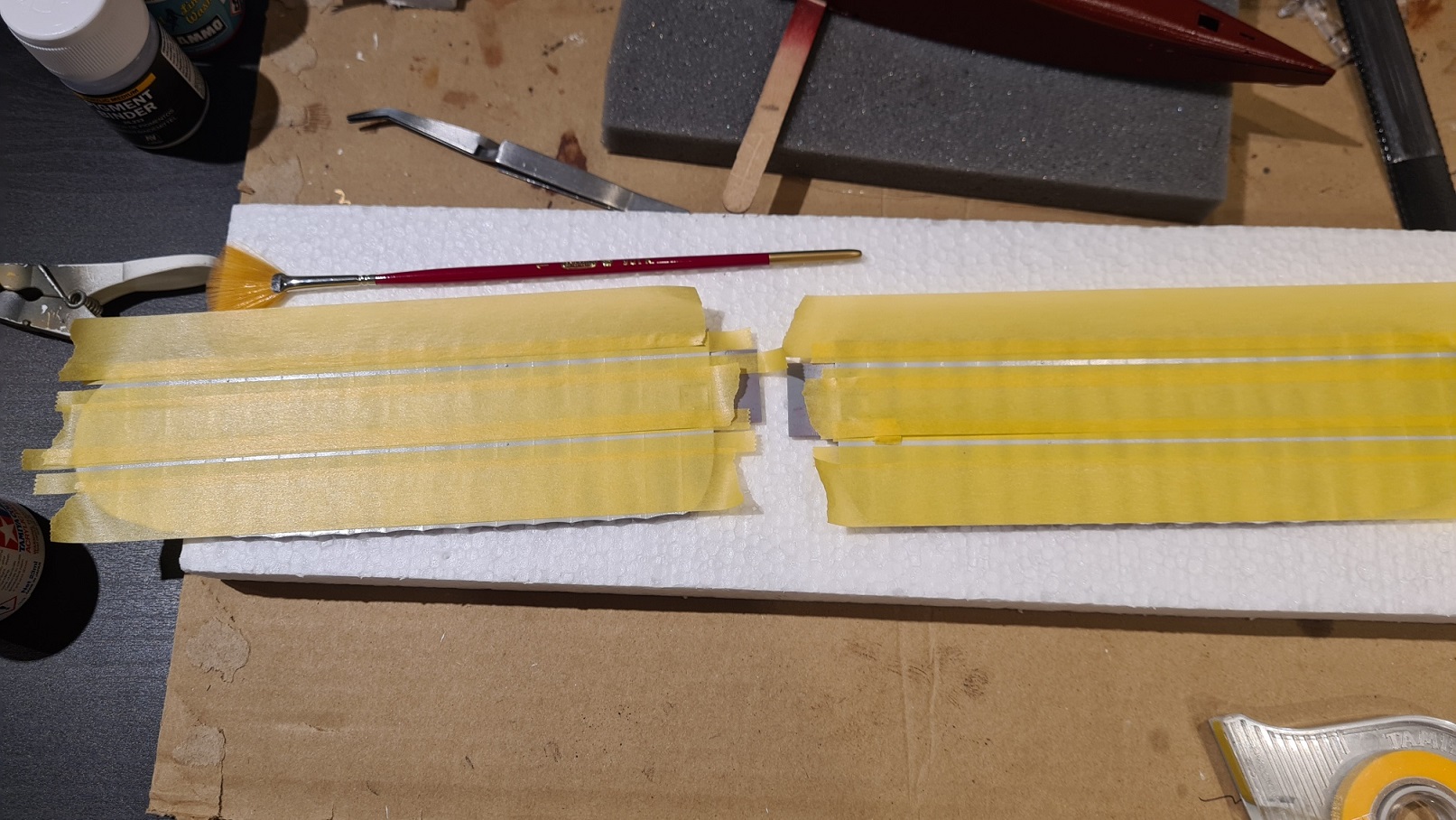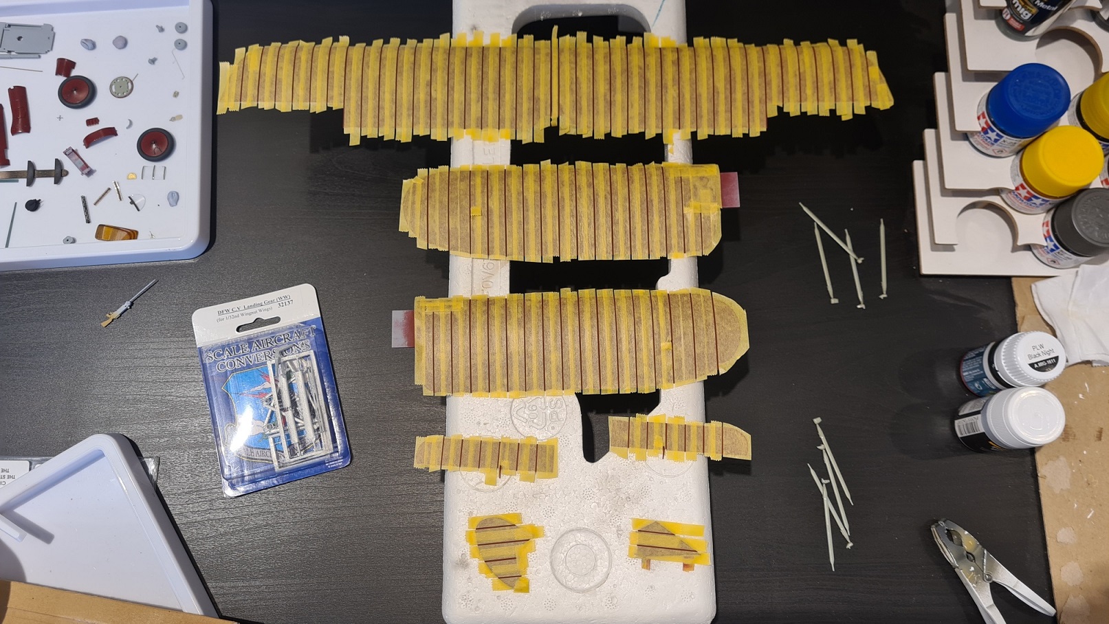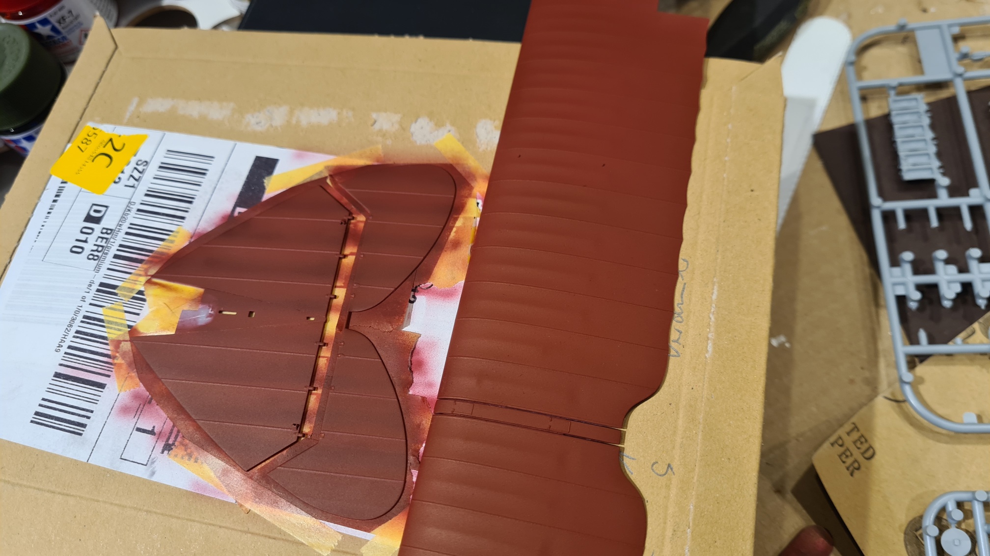 Reines Rot ist zu langweilig, muss aufgelockert werden. Darum ging jetzt das Abkleben los. Die sich abzeichnenden Verstrebungen wurden dabei freigelassen. Viiieeeel Abklebearbeit: