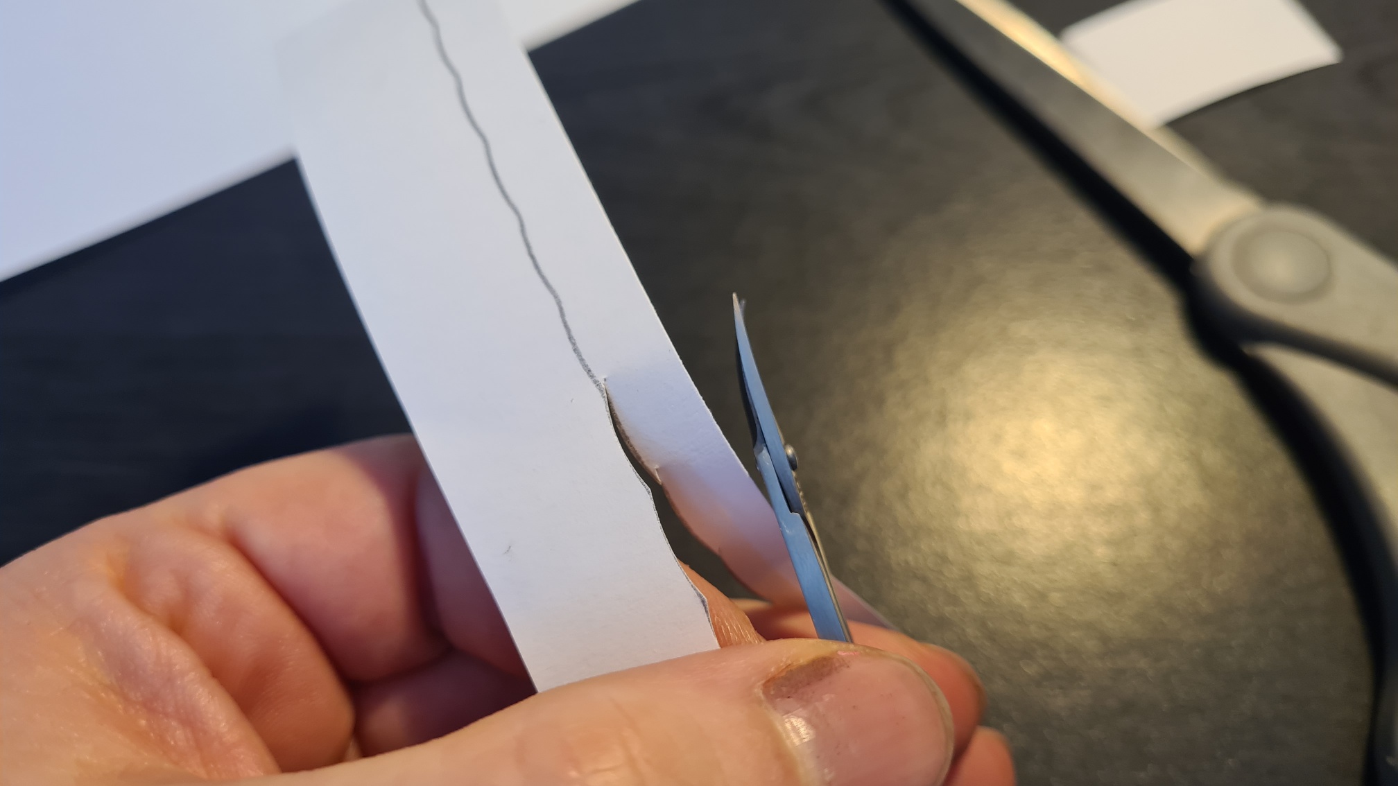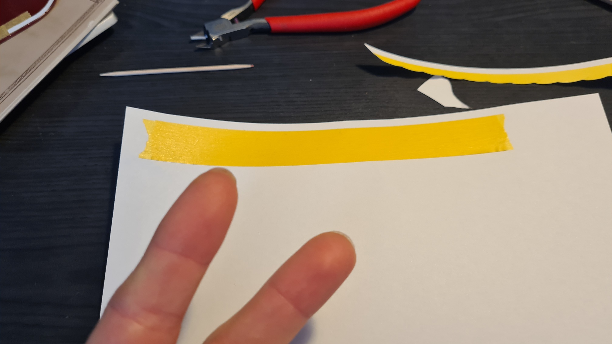 Mit einem Bleistift auf der Papierseite den Flügel entlangfahren (auf dem Maskierband kann der Bleistift nicht zeichnen, sonst wäre es einfacher gewesen)