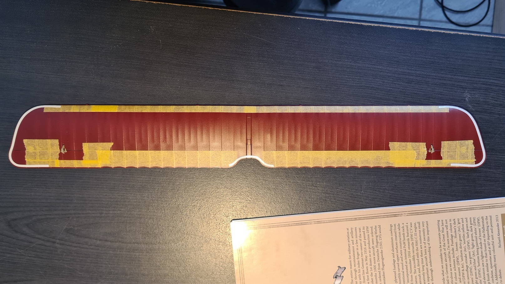 Und jetzt wird es etwas abgefahren... die roten Flügel haben alle eine Umrandung in grau-grün. Hier liegen den Bausatz lange Decal-Streigen bei, die aber kaum um die Kurven zu biegen sind. Ich habe mich daher zum Maskieren und Sprühen entschieden. Bislang habe ich es nur für die Oberseite der oberen Tragfläche durchgezogen. Das Abkleben des "geraden" Rands ist vergleichsweise einfach: