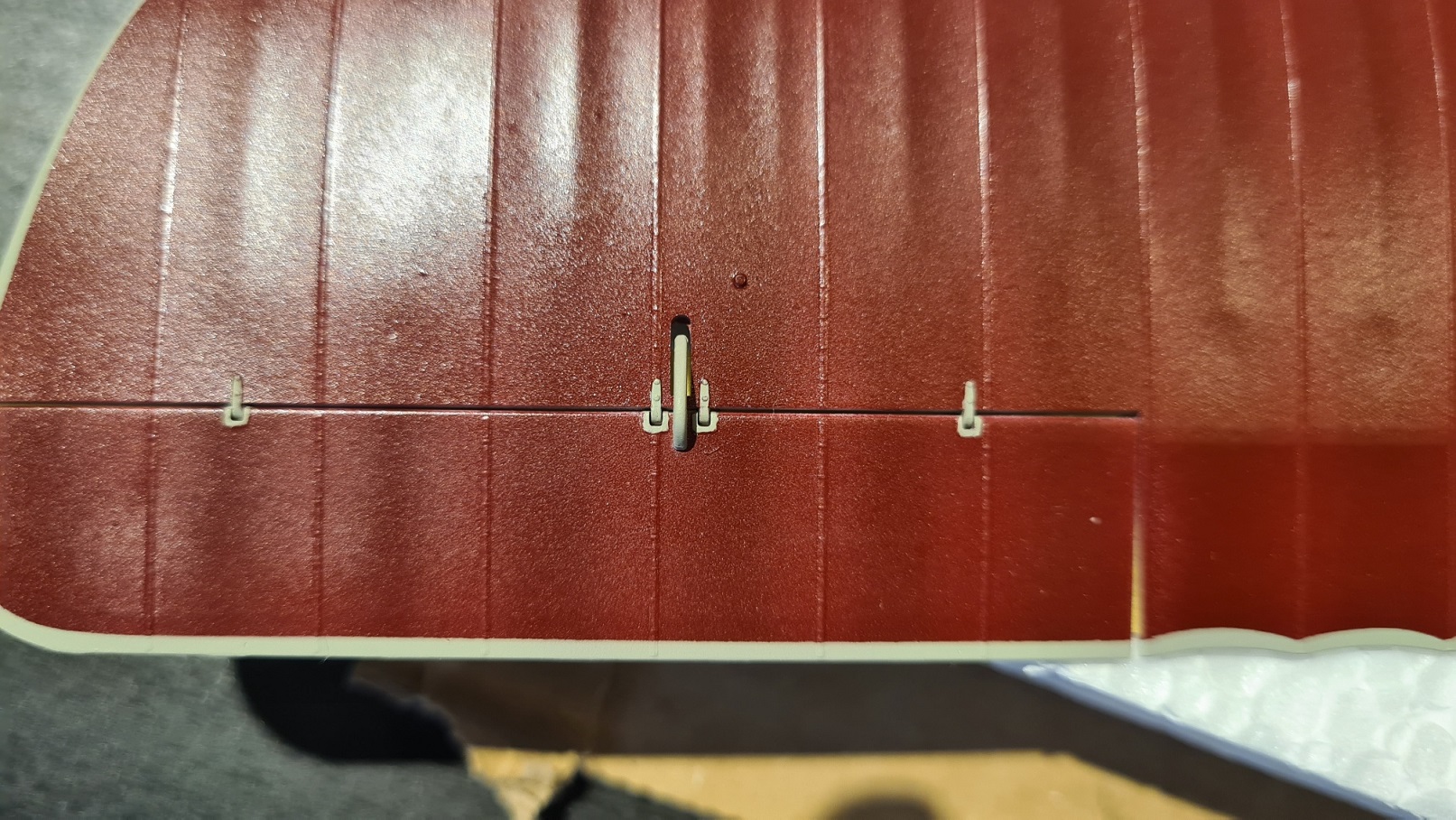 Danach kam eine Schicht Glanzlack darüber, auch wieder Tamiya TS-13 aus der Dose. Stellvertretend hierfür ein Foto des Höhenruders. Von der oberen Tragfläche hab ich leider kein Foto in diesem Schritt gemacht. Stellvertretend ein Foto des Höhenleitwerks im vergleich zur unbehandelten oberen Tragfläche. Das Ruder ist so zerbrechlich, dass ich es aufkleben musste:
