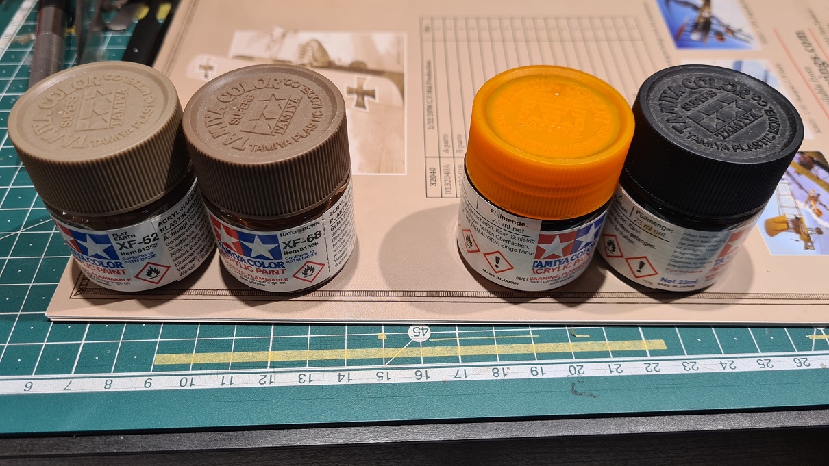 Die wurden per Pinsel nass in nass mit XF52 Flat Earth und XF68 Nato braun bemalt. Nach dem Trocknen kam eine Schicht Clear Orange etwas abgedunkelt mit schwarz drüber. Später dann noch etwas mit einem matten Lack den Glanz weggenommen.