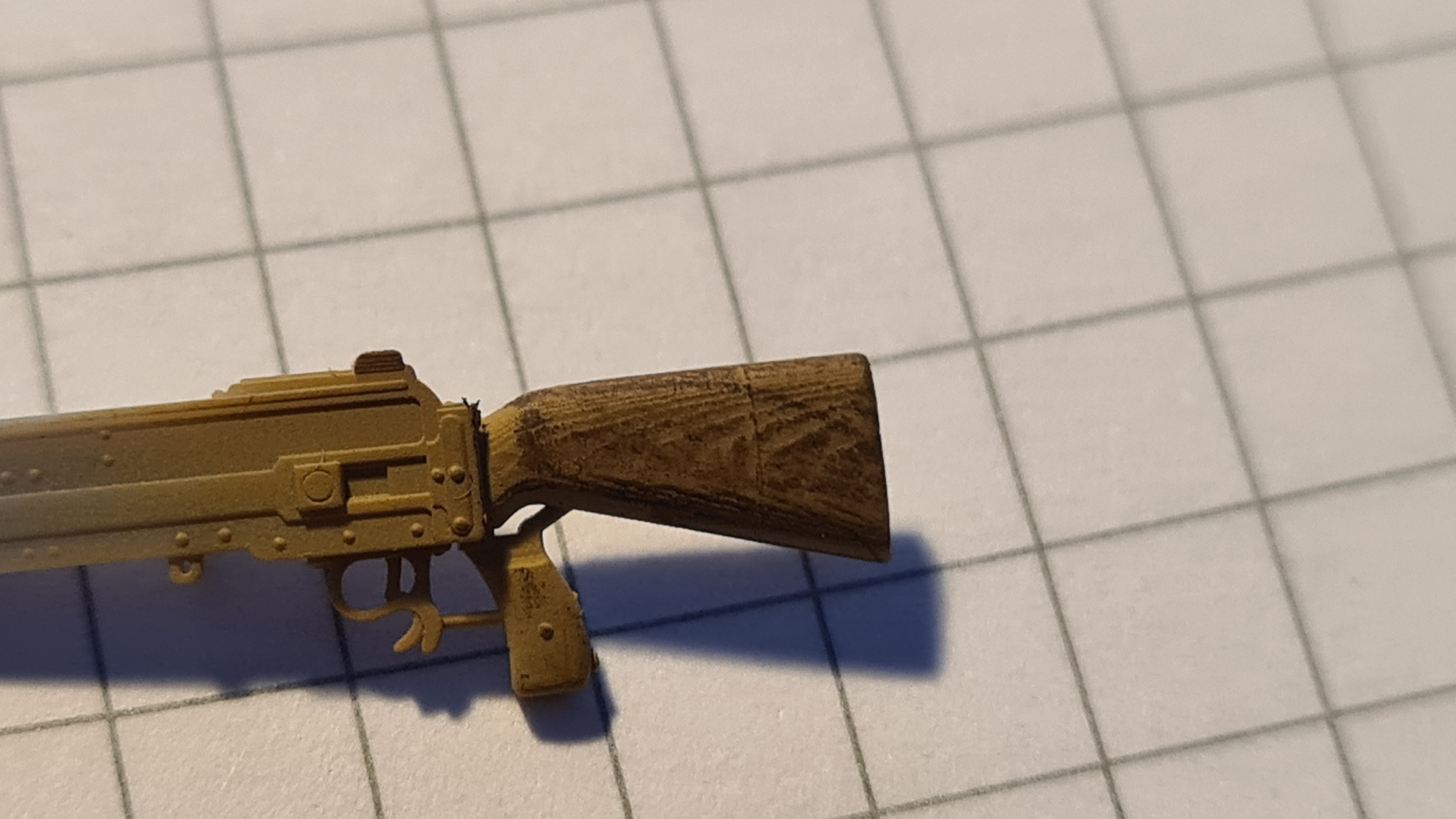 Der Holzteil wurde mit XF59 / Desert Yellow vorbehandelt. Das Resin(?)-Teil hat sogar eine erhabene Holzmaserung. Darum bin ich mit braunem Buntstift (mein AquarellbuntstiftVan-Dyck-Braun) hingegangen und habe mit der Mine seitlich drüber "gewischt".