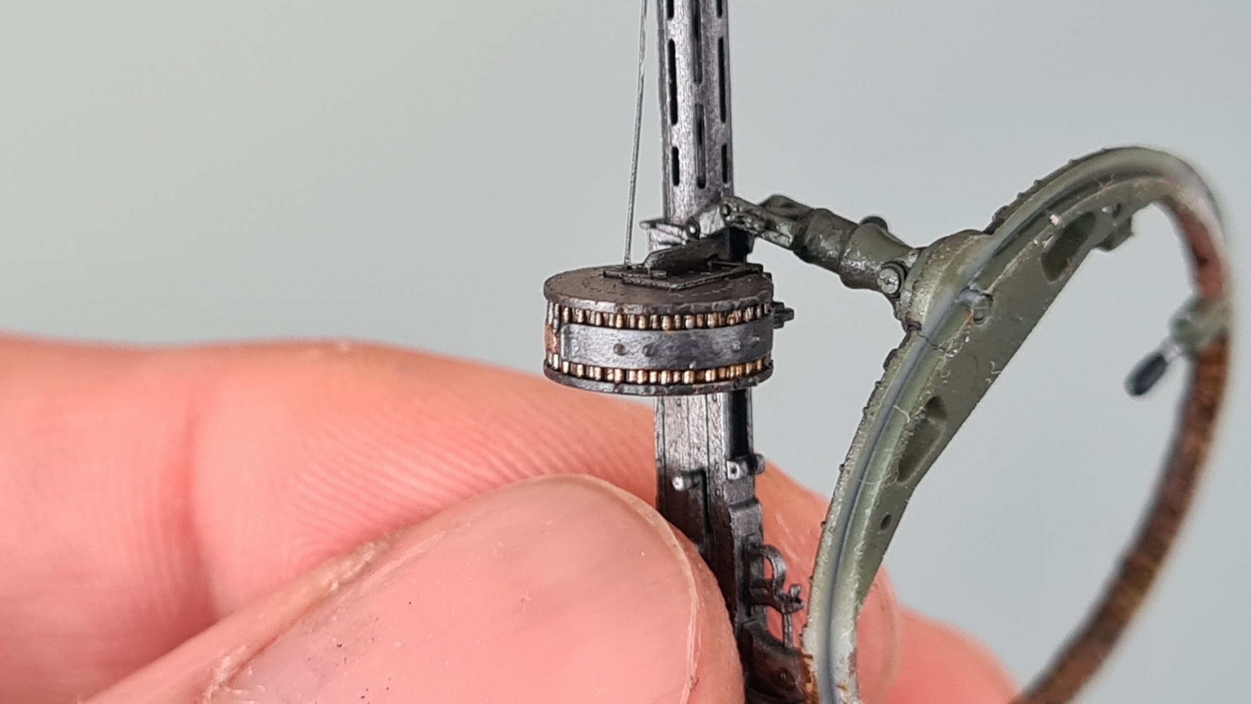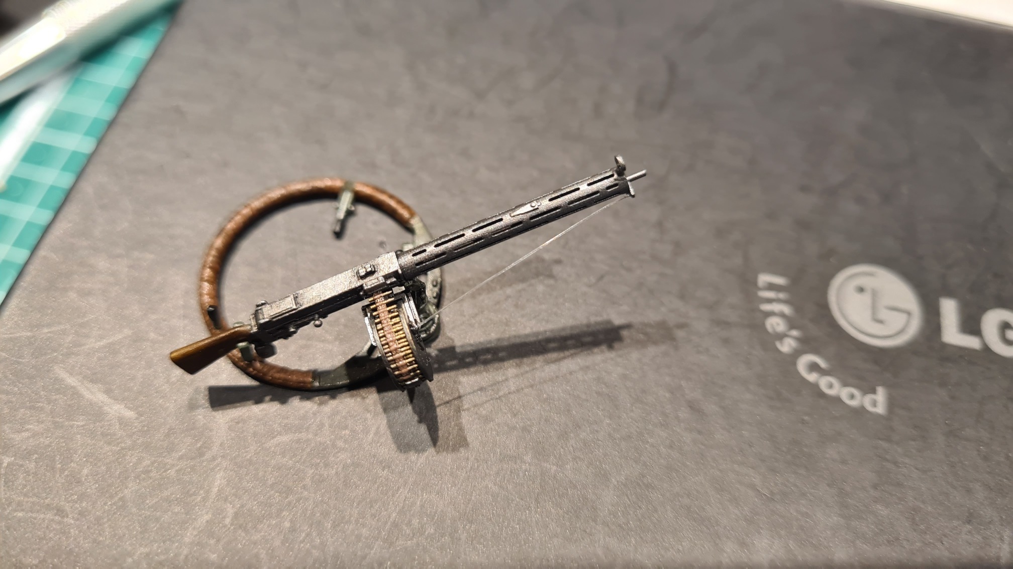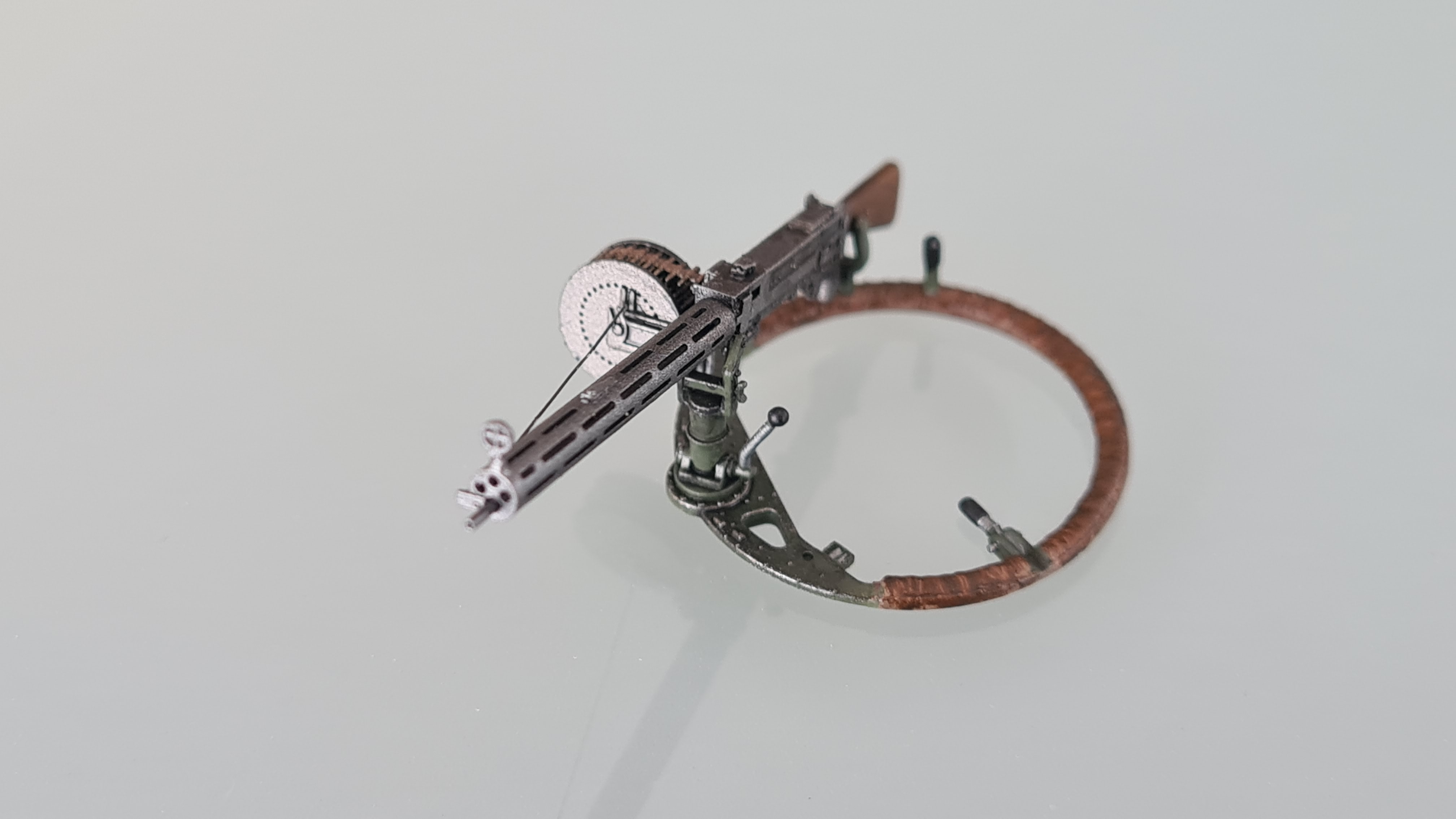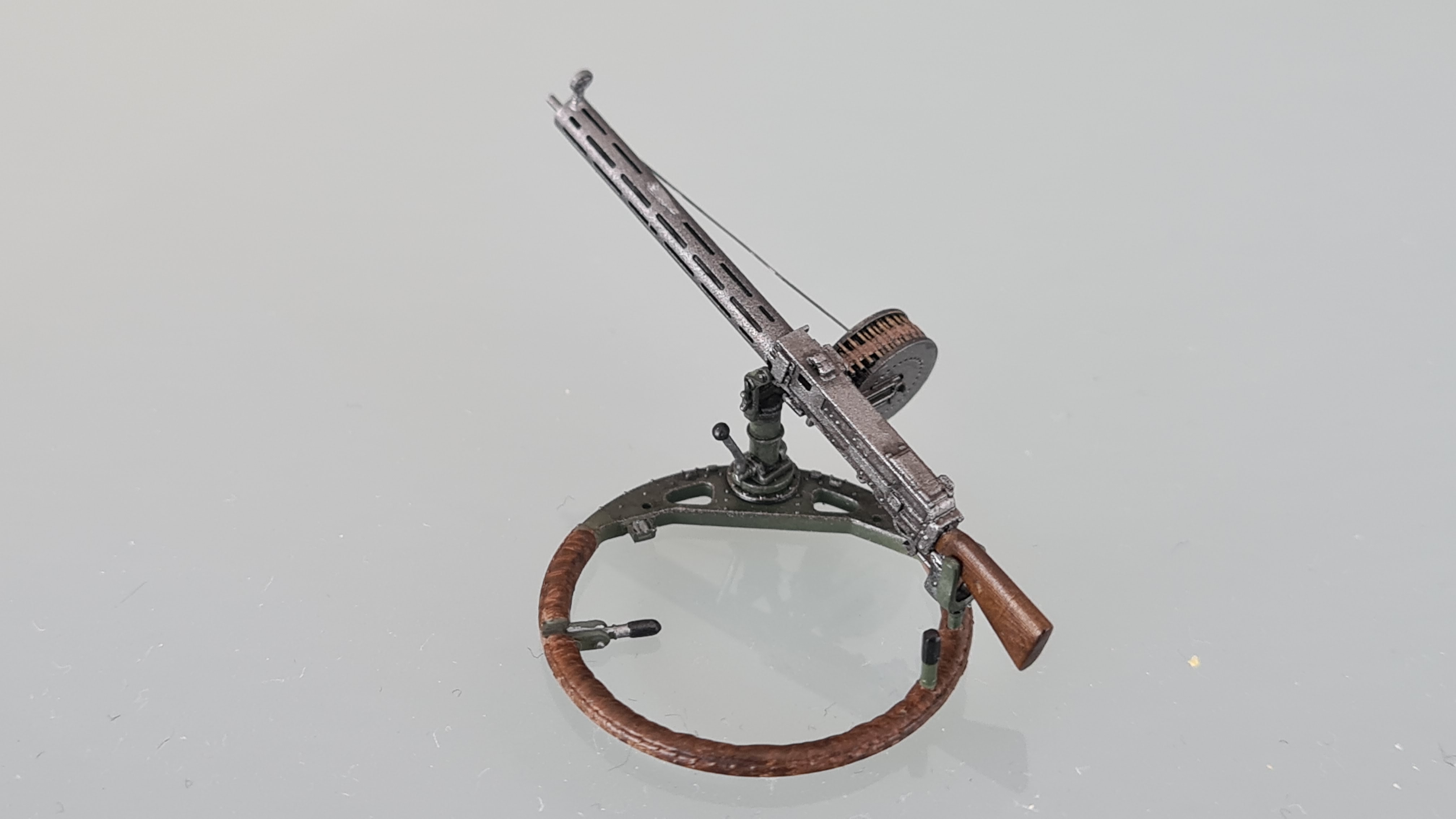 Der Faden wurde noch mit einer Mischung aus Vallejo Gunmetal und schwarz (etwa 1:1) bepinselt. Und damit ist das MG fertig. Zum Spaß einmal locker eingesteckt: