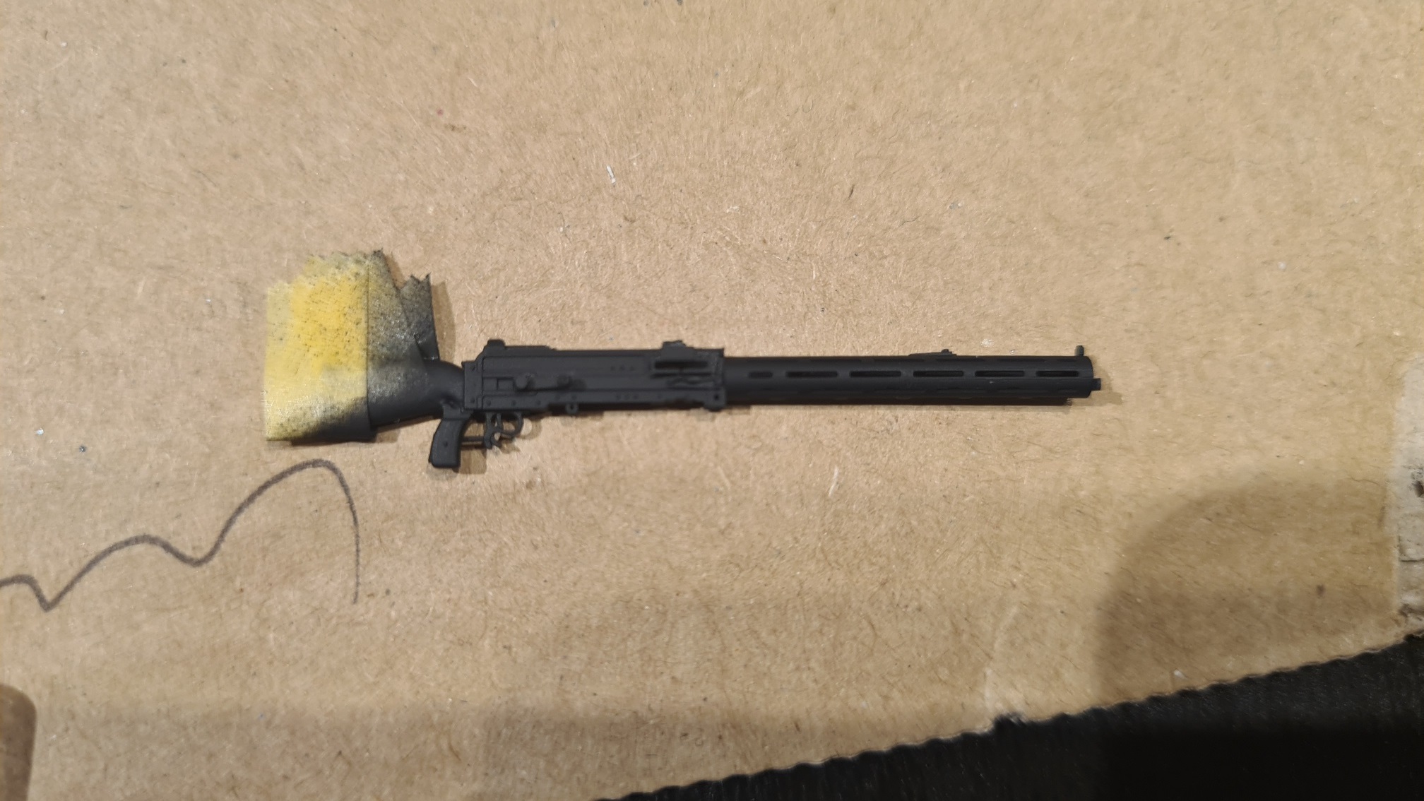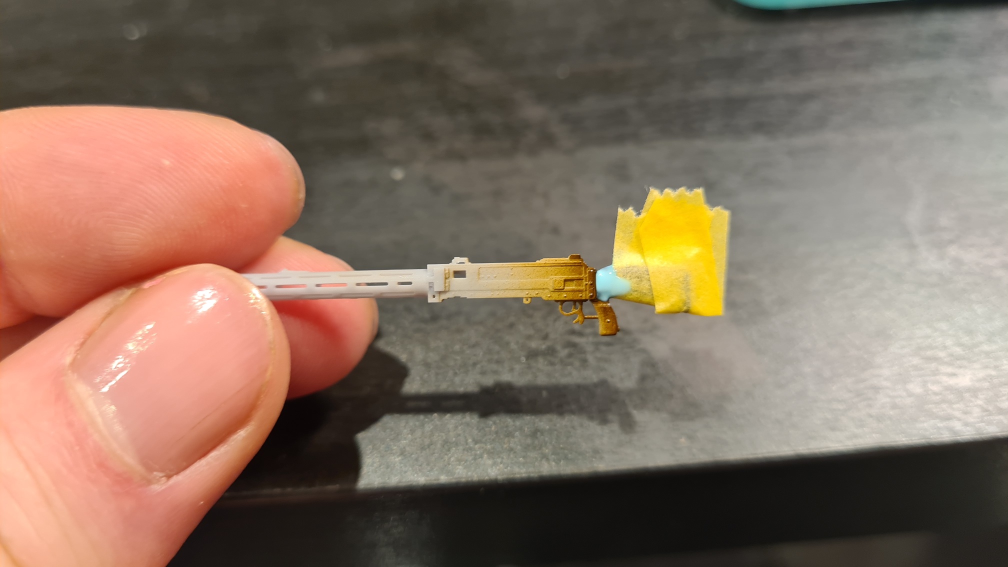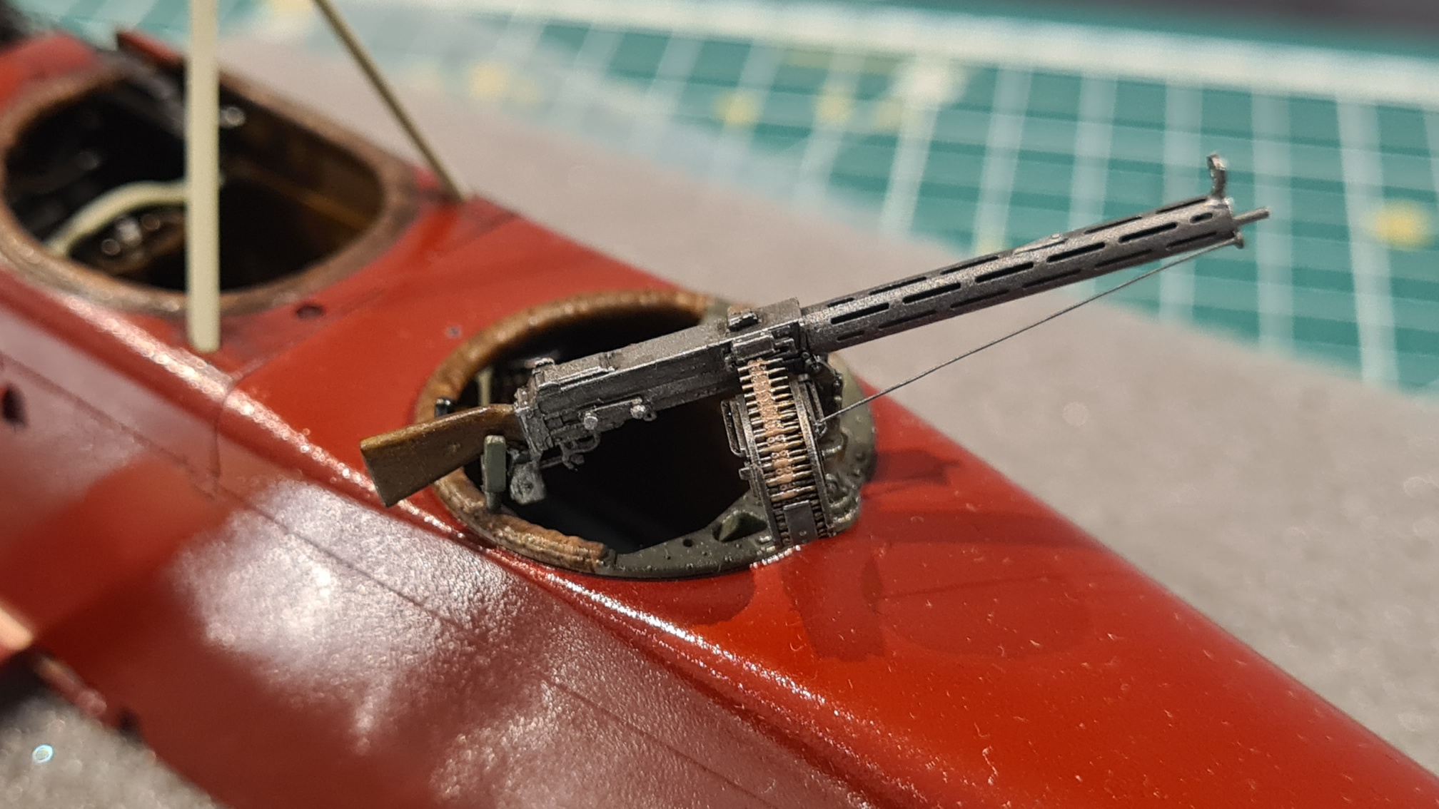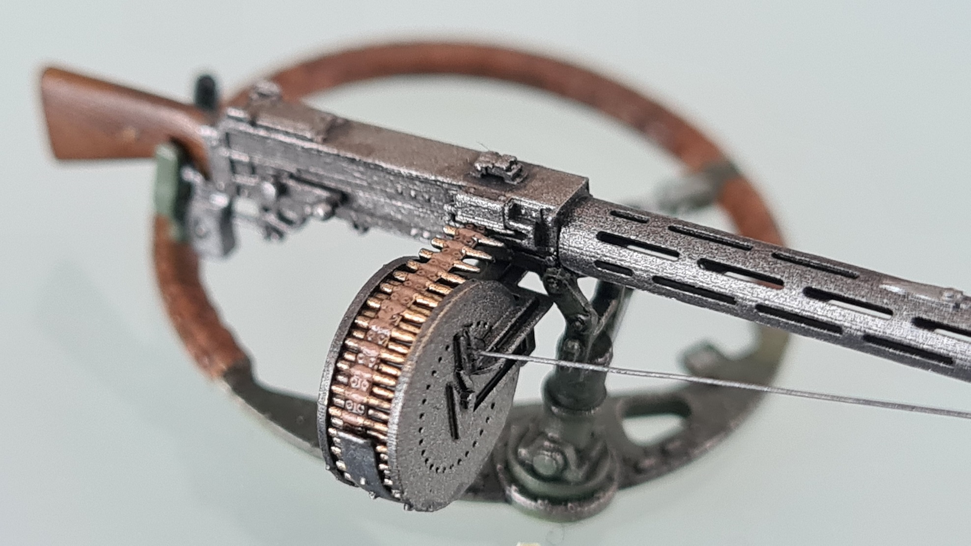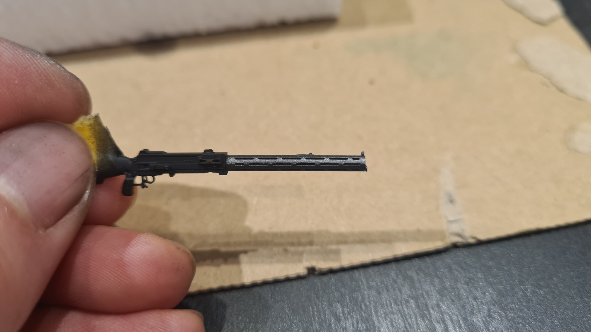 Der Faden wurde noch mit einer Mischung aus Vallejo Gunmetal und schwarz (etwa 1:1) bepinselt. Und damit ist das MG fertig. Zum Spaß einmal locker eingesteckt: