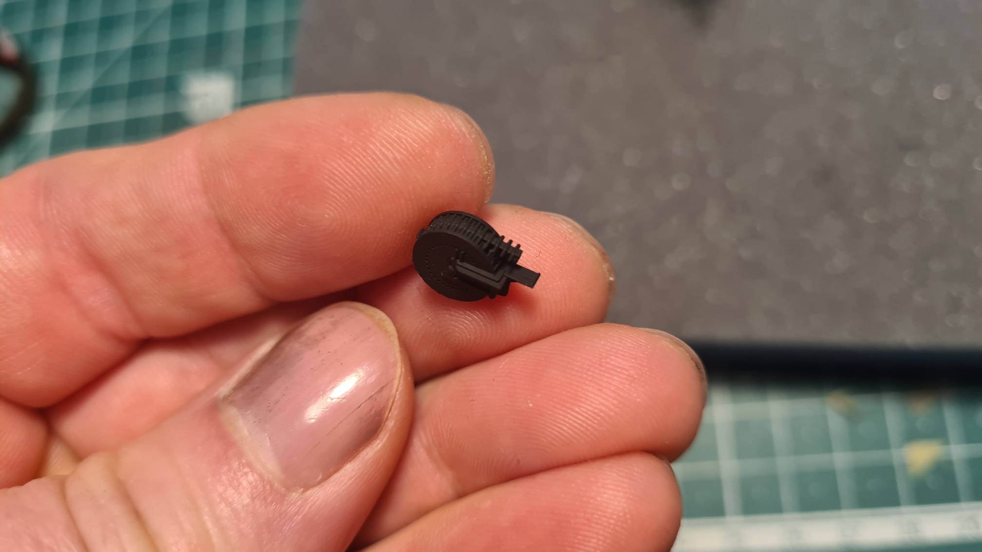 Das Ganze drehbar gelagert auf einem Kranz, bei dem der Metallbereich schonnmal entsprechend Bauanleitung graugrün (Tamiya XF65) vorgesprüht wurde: