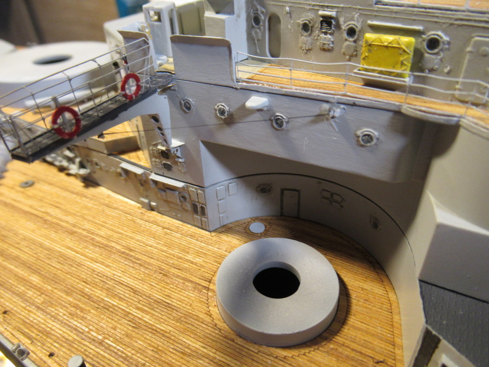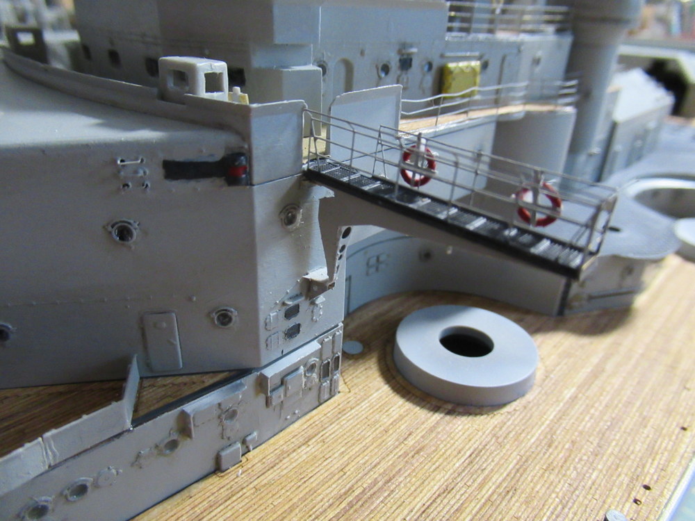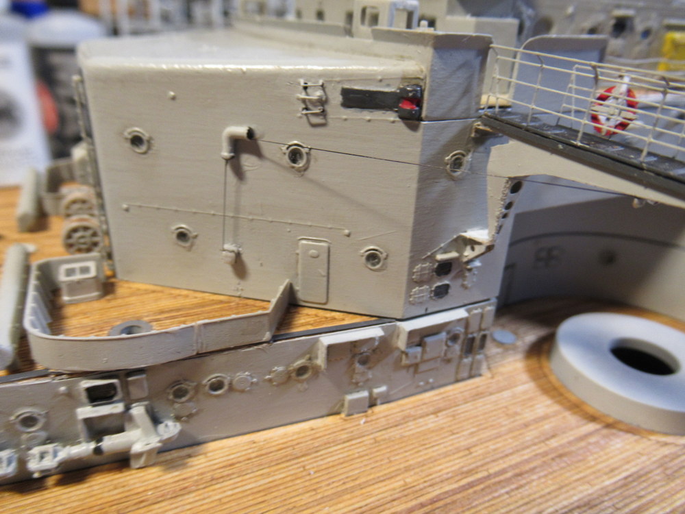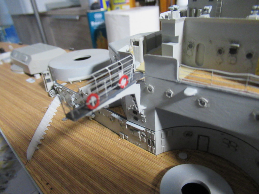 Die Brückenausleger waren gefaltet und verklebt . Zusätzlich habe ich dort noch jeweils 2 Rettungsringe samt halter verbaut . Auch ja die hängen nicht runter ...ich hab nur schief Fotographiert