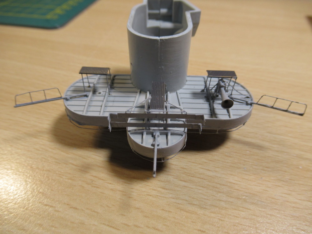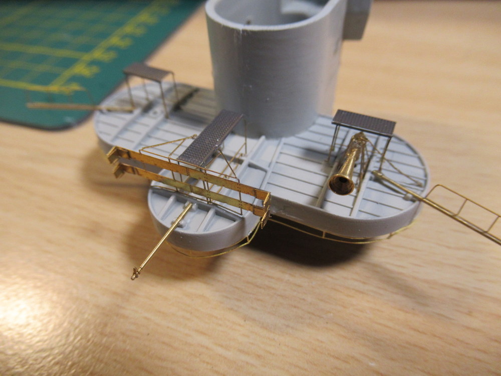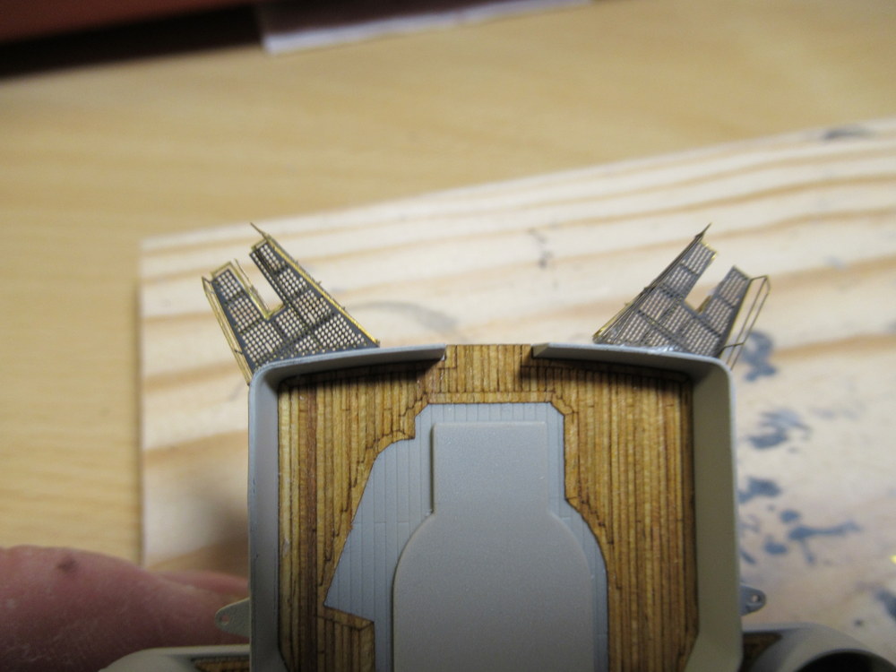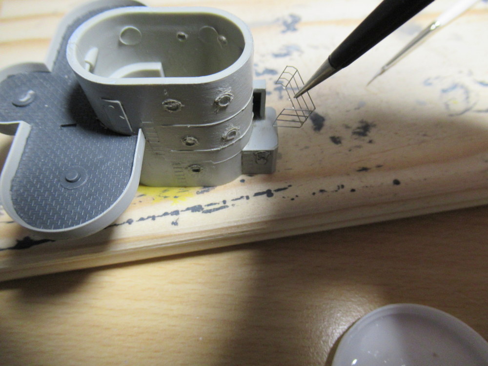 Weiter geht es mit dem vorderen Turmaufbauten . Hier mussten die Halter für die Boardkräne angebracht werden