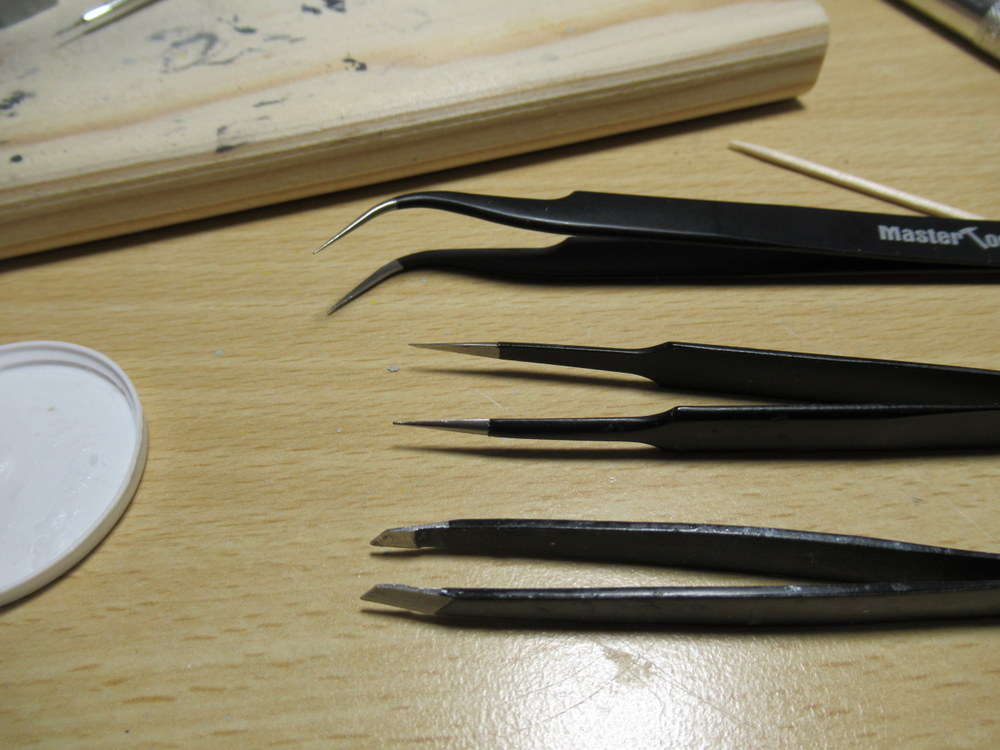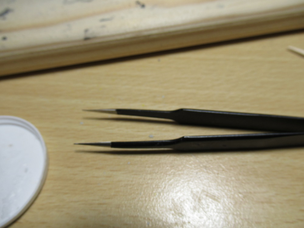 Für Kleinteile nehme ich auch eine Pinzette mit sehr feiner Spitze und für