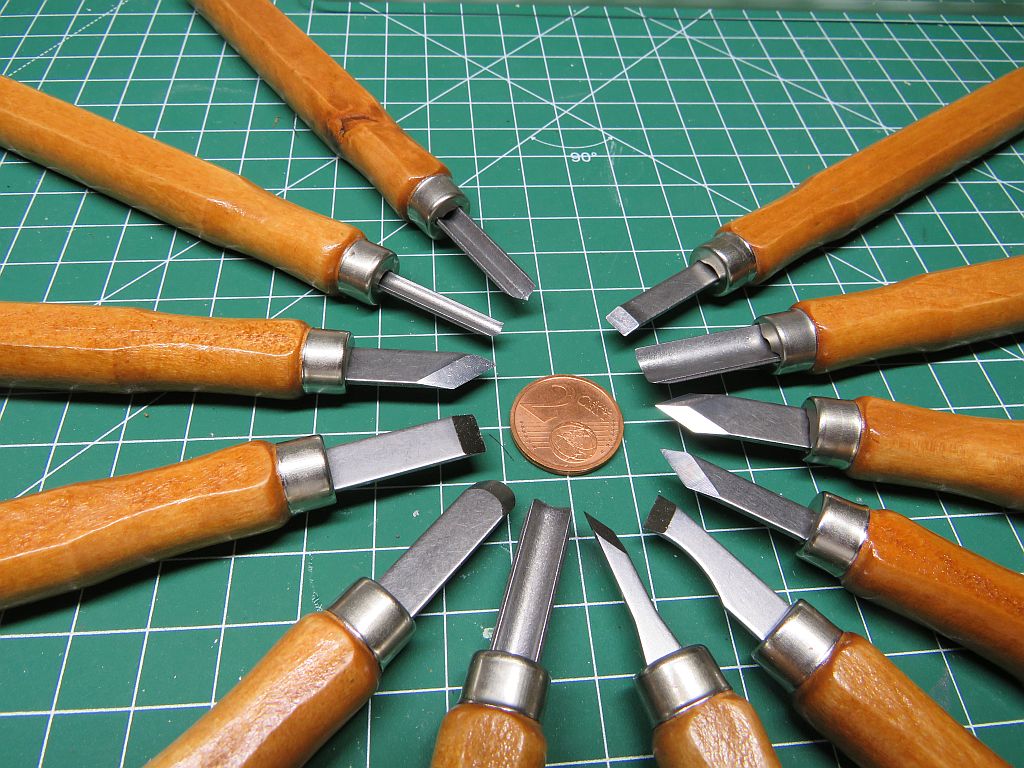 Ich habe mal werkzeugtechnisch etwas aufgerüstet; zum Ersten ein Satz Schnitzmesser mit stabilen Klingen in 12 Formen: