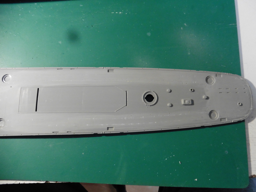 Als nächstes ging es um das Deck . Hier ist ein Schienensystem für die Minen . Die Plastikschienen müssen laut Ätzteilplan entfernt werden . Grobes Abschälen und dann viel Schleifarbeit waren von nöten .