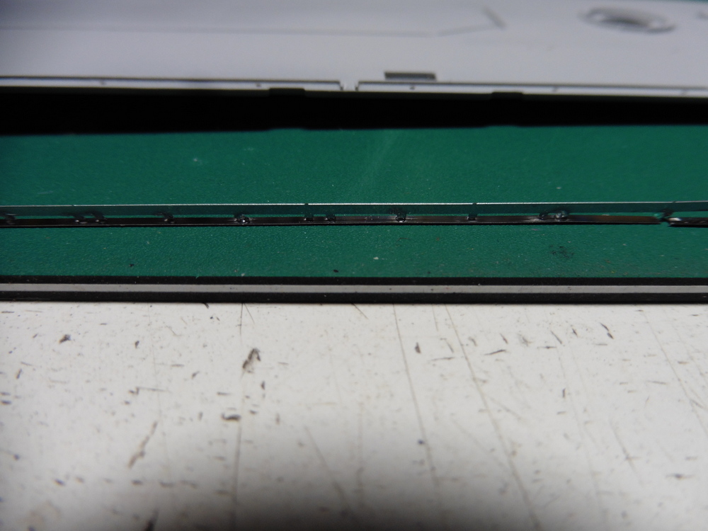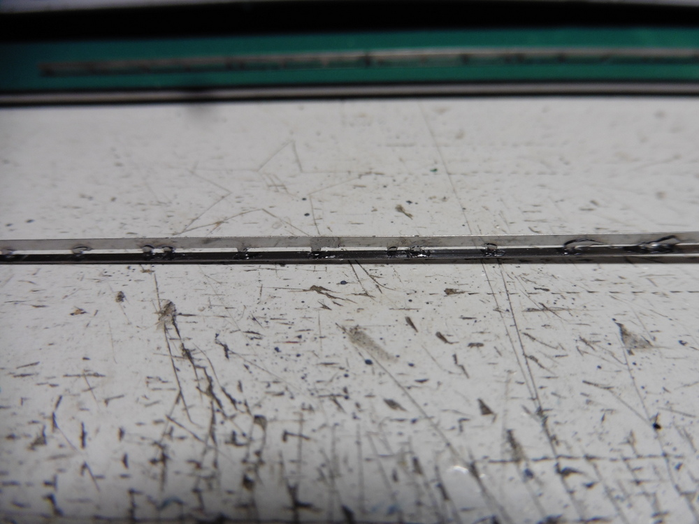 Das Entfernen ging ganz gut , zumal das verwendete Plastik relativ weich ist . Es läßt sich schlecht abkneifen aber dafür sehr gut schneiden . Nun ja die Schienen sind weg.... die Ätzteilschienen bestehen aus einer unteren langen Platte . Die Schienen hat unten kleine Haken die gebogen werden müssen . Die Länge wiederum läßt ein Verbiegen des gesamten Teils zu.