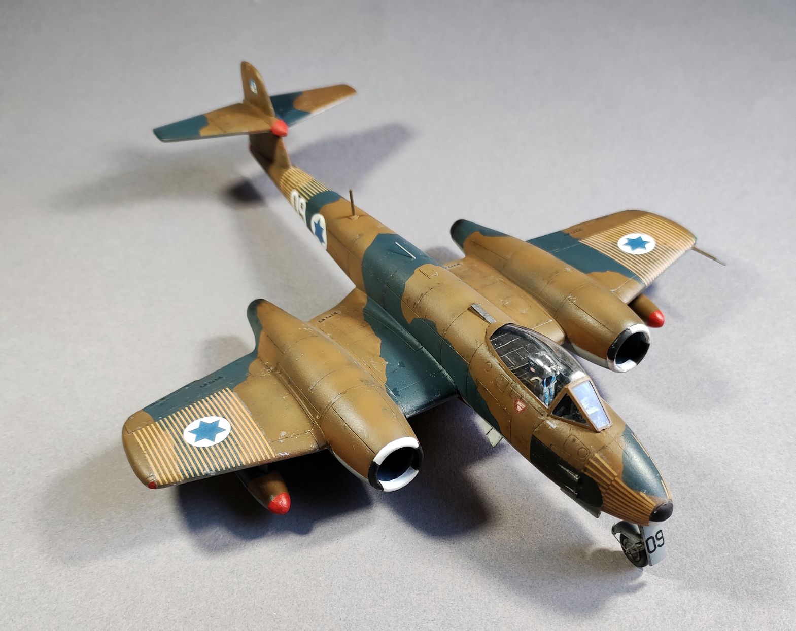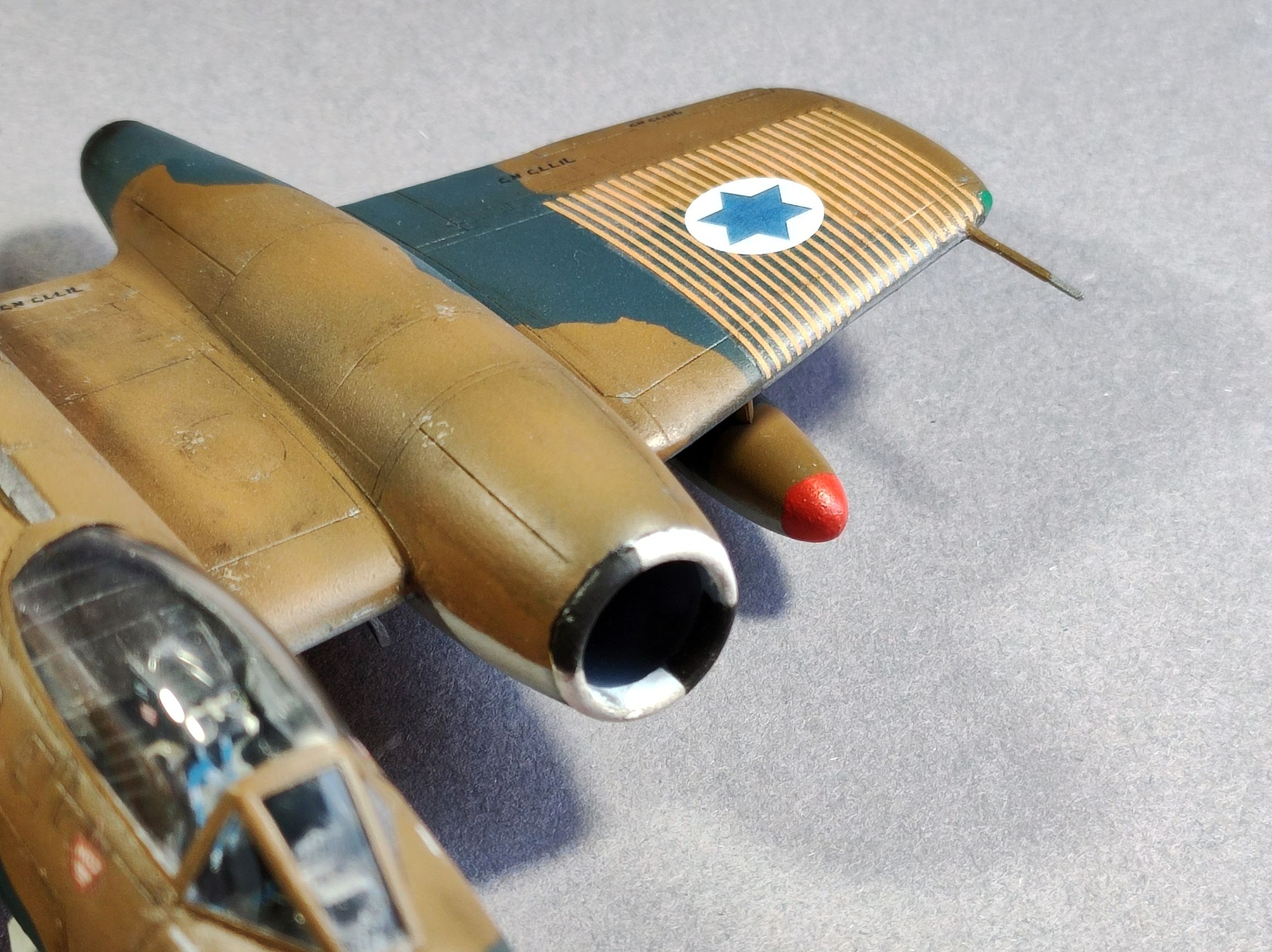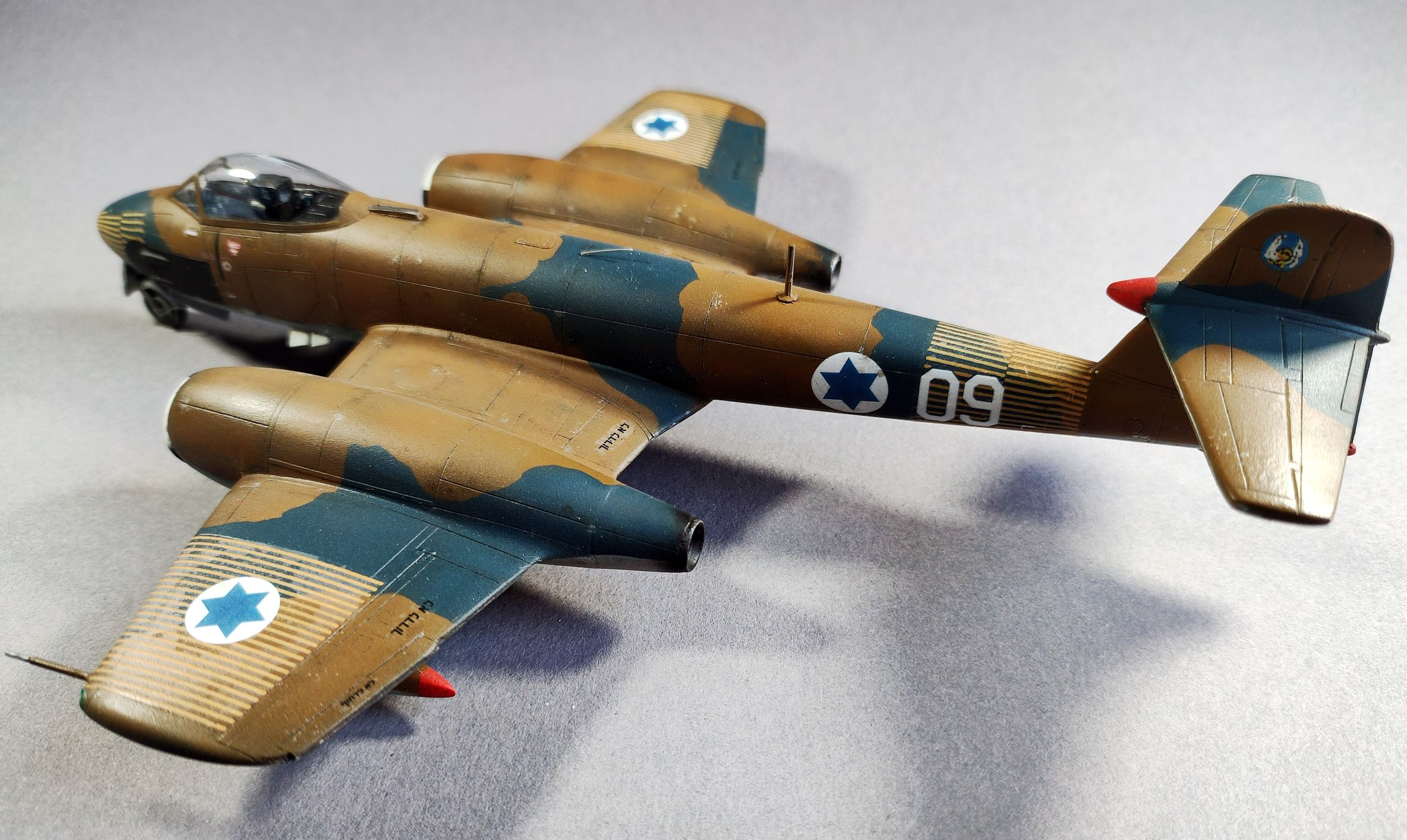Heute kann ich euch das Ergebnis meines letzten Projekts präsentieren. Es handelt sich umd die Gloster Meteor Mk. 8 unter dem Davidstern, wie sie noch Anfang der 60er Jahre als Zielflugzeug verwendet wurde. Bereits im Koreakrieg hatte man feststellen müssen, dass der britische Düsenjäger erster Stunde den neuen Sowjetischen MiGs hoffnungslos unterlegen waren. Im zweiten Konflikt, wo dieses Flugzeug mitwirkte, wurde das Muster auf beiden Seiten, also der Arabischen und der Israelischen, verwendet.