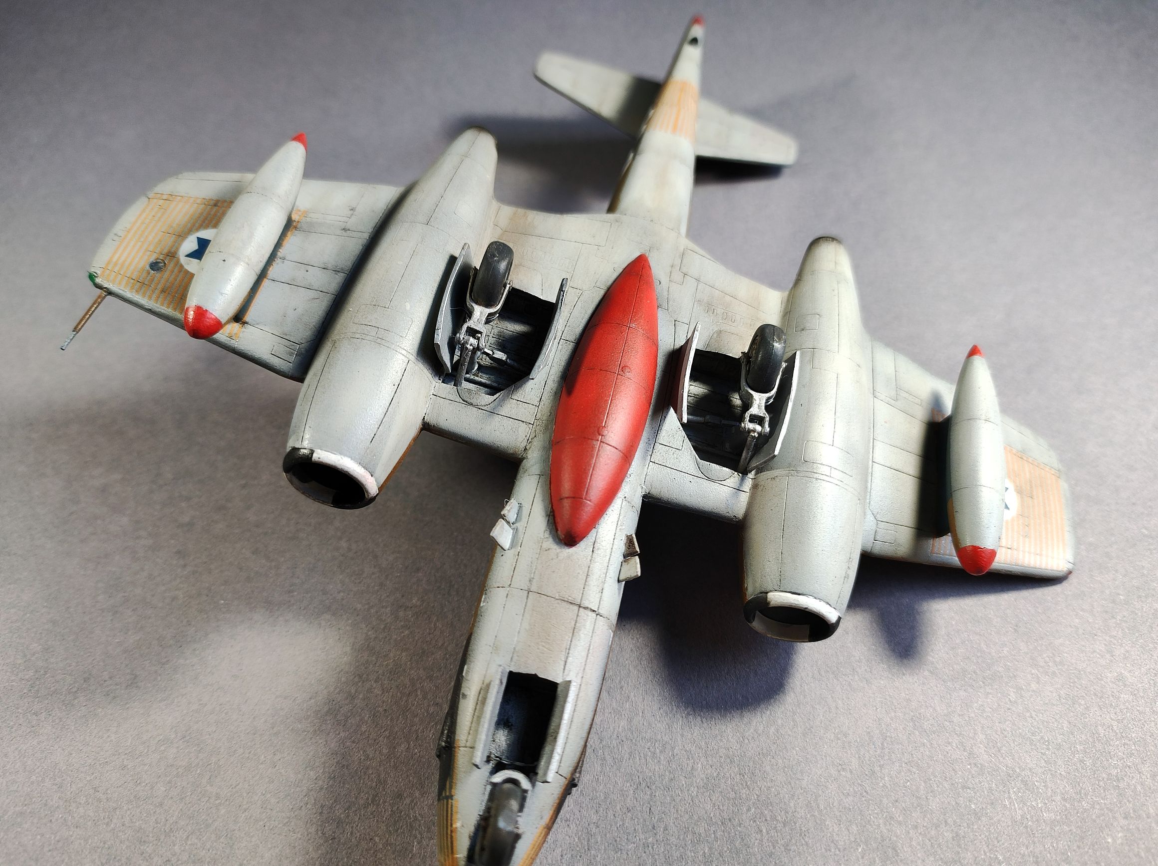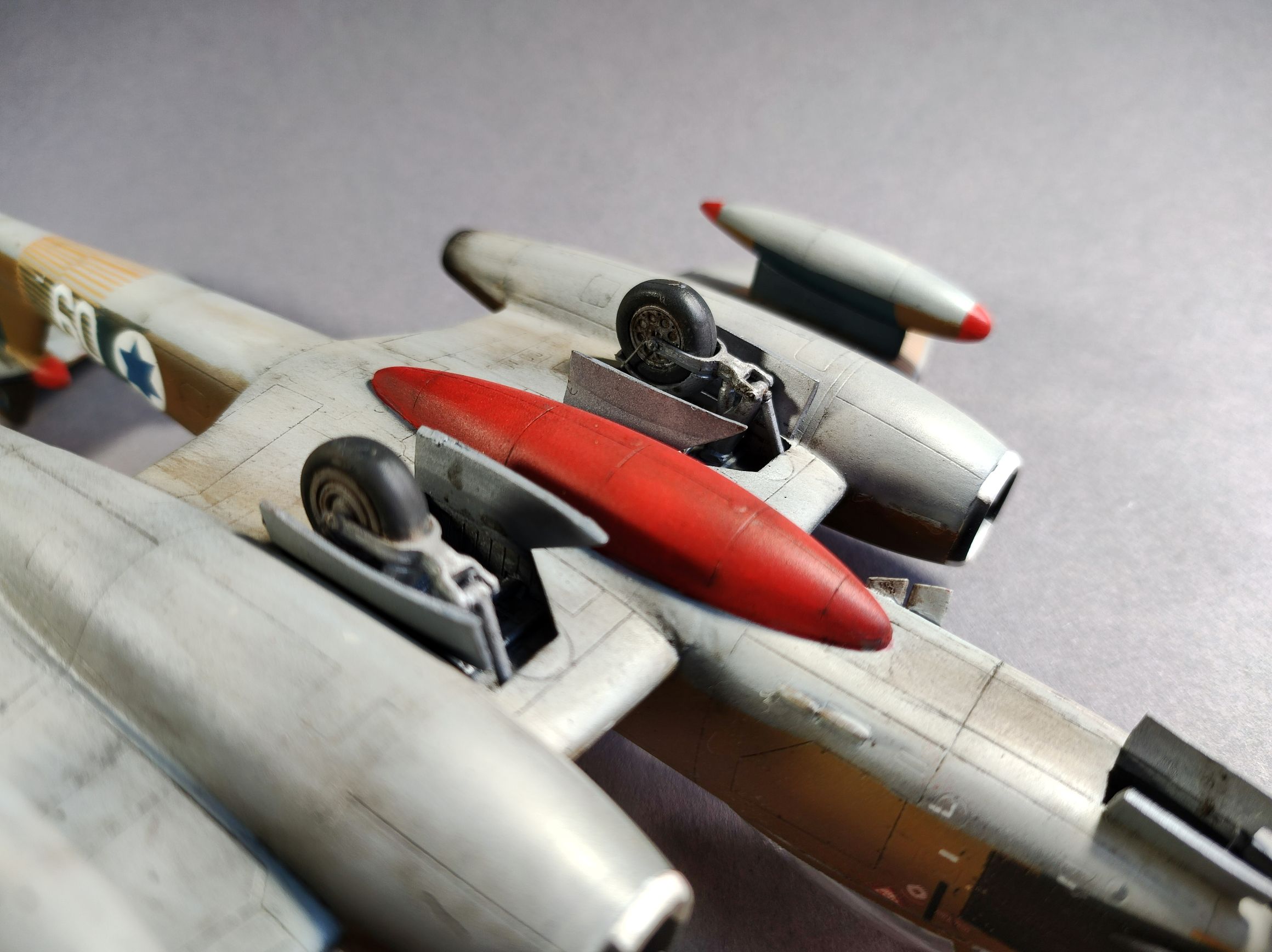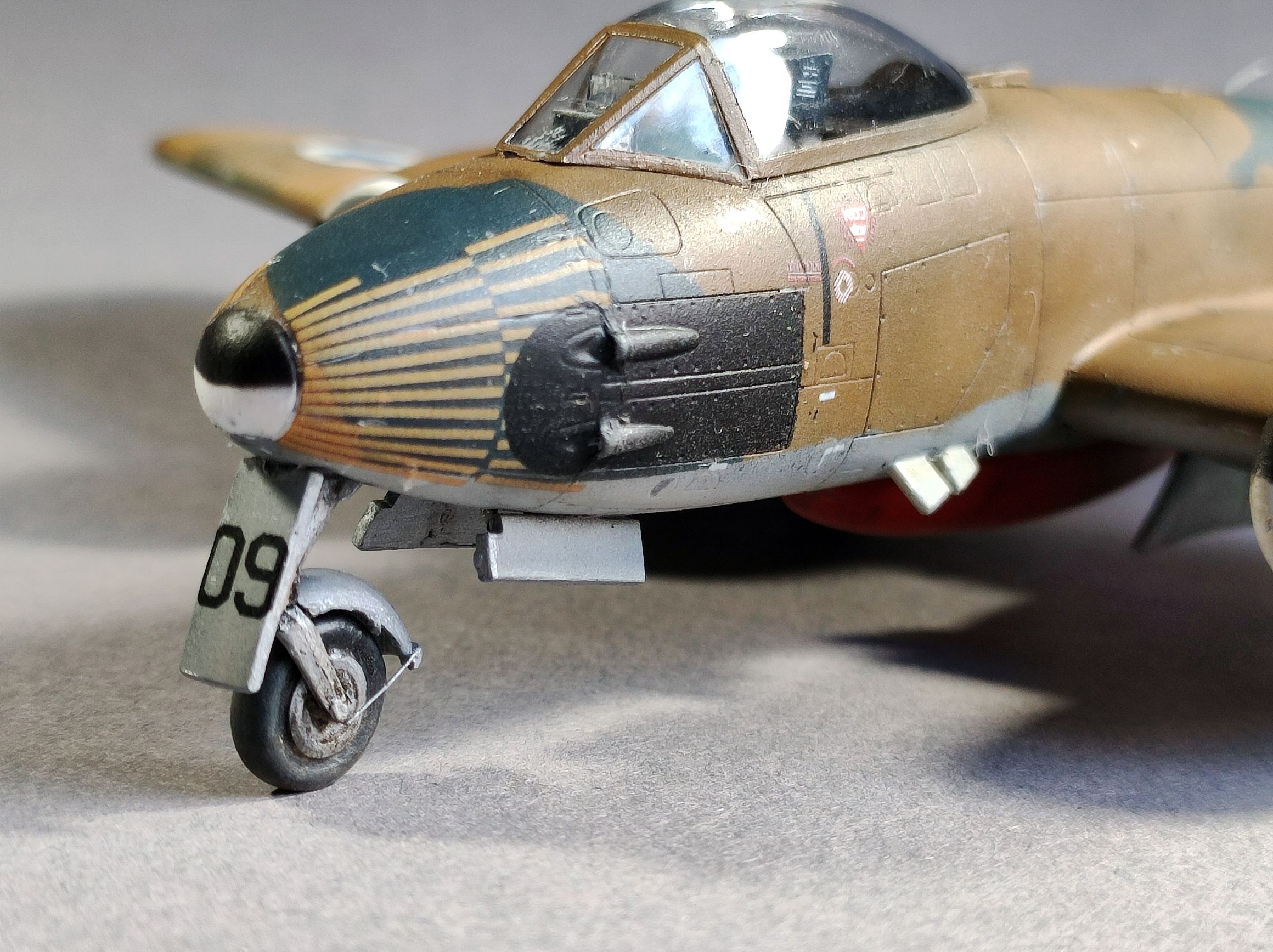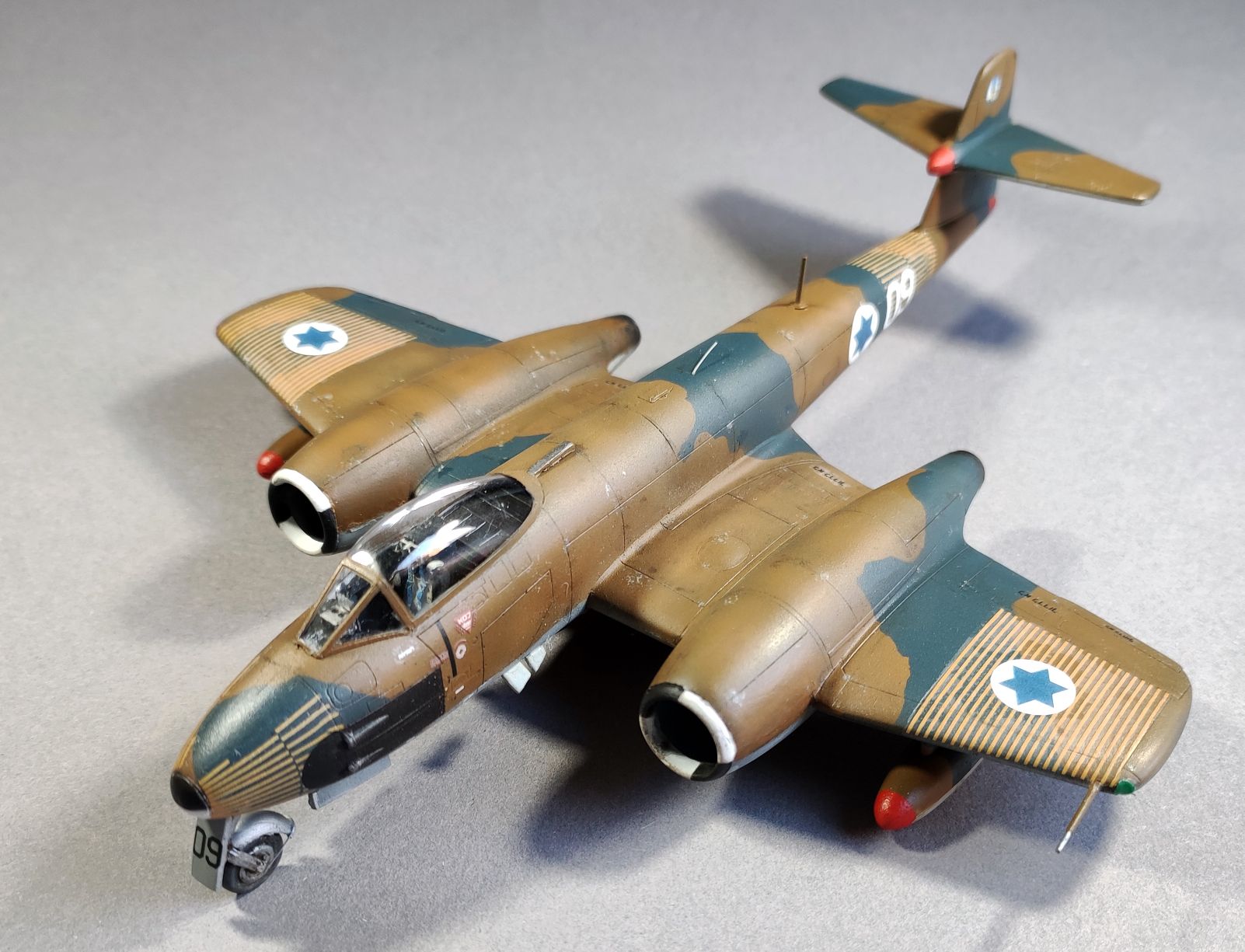 Heute kann ich euch das Ergebnis meines letzten Projekts präsentieren. Es handelt sich umd die Gloster Meteor Mk. 8 unter dem Davidstern, wie sie noch Anfang der 60er Jahre als Zielflugzeug verwendet wurde. Bereits im Koreakrieg hatte man feststellen müssen, dass der britische Düsenjäger erster Stunde den neuen Sowjetischen MiGs hoffnungslos unterlegen waren. Im zweiten Konflikt, wo dieses Flugzeug mitwirkte, wurde das Muster auf beiden Seiten, also der Arabischen und der Israelischen, verwendet.