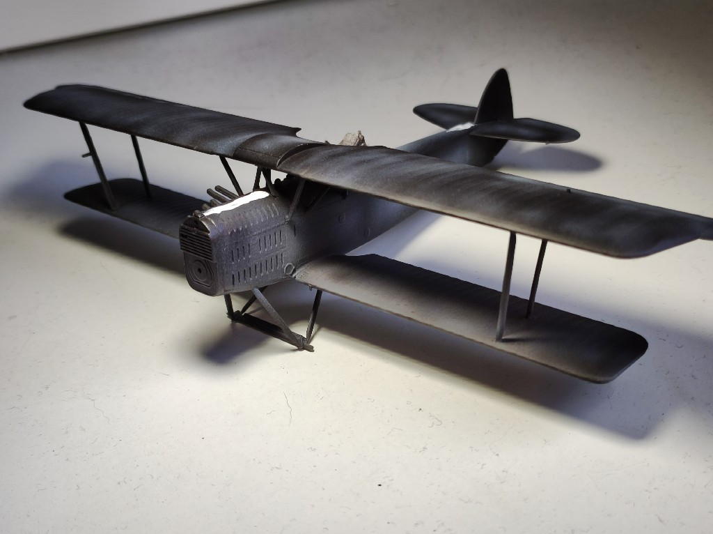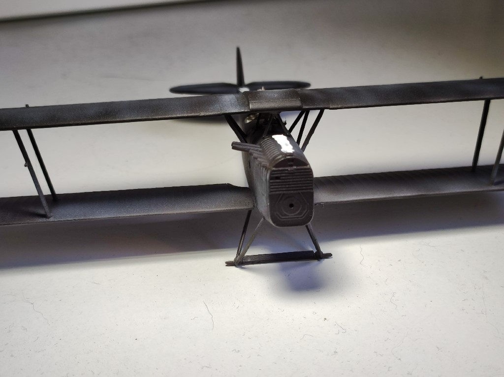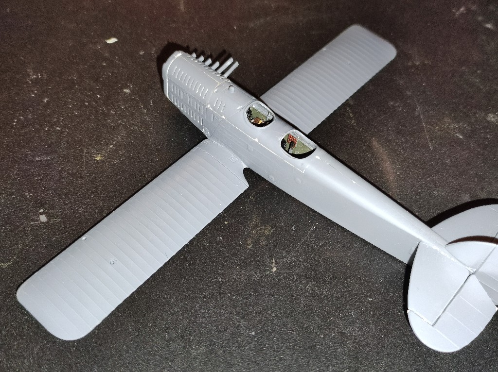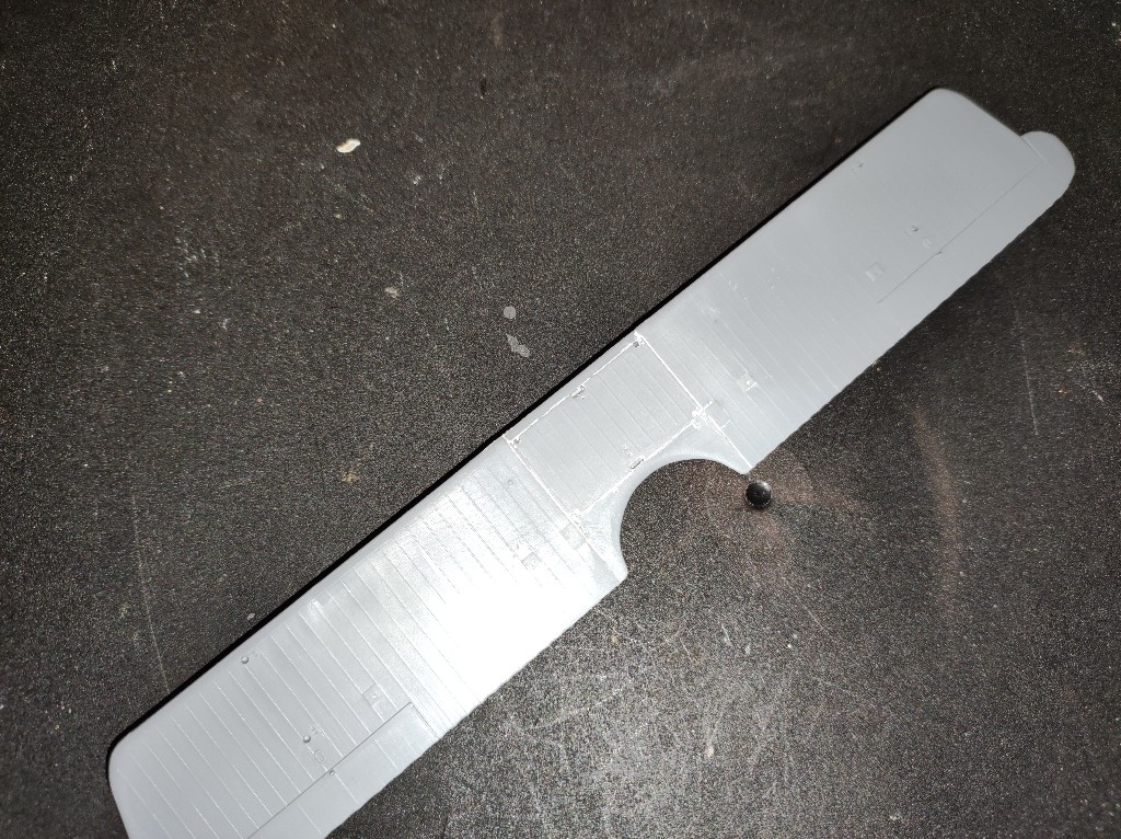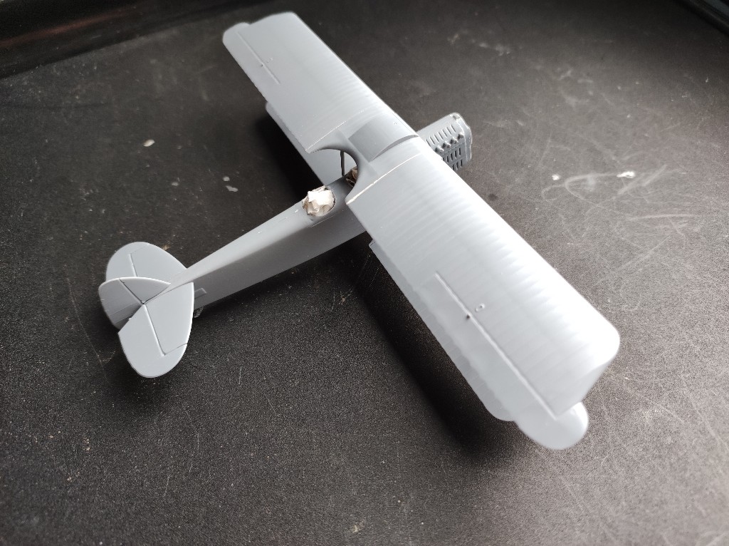 Hier mussten die Spalte auf alle Fälle ordentlich verschlossen werden. Auf der Unterseite sind bereits die Löscher für die Streben zu sehen, die später den Oberflügel mit dem Rumpf verbinden.