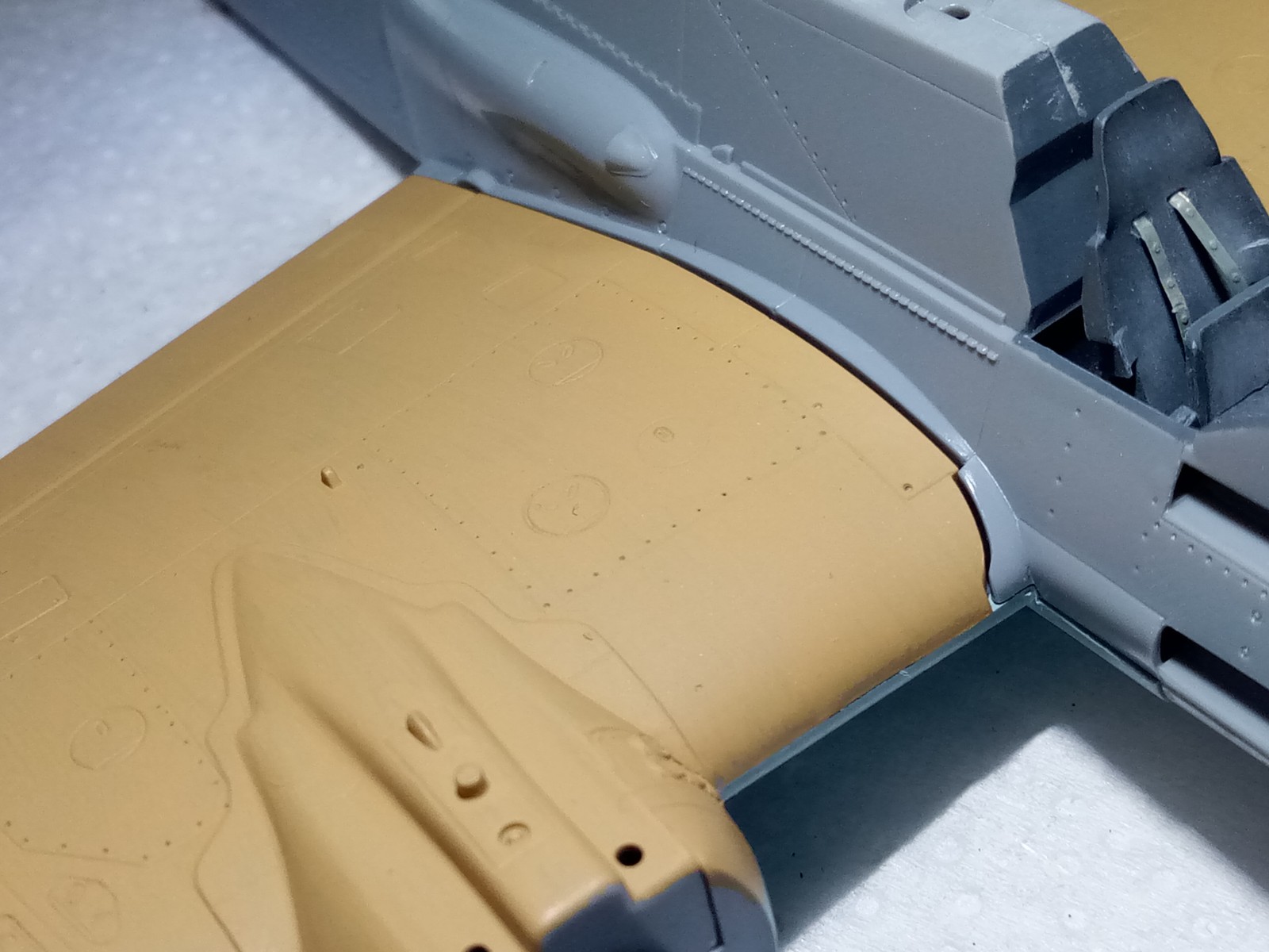 In solchen Fällen verwende ich einen schmalen Streifen Alu-Haushaltfolie, den ich der Länge nach senkrecht in den Spalt schiebe. Dadurch erreiche ich eine Isolierung der bemalten Tragfläche. Auf der Rumpfseite wird dann Spachtelmasse eingestrichen bzw. eingefüllt. Nachdem Trocknen und Abnehmen der Tragflächen lässt sich der Alu-Streifen sauber abziehen und ich habe auf der Tragflächenseite ein glatte Kante. Die Spachtelmasse am unbemalten Rumpf kann dann einfach verschliffen werden bis es passt. Gutes Gelingen!