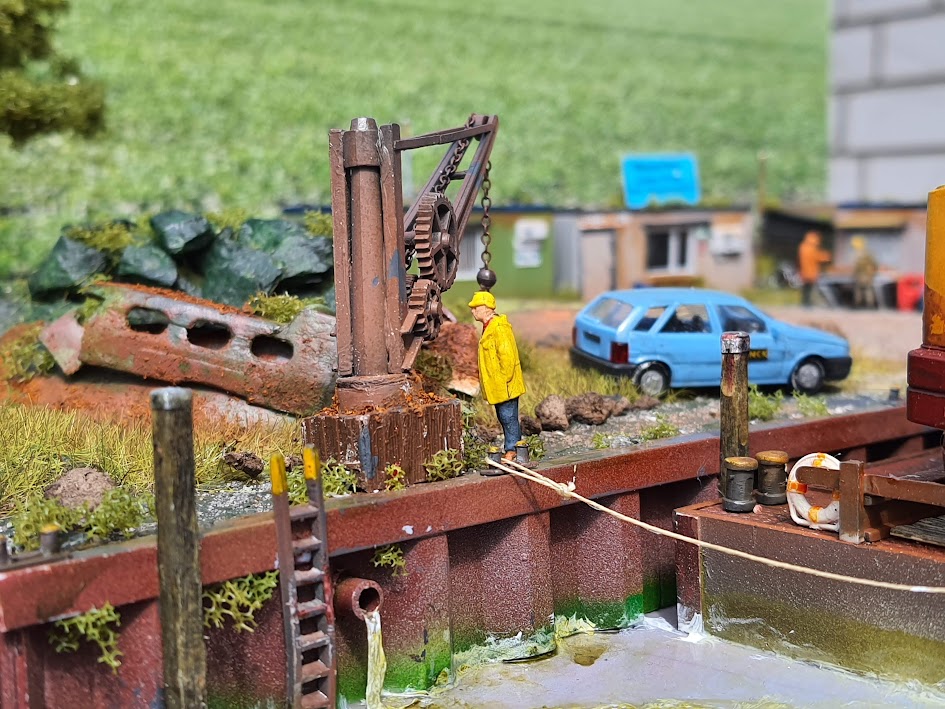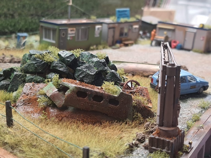 Der Haufen mit Basaltblöcken (zur Uferbefestigung) besteht aus Splitt und ist ,mit Heißkleber, auf einen Styrodur Block aufgeklebt.