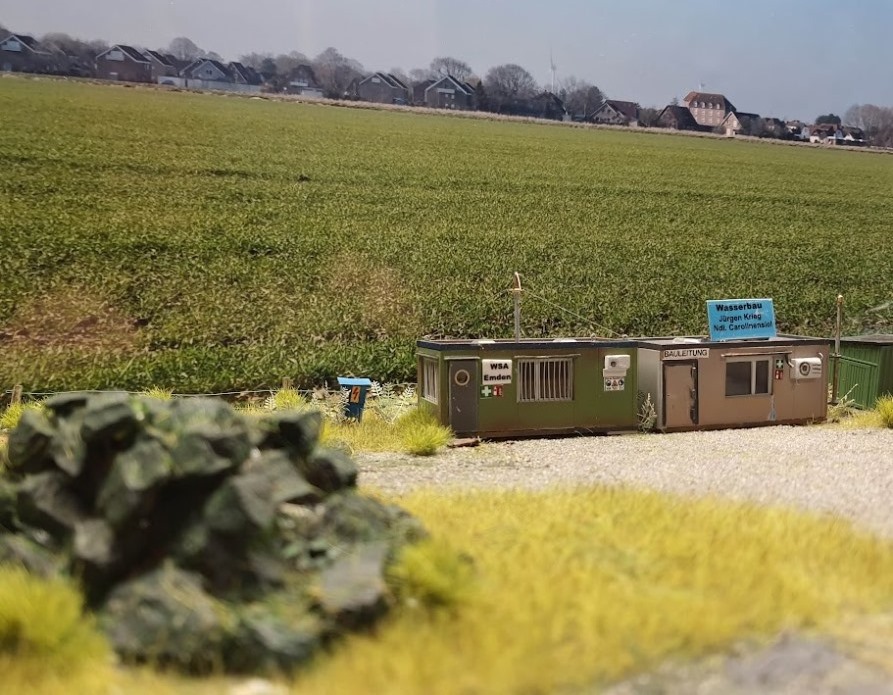 Das Baubüro des WSA Emden. Auch dieser Container erhielt eine neue Tür und Gittervor den Fenstern. Die Gitter sind aus 0,3 mm Silberdraht gebogen. Baustellen Typische Warnhinweise und Hinweisschilder sind aus dem Netz heruntergeladen und entsprechend verkleinert.