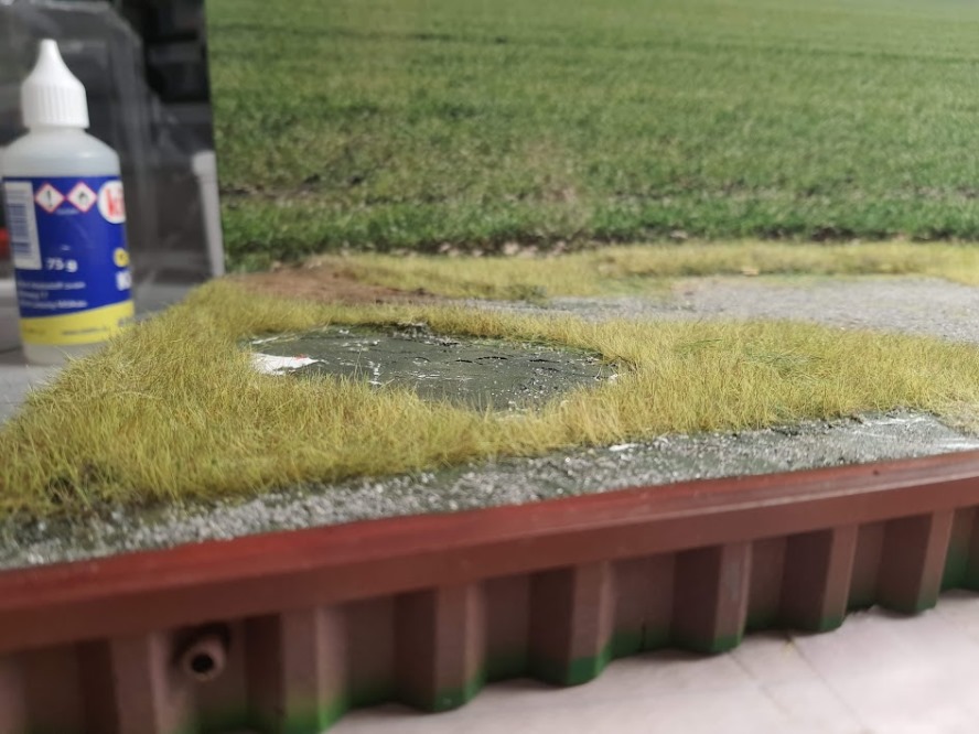 Es geht an´s begrasen.Es soll statisches Gras verwendet werden. Die Flächen, die nicht begrast werden sind mit Papp Masken abgedeckt. Das Hintergrundbild ist neu und passt deutlich besser.