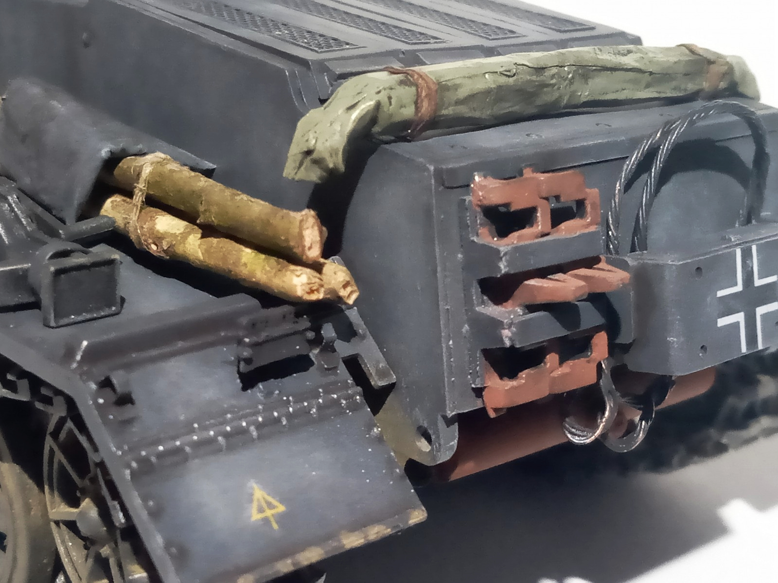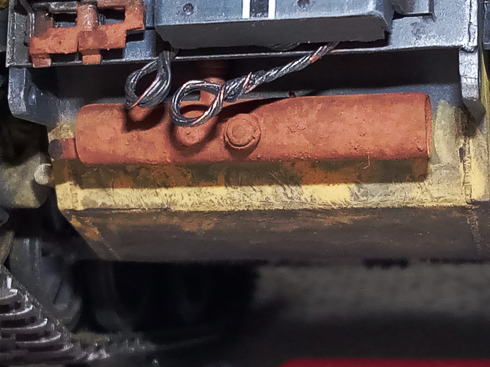 Hier aber drauf "gespritzt" Feuchten Pinsel über Klinge schnalzen lassen mit Rosttönen.So siehts aus nach schwarzen Ölwash und Trockenbürsten.