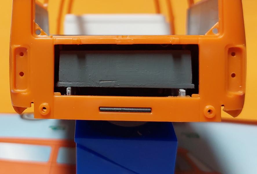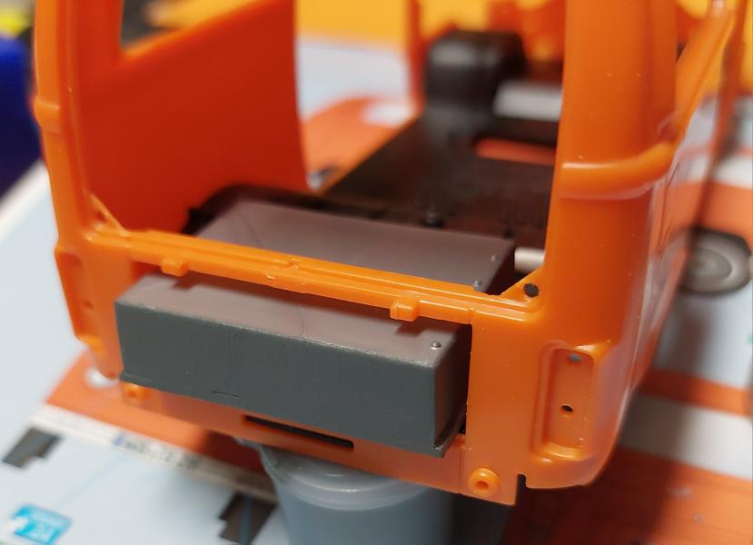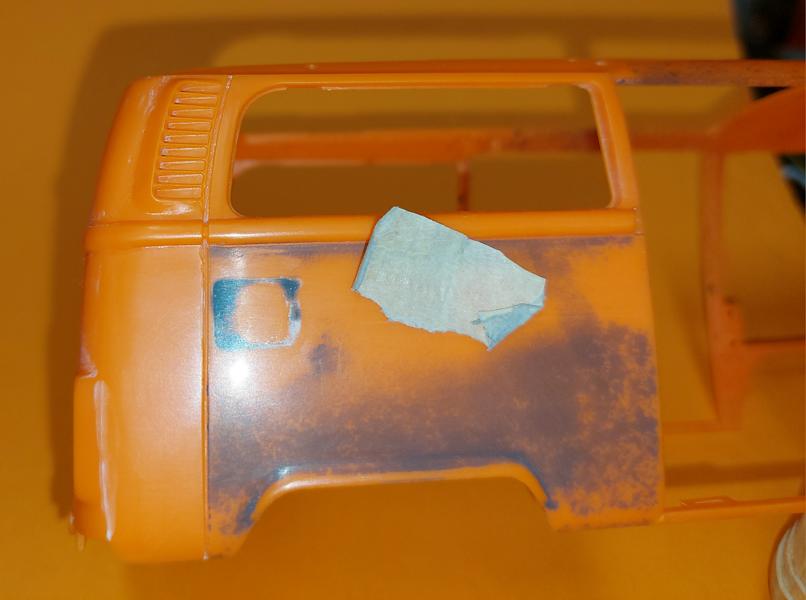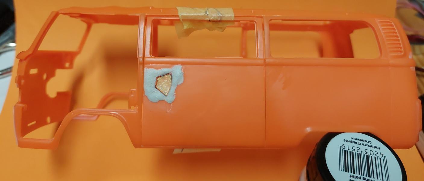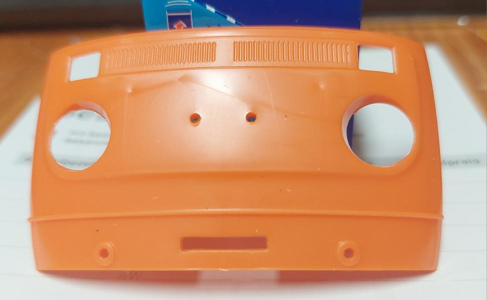 Die Nase, hier auch wie beim Feuerwehr Bulli , mit Kleber und Sekundenkleber werden die Senkstellen gefüllt und verschliffen. Nur die Löcher für's "VW"-Zeichen wurden zuerst mit Resten zugeklebt.