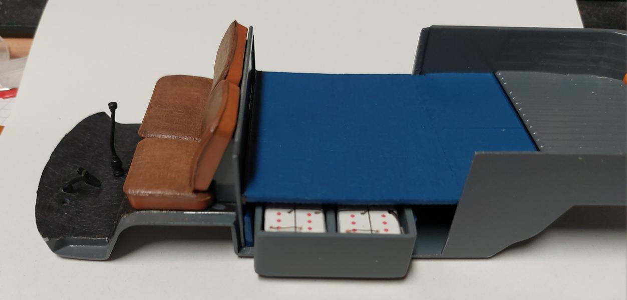 Das Innere des Busses wurde in #77 Aqua Color eingefärbt und dann mit Dosen Klarlack überzogen. Die Sitze wurden mit Krepp "strukturiert" und schließlich bemalt, "gewasht" und trockenbemalt. Die Öffnung für das Kupplungspedal wurde verschlossen und danach gab es einen Krepp-Belag.