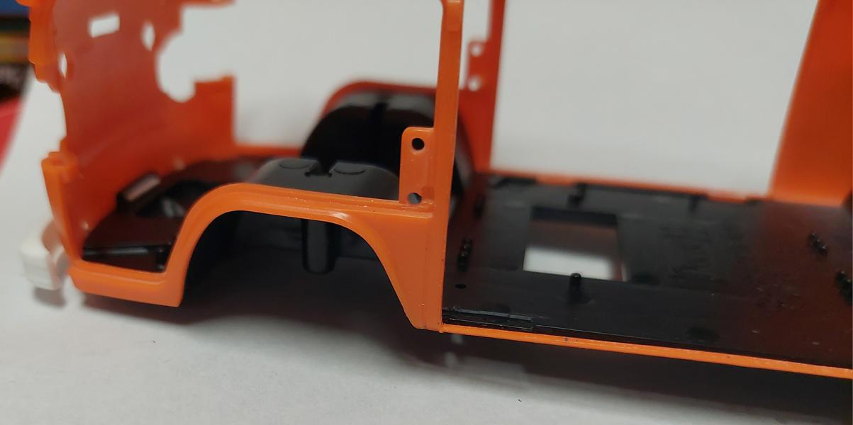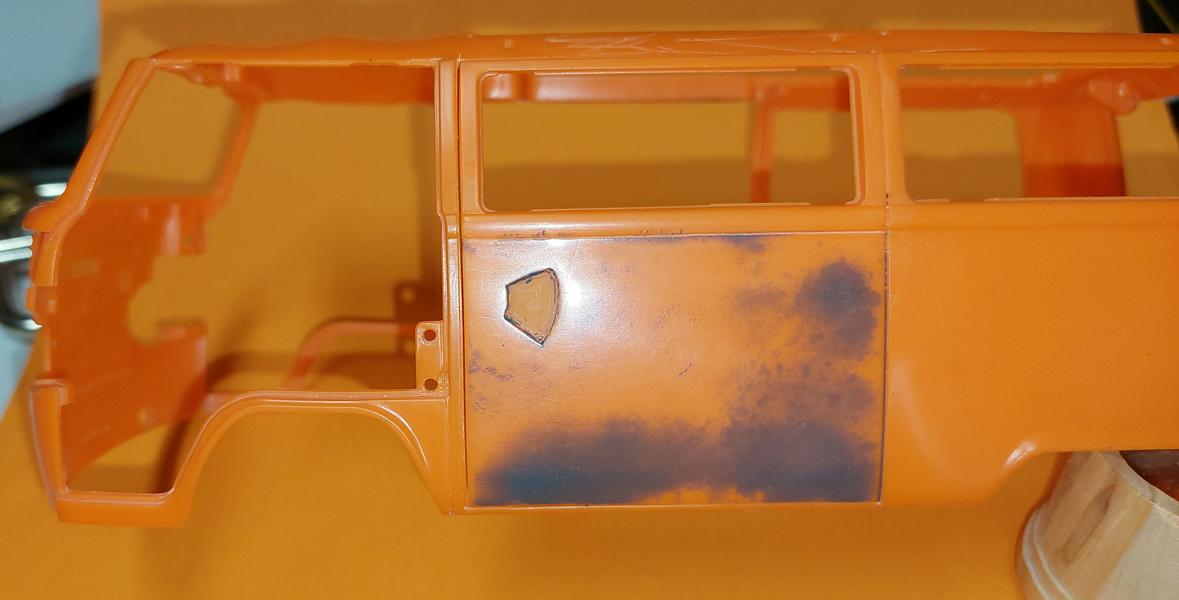 Die zweite, also die linke, Schiebetür wurde relativ simpel mit den Tamiya-Sägen herausgetrennt, "natürlich" entlang der Sicken. Unten zum Fahrzeugboden hin, ist der Steg recht dünn, und hält, wider meines Erachtens "nichts" aus, weil man die Karosserie einfach zu oft anfassen muss, um Teile anzupassen.