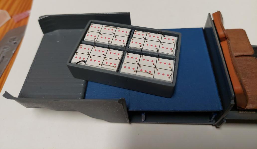 Die Verlängerung des Kofferraumbodens wurde mit einer Jalousien eines Feuerwehr Unimogs gemacht. Alles soll entnehmbar bleiben, deshalb ist das "Gegenlager" des Bodens auf Nadelköpfen gelagert und am anderen Ende sind Stützen eingesetzt. Der Belag des Bodens ist auch wieder lackiertes Krepp.